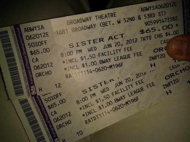 Ne vous laissez surtout pas impressionner par la foule immense qui attend. On avance plutôt vite. La preuve, le temps d’aller acheter un Coca et Marjolaine m’avait déjà perdue. Tous les spectacles ne sont pas disponibles. Seuls ceux qui ne sont pas « sold out » sont accessibles à coût réduit, mais l’échantillon reste très large. Avant de partir, nous avions fait le choix de voir « Sister Act ». Après moins d’une demie heure d’attente, nous décrochons les deux sésames ($65 l’unité, soit près de 50% de réduction).