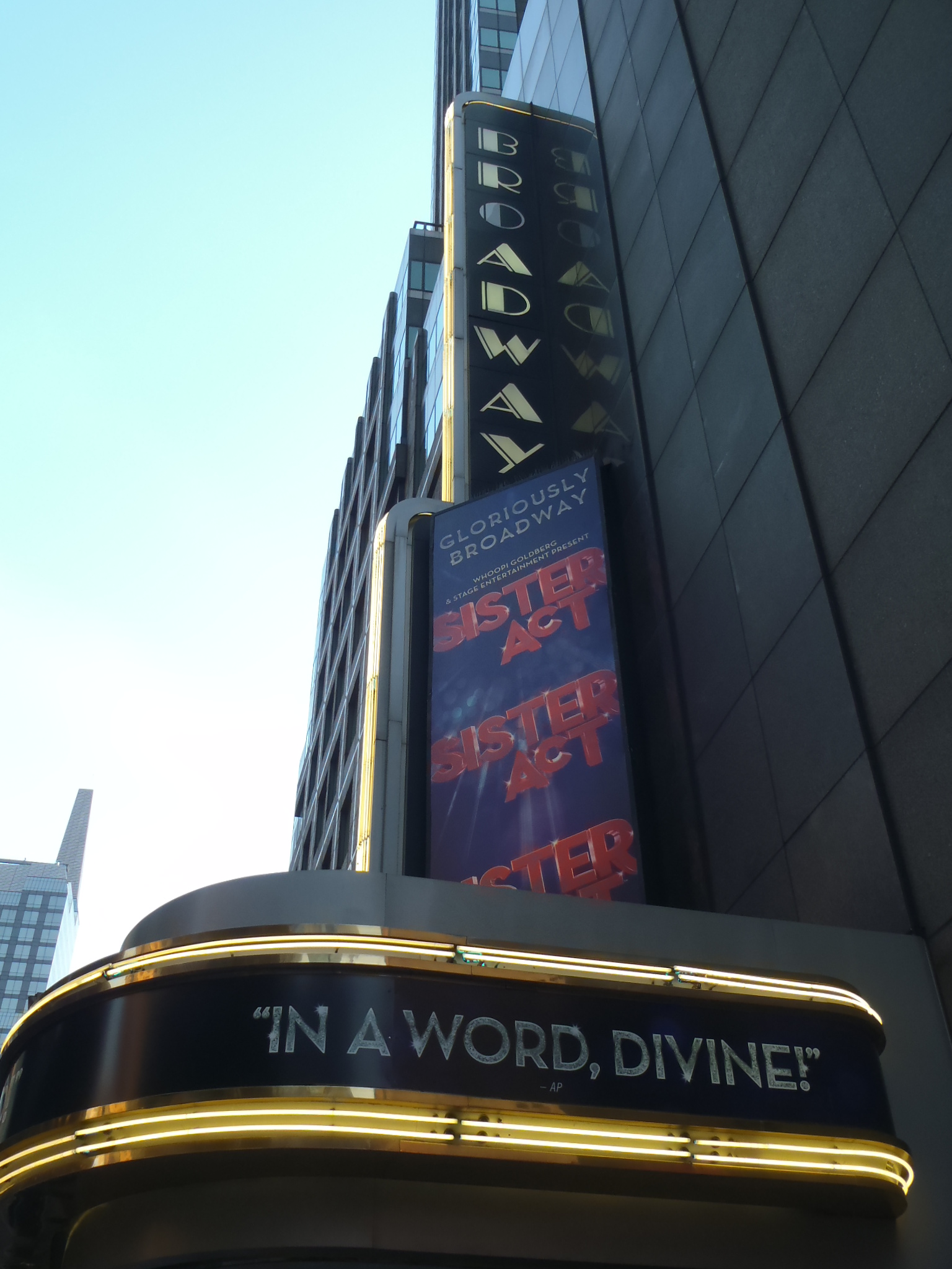 C’est à 7:30 pm que le moment tant attendu pointe son nez… Le Broadway show ! Nous prenons place aux sièges H10 et H12, situés à seulement quelques rangs de la scène. A 8:00 pm, lever de rideau et c’est parti pour deux heures d’un spectacle étourdissant. Pour la deuxième fois de la journée, nous restons bouche bée. Même Marjolaine manque de mots pour décrire cette expérience, et je peux vous dire que ça veut dire beaucoup. Chorégraphie géniale, mise en scène sublime, costumes chiadés, cast brillantissime, voix divines… On retrouve tous les ingrédients du film Sister Act, le spectacle en plus. Si votre niveau d’anglais n’est pas top, don’t worry at all. L’exercice théâtral fait que les paroles sont parfaitement audibles et à aucun moment vous n’êtes perdus. De toute façon, dès lors que les lumières s’éteignent, vous vous laissez tout simplement transporter… Quand le rideau tombe, la seule conclusion qui vient à l’esprit : » a once in a lifetime experience »…