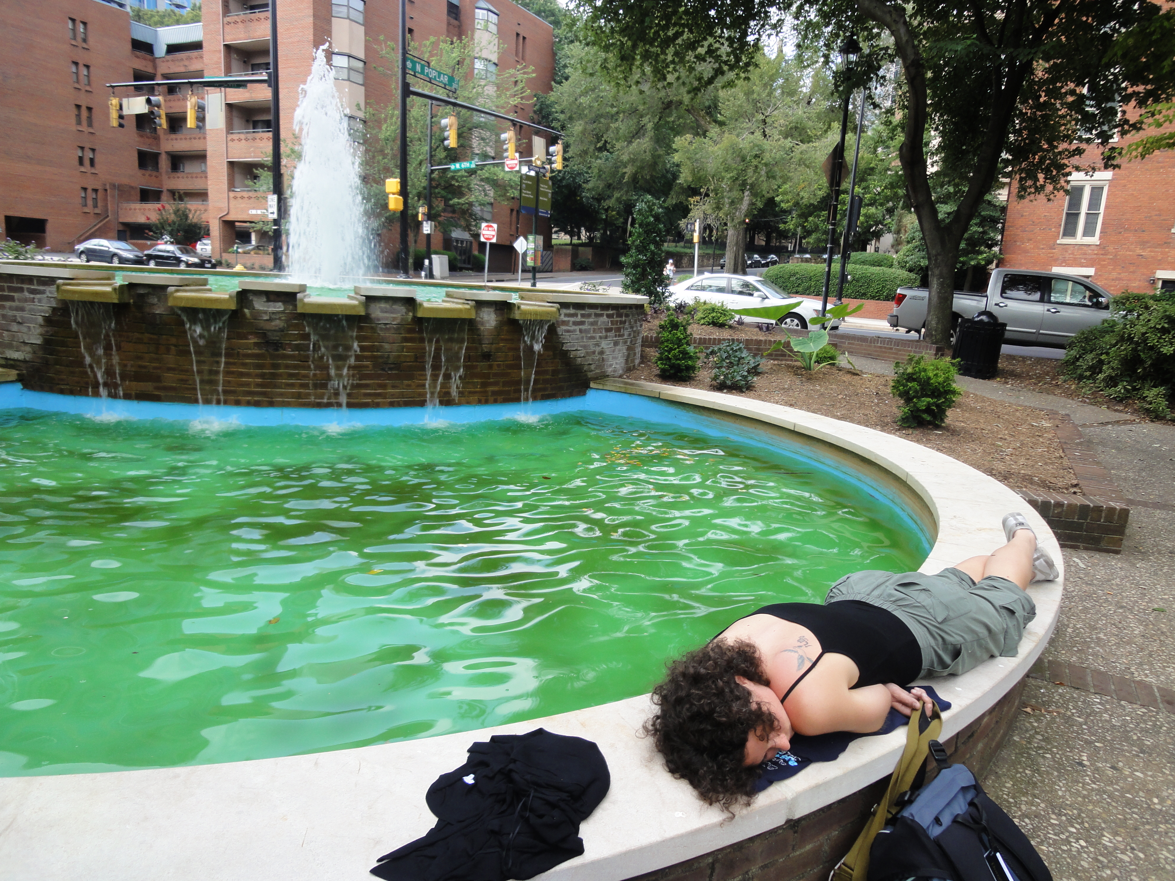 Nos pieds n’ont pas la force de déambuler beaucoup et la fontaine de Ward Park nous accueille à bras ouverts. Nous nous affalons sur les rebords et dormons, dormons, dormons…