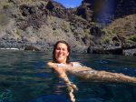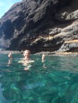 Il nous indique également qu’il vaut mieux éviter la « vraie » plage, qui a connu ces derniers jours des éboulis de rochers (un panneau affiche d’ailleurs « prohibido »). Il nous invite plutôt à rejoindre un promontoire de roches, planté au-dessus de l’océan. Nous nous y rendons immédiatement, nous sommes alors vraiment seules au monde… Et un petit plongeon s’impose ! L’eau est toujours aussi transparente et agréable pour faire le petit poisson dedans.