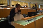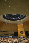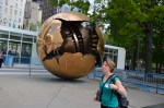 A 11h30, le guide nous récupère. Nous somme une quinzaine. Et nous circulons dans ce bâtiment rempli d’histoires, de paix et aussi, un peu, de conflit… C’est une excursion vraiment captivante. Malheureusement, en raison de la tenue de réunions, nous ne pouvons pas visiter la salle du Conseil de sécurité. Mais la salle de l’Assemblée générale nous est ouverte. 193 états sont membres de l’ONU. Les drapeaux de chacun, dans l’ordre alphabétique anglais, encerclent le bâtiment (le premier étant l’Afghanistan et le dernier, le Zimbabwe). Ici, nous sommes en territoire international, alors nous faisons tamponner nos passeports et il y a même des timbres ONU ! Le « territoire » dispose aussi de ses propres forces de police et de pompiers.