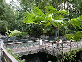Et oui, le volcan a des vertues pour ceux qui ont flairé le filon il y a une cinquantaine d’années. La ville de Fortuna jouit donc sur son artère principale d’un choix multiple où profiter des sources d’eau chaude. Notre choix s’est porté sur Eco Termales (37$). La réservation est impérative. Il y a deux créneaux pour y aller, celui du matin 10h-16h ou du soir 17h-22h. Nous avons donc opté pour la version nocturne. Le lieu dispose de cinq piscines, de 41 degrés la plus chaude à 37 degrés la plus « froide ».
