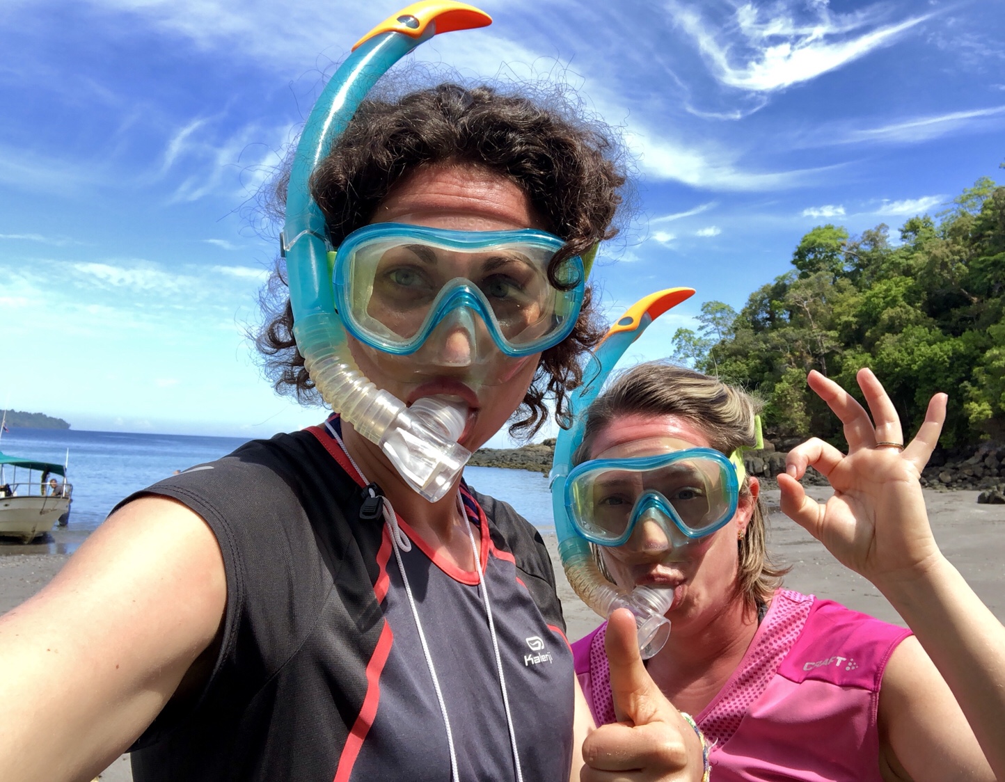 10h30 : on descend sur une plage magnifique pour s’équiper en masque, tuba et palmes. L’eau est turquoise, les fonds remplis de coraux et de beaux poissons multicolores.
