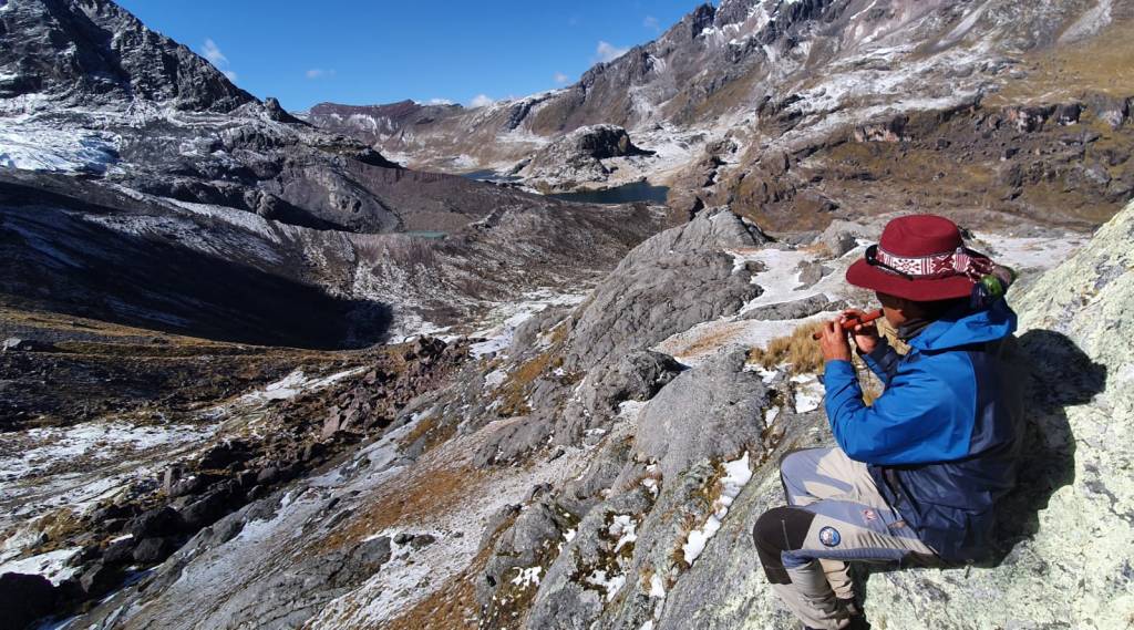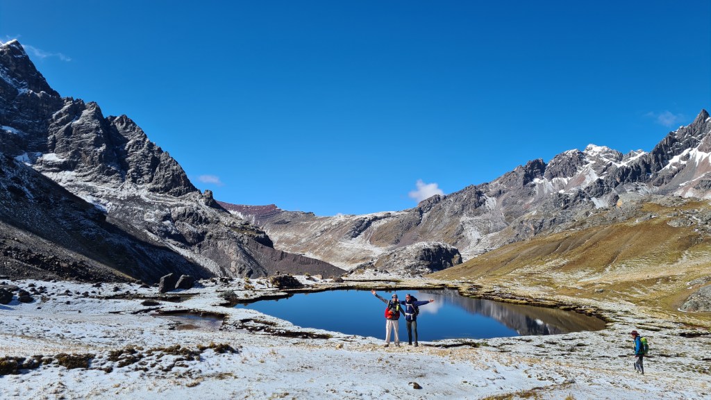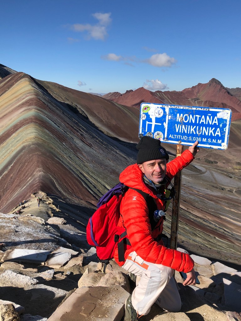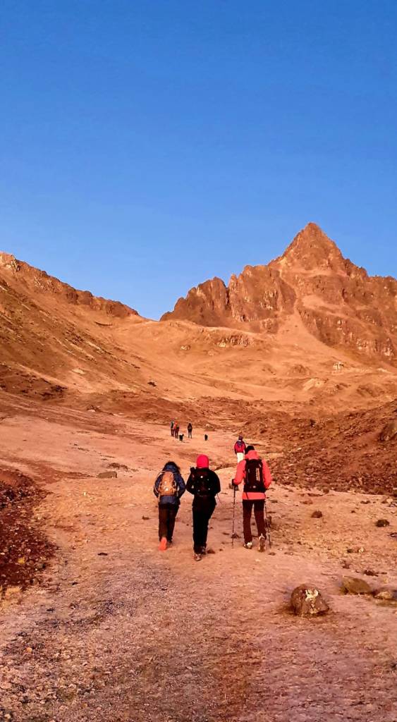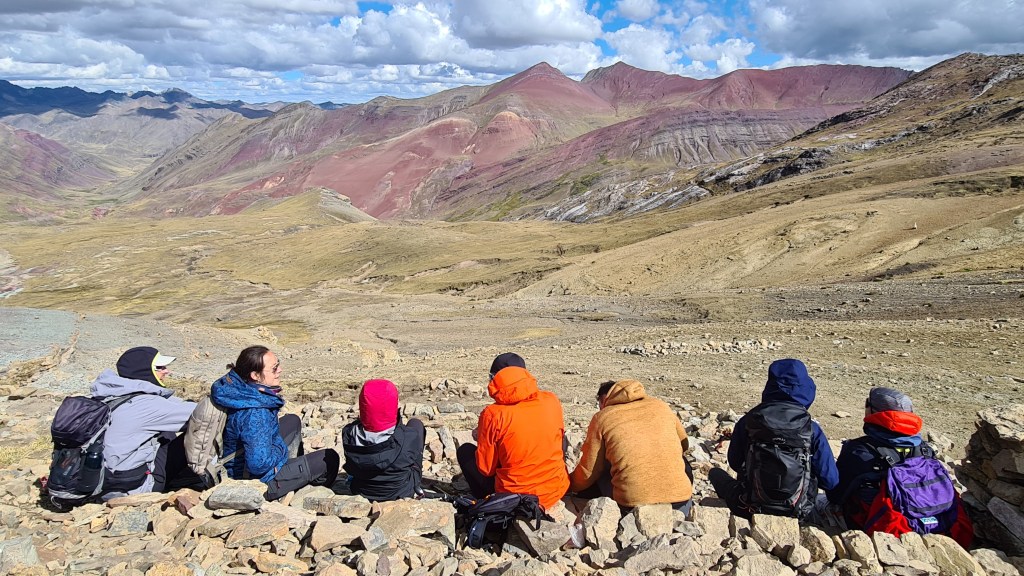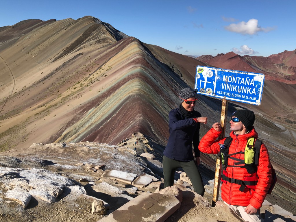 En guise de mise en bouche, le premier pass de la journée avec 400D+ et son 4 985m d’altitude qui nous fait basculer vers le lac Kayrawiri puis le glacier Cerro Grande Laya. Le cœur pompe vite mais nous semblons acclimatés. Ça tombe bien parce que la difficulté suivante c’est notre premier 5 000 à tous. 5 036 m pour être précise afin d’atteindre la montaña Vinikunka. À la clé, une vue à couper le souffle sur la montagne des 7 couleurs, formée il y a des millions d’années dont ses couleurs proviennent de la compression de minéraux et du mouvement des plaques tectoniques ! À cette heure-ci, à peine 8 heures, nous sommes presque seuls au monde, un moment unique !