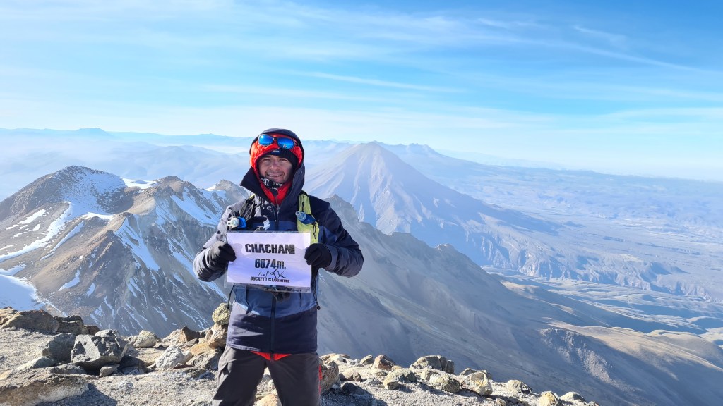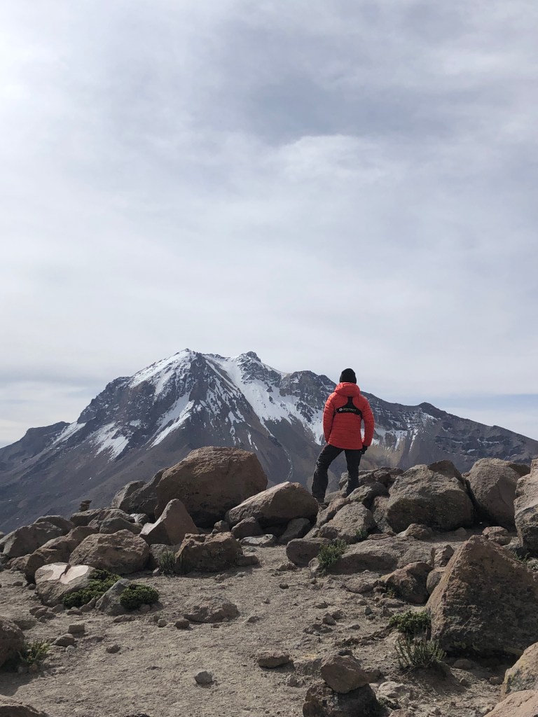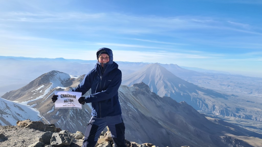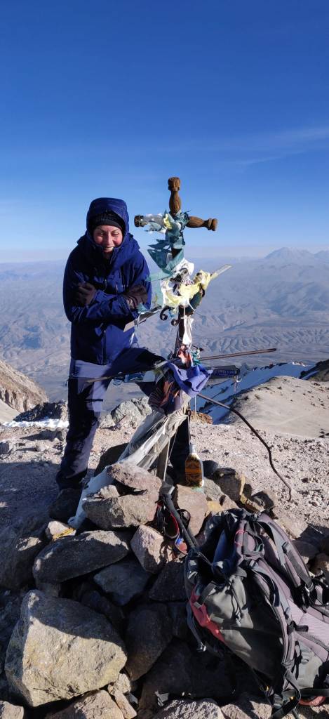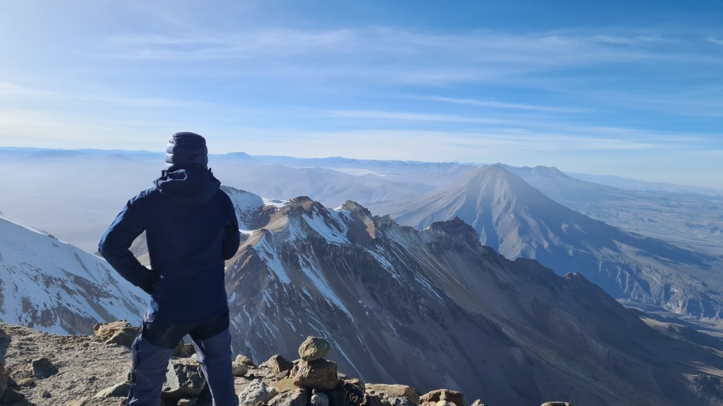 Finalement, nous mettrons 3h54 pour tutoyer les 6 074m – dont près de deux heures dans la nuit noire – qui nous livrent une vue magnifique sur le Misti et les volcans alentours. Les 200 derniers mètres de dénivelé nous semblent interminables. Le chemin est escarpé, il y a de la neige gelée. Au sommet, nous immortalisons notre exploit rapidement car le froid nous paralyse. Et, en un glissement de seconde, j’oublie presque tout et je me dis que ça valait vraiment le coup !