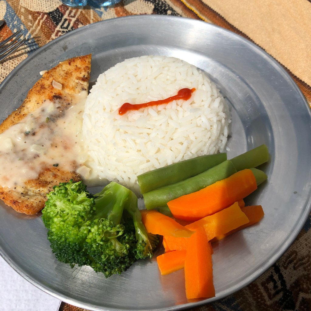 Pour le dîner, plus de tente non plus mais une « salle à manger ». Bref, on est entre quatre murs !