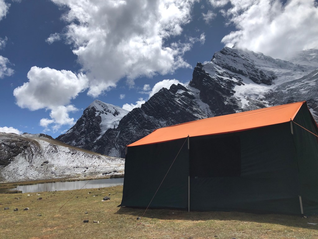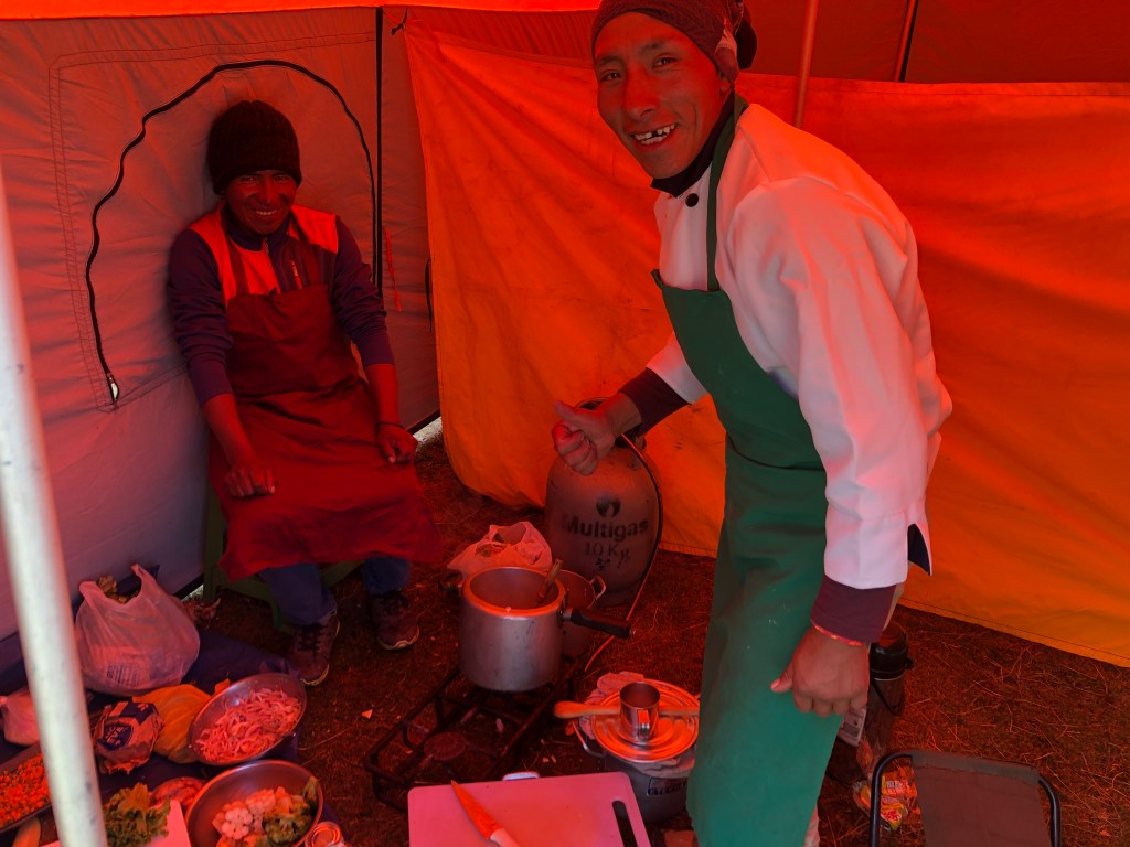 Quand nous atteignons notre campement, nous sommes à 4 400 m d’altitude, tout juste de quoi finaliser notre acclimatation. Sous un ciel capricieux, nous regardons nos guides avec mules monter les tentes, préparer le dîner…