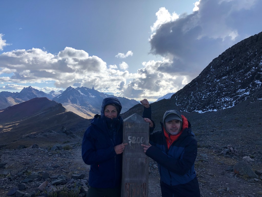 Le groupe choisit de le franchir dès cet après-midi alors comme dirait Cirilo, « c’est parti mon quiqui » ! Il estime entre 1h20 et 1h30 de marche. Je me cale à nouveau sur ma musique et je me crée une cadence de suivi, un « toc » si vous voulez : j’attends la fin d’une chanson et le début de la suivante pour checker où j’en suis du dénivelé. Il monte très très doucement. Il me faudra 16 chansons pour arriver au sommet à 5 200m. Ou peut-être était-ce 17 ou 18. Pour ma défense, à plus de 5 000, on perd 50% d’oxygène ! Il m’aura fallu 48’34 pour franchir le panneau, juste sur les talons de Regis. Dire qu’il trouve toujours que je ne pousse pas assez sur les pédales à vélo !
