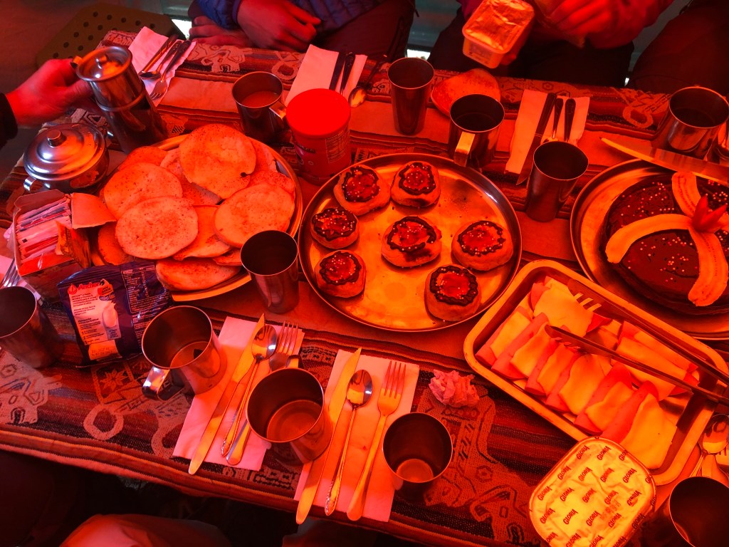 Ensuite, c’est roulant descendant jusqu’au camp où nous attend un autre délicieux repas. Ce midi, le chef a carrément fait un gâteau pour le dessert ! Je suis impressionnée par leurs prouesses culinaires à plus de 4 500 m d’altitude !