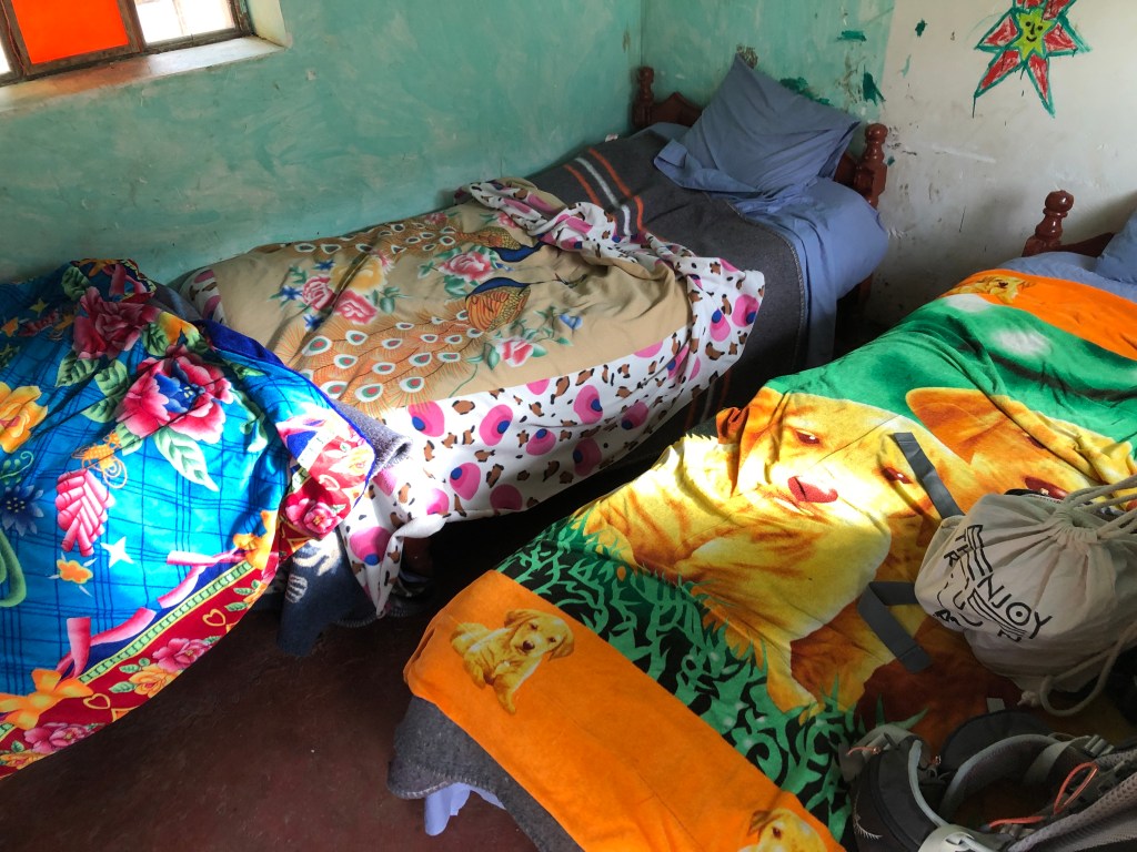 Ce soir, pas de tente, des mini maisons primaires soit 4 murs et des lits posés à l’intérieur.