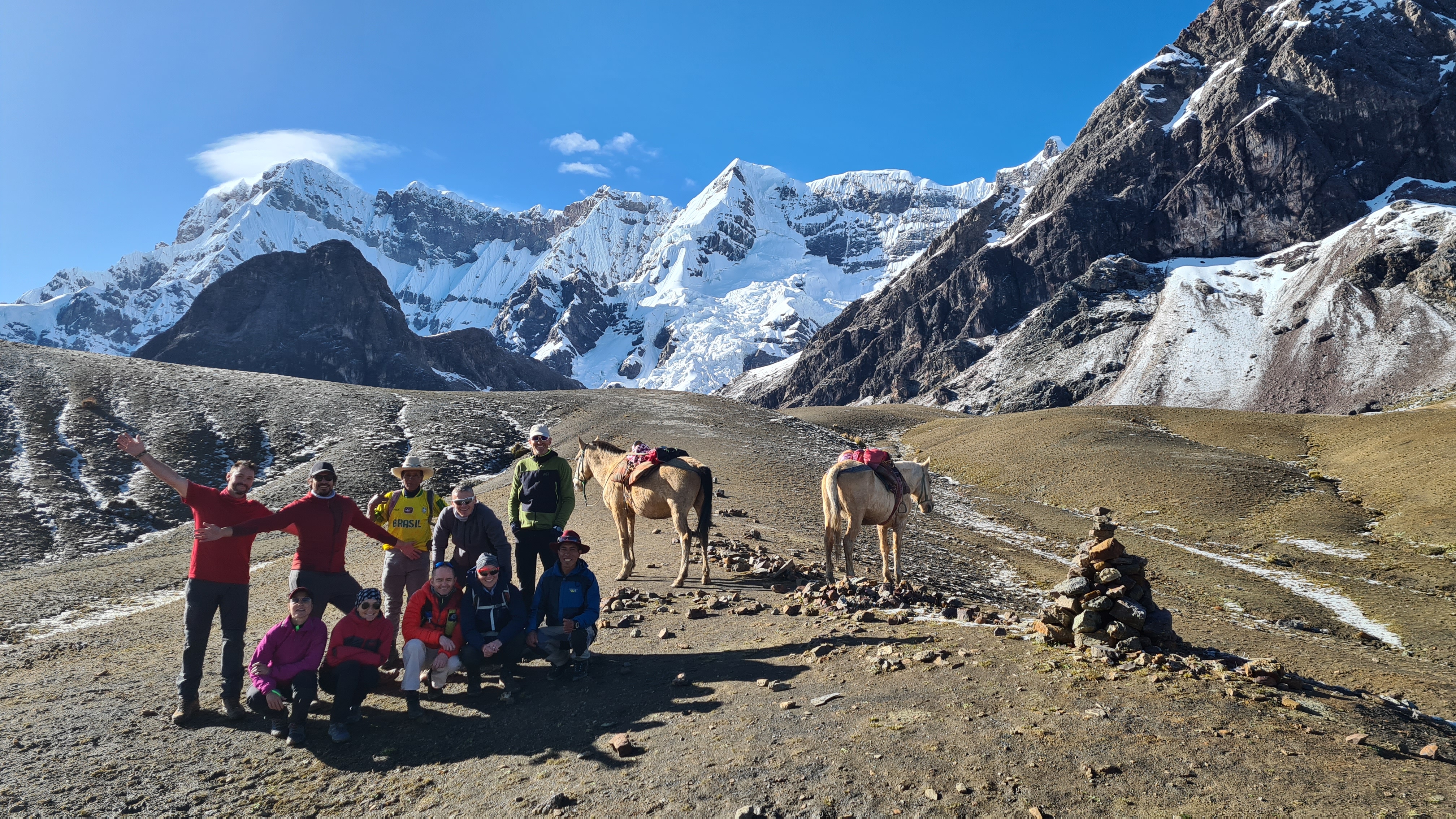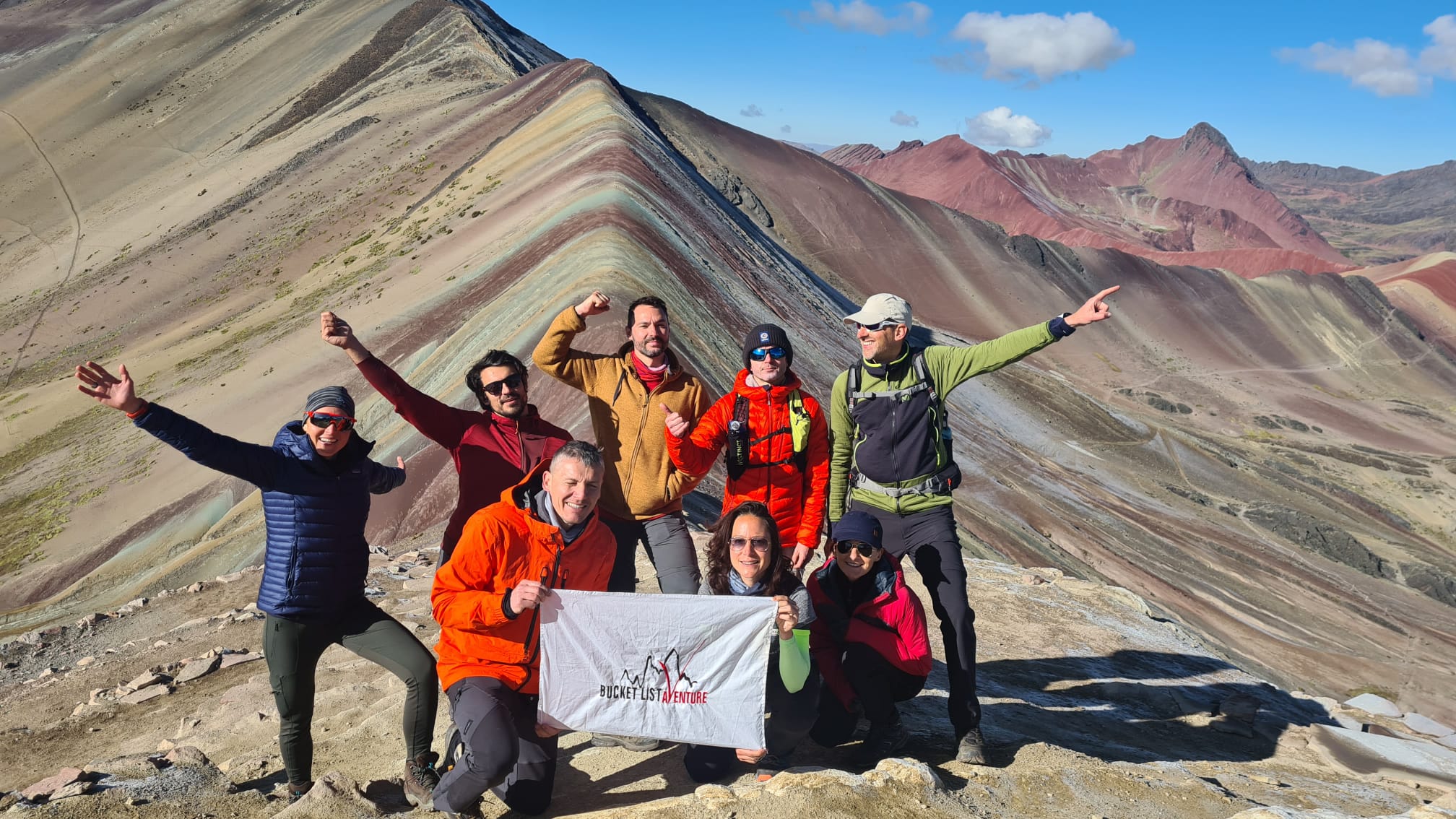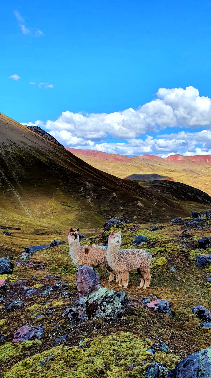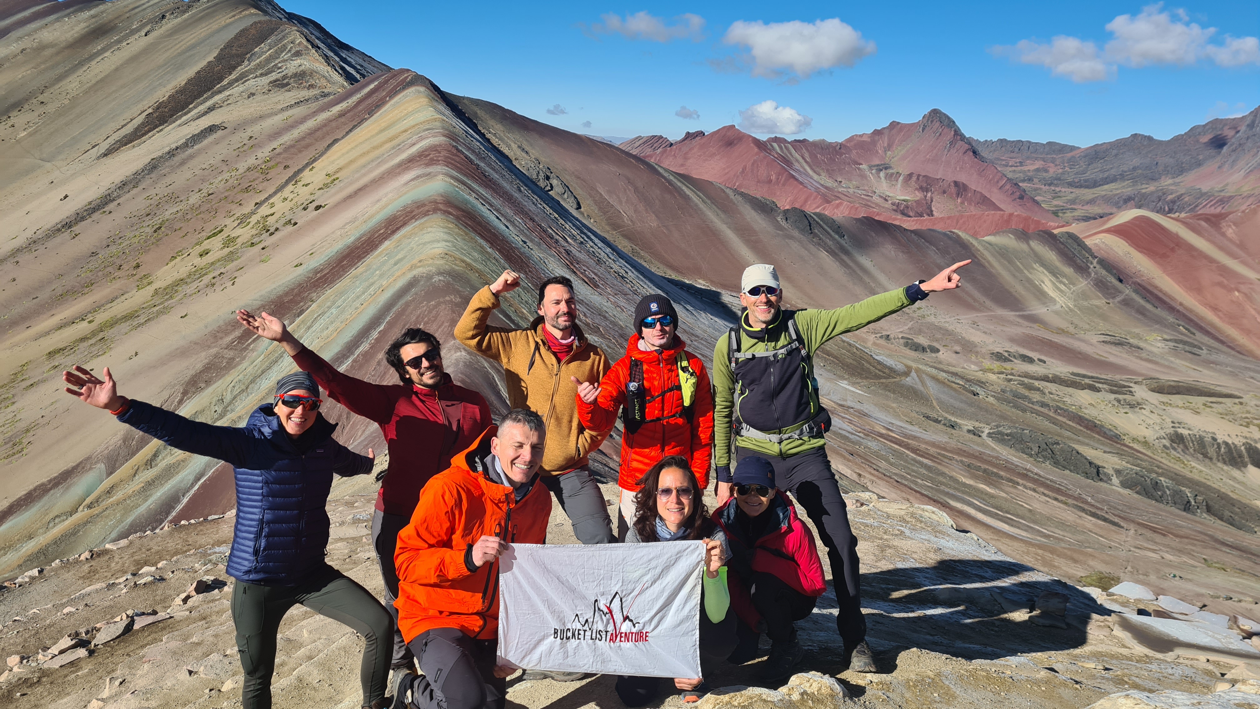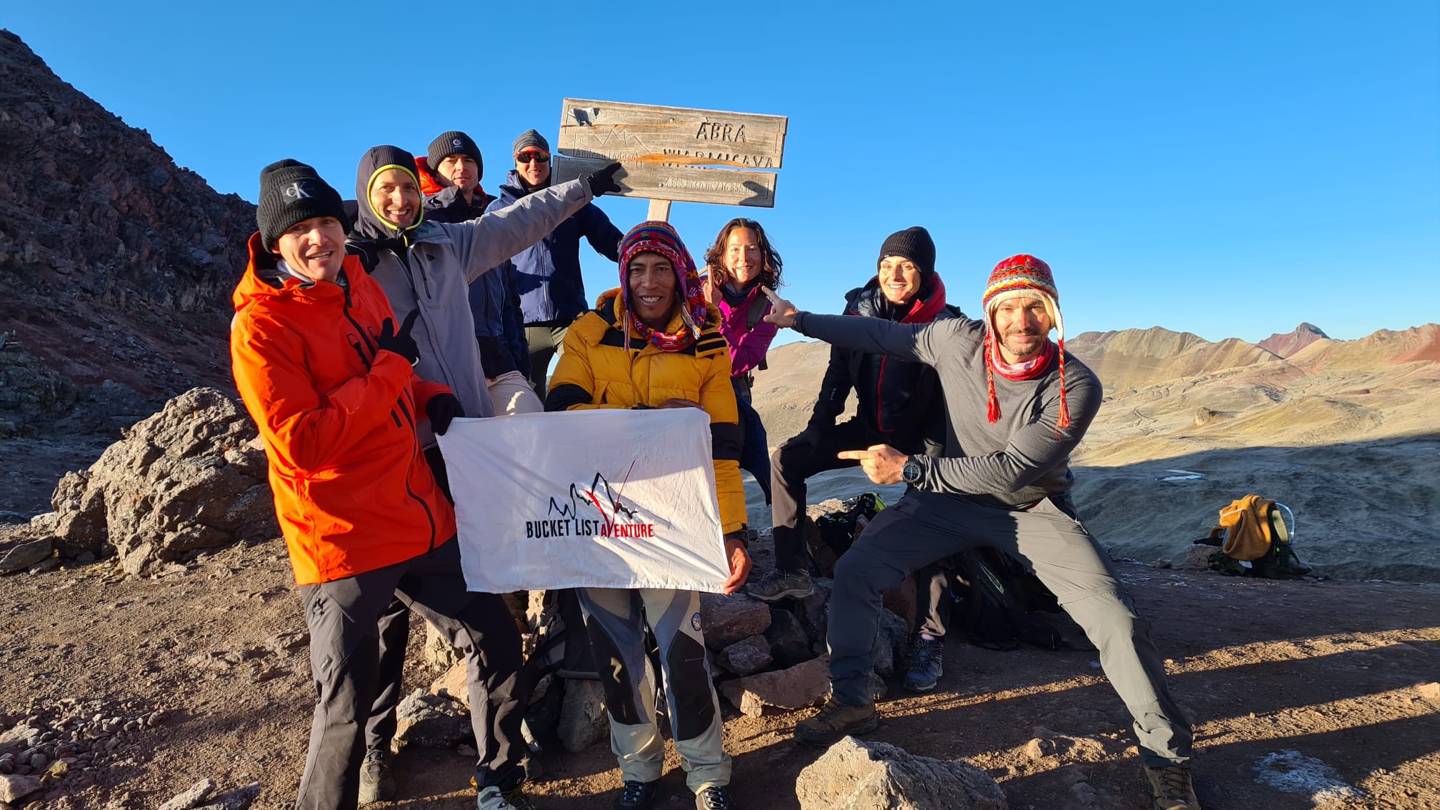 En guise de mise en bouche, le premier pass de la journée avec 400D+ et son 4 985m d’altitude qui nous fait basculer vers le lac Kayrawiri puis le glacier Cerro Grande Laya. Le cœur pompe vite mais nous semblons acclimatés. Ça tombe bien parce que la difficulté suivante c’est notre premier 5 000 à tous. 5 036 m pour être précise afin d’atteindre la montaña Vinikunka. À la clé, une vue à couper le souffle sur la montagne des 7 couleurs, formée il y a des millions d’années dont ses couleurs proviennent de la compression de minéraux et du mouvement des plaques tectoniques ! À cette heure-ci, à peine 8 heures, nous sommes presque seuls au monde, un moment unique !