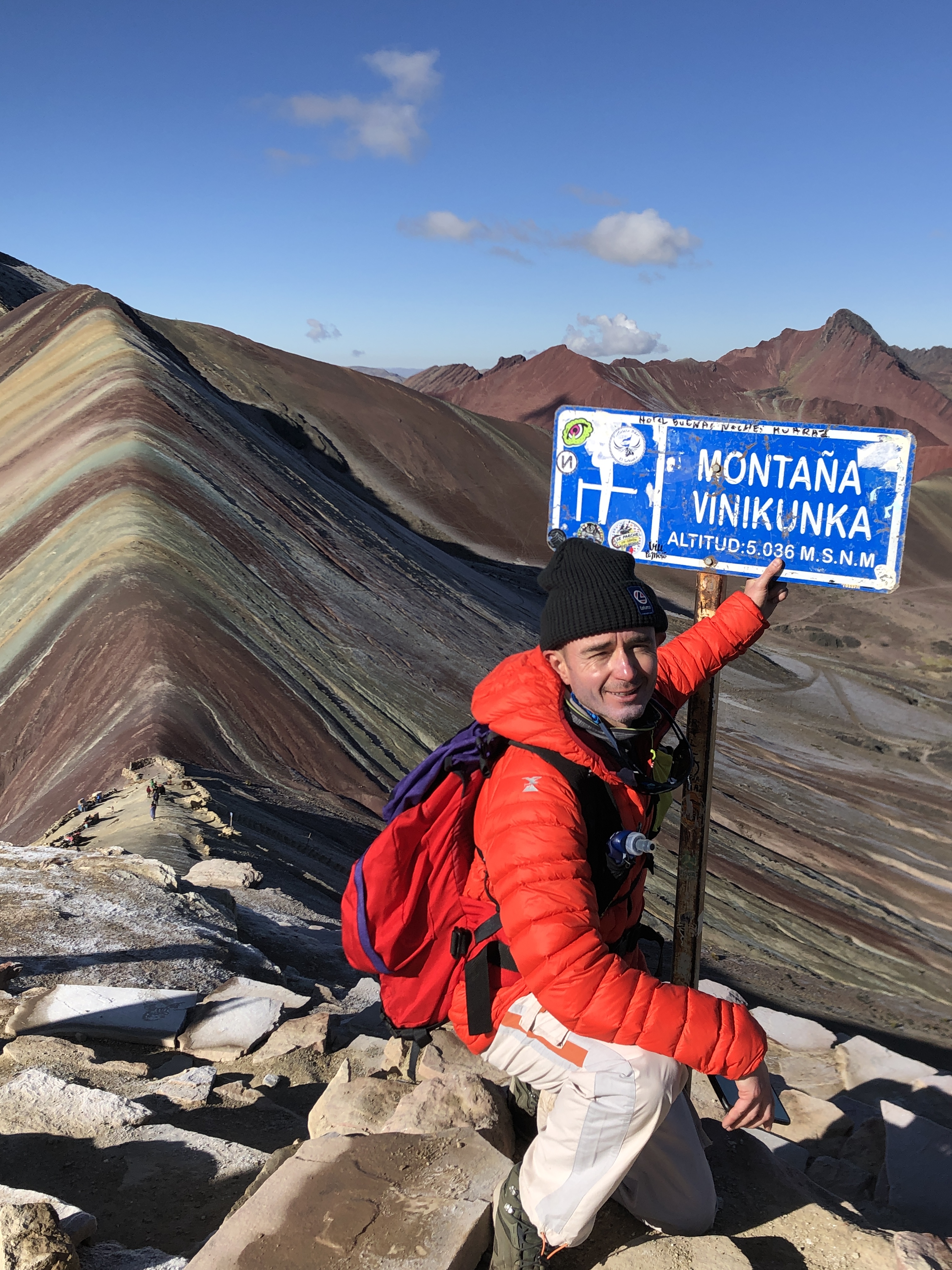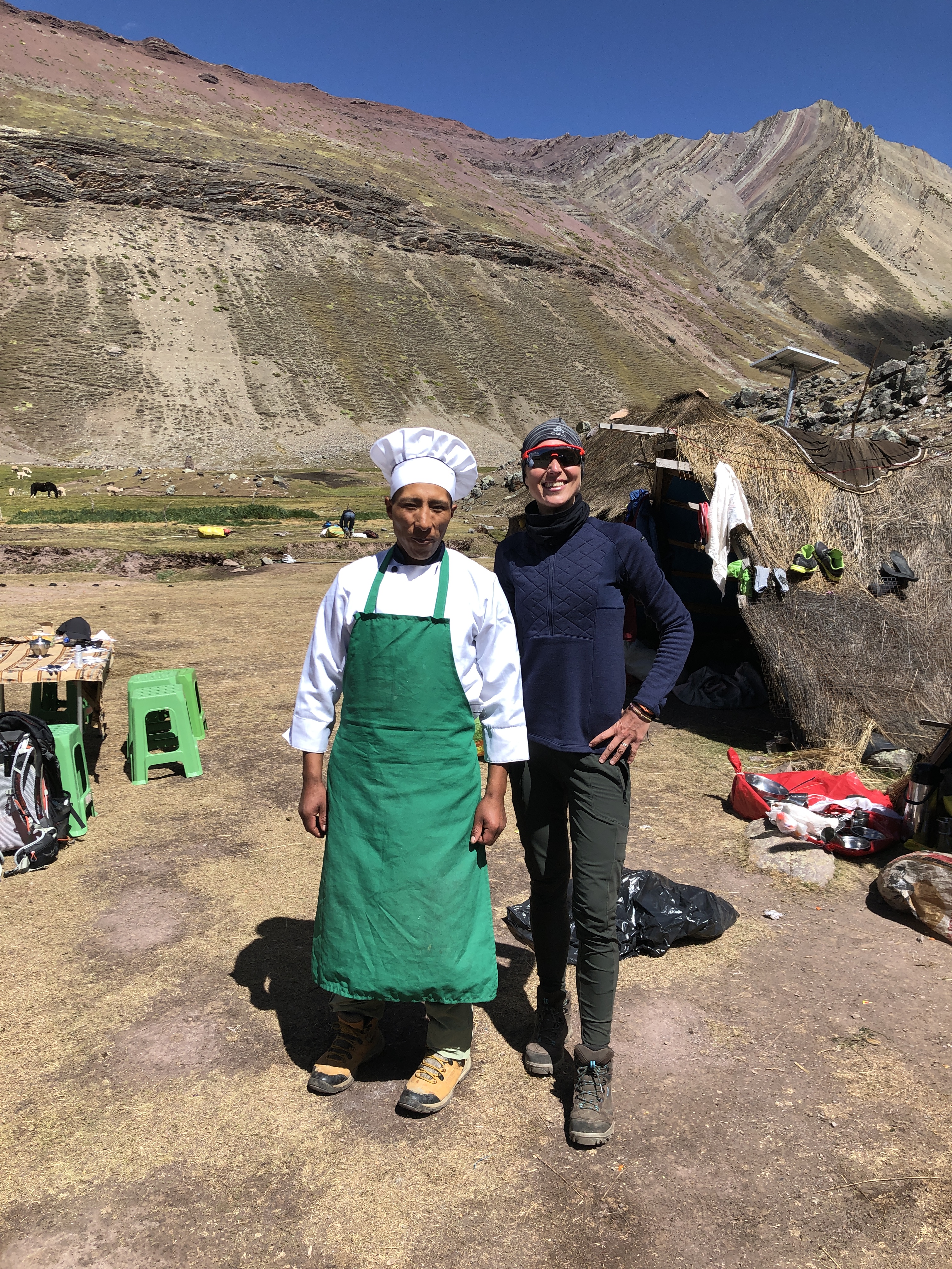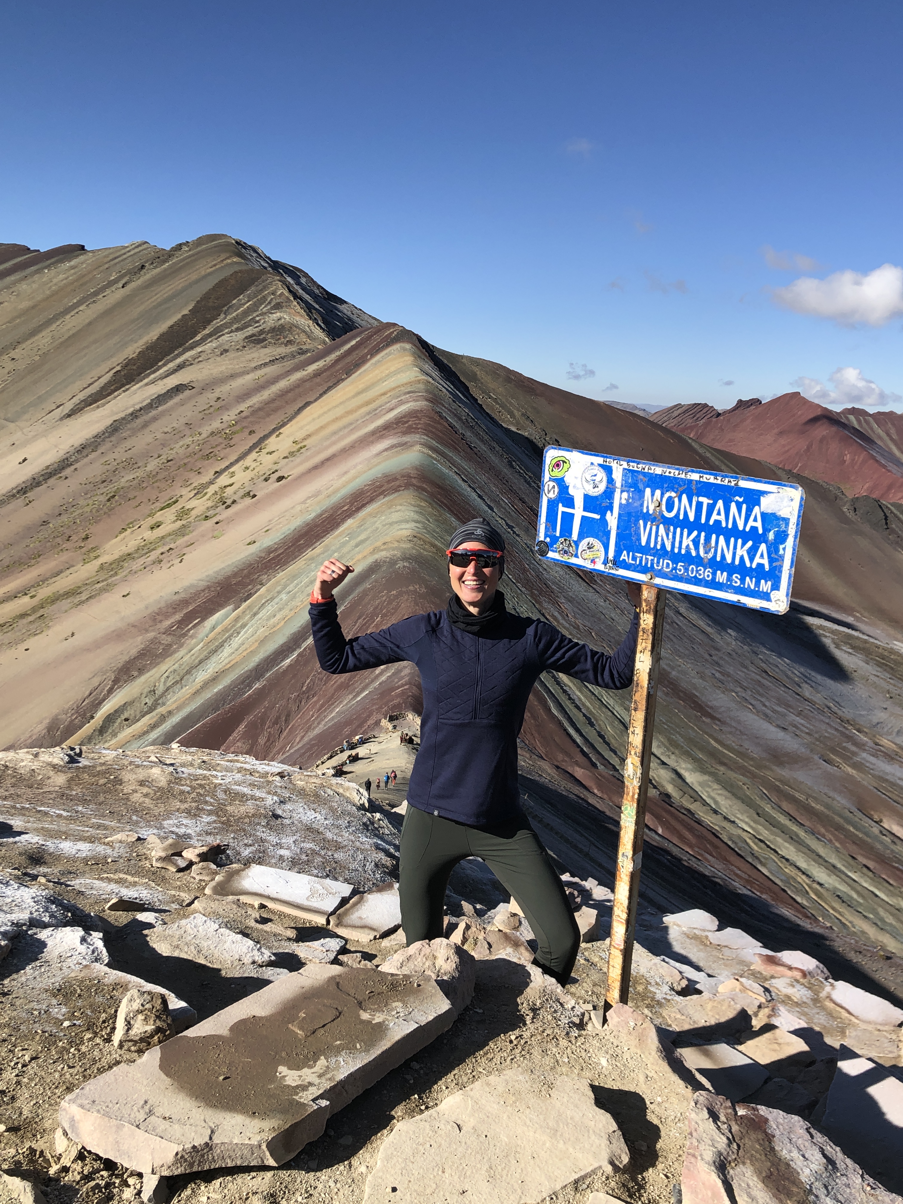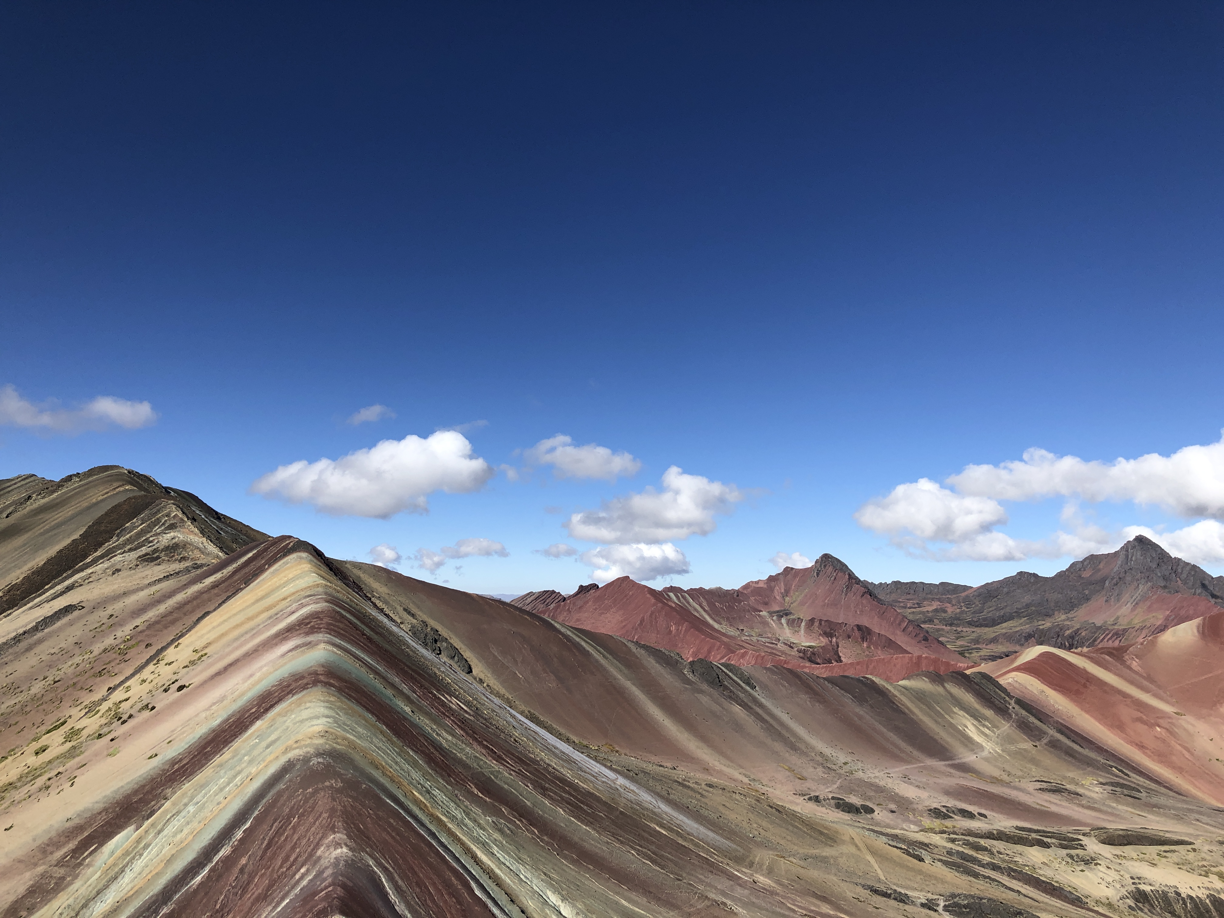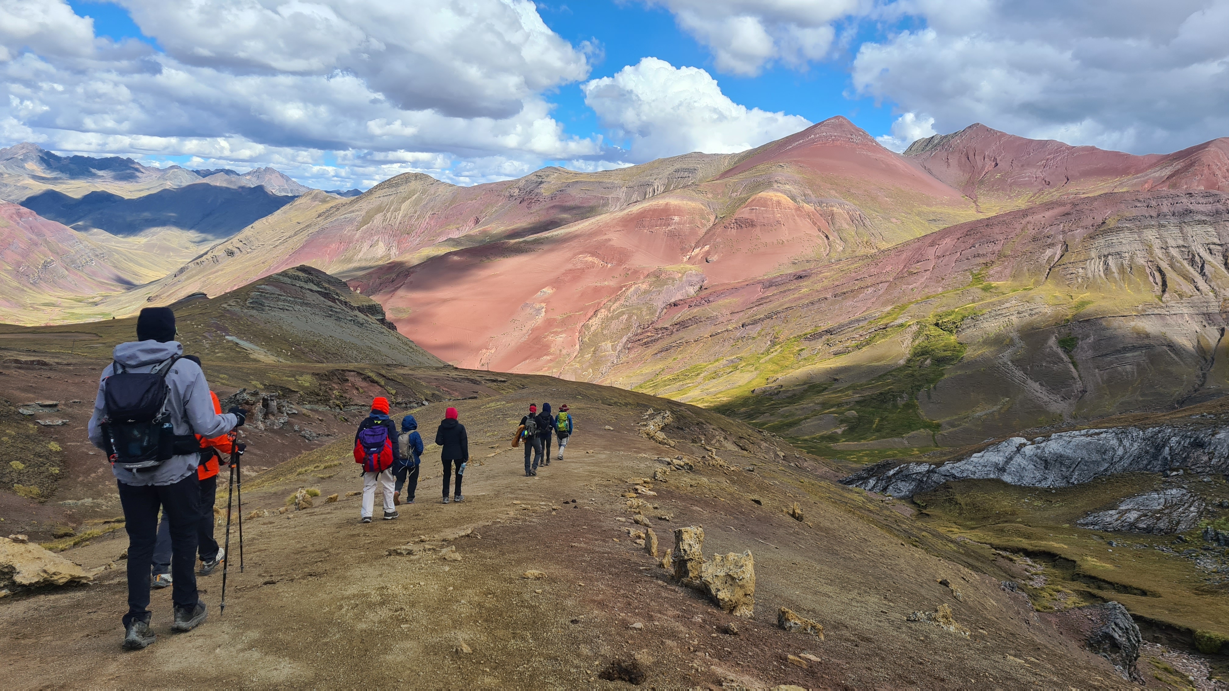 En guise de mise en bouche, le premier pass de la journée avec 400D+ et son 4 985m d’altitude qui nous fait basculer vers le lac Kayrawiri puis le glacier Cerro Grande Laya. Le cœur pompe vite mais nous semblons acclimatés. Ça tombe bien parce que la difficulté suivante c’est notre premier 5 000 à tous. 5 036 m pour être précise afin d’atteindre la montaña Vinikunka. À la clé, une vue à couper le souffle sur la montagne des 7 couleurs, formée il y a des millions d’années dont ses couleurs proviennent de la compression de minéraux et du mouvement des plaques tectoniques ! À cette heure-ci, à peine 8 heures, nous sommes presque seuls au monde, un moment unique !
