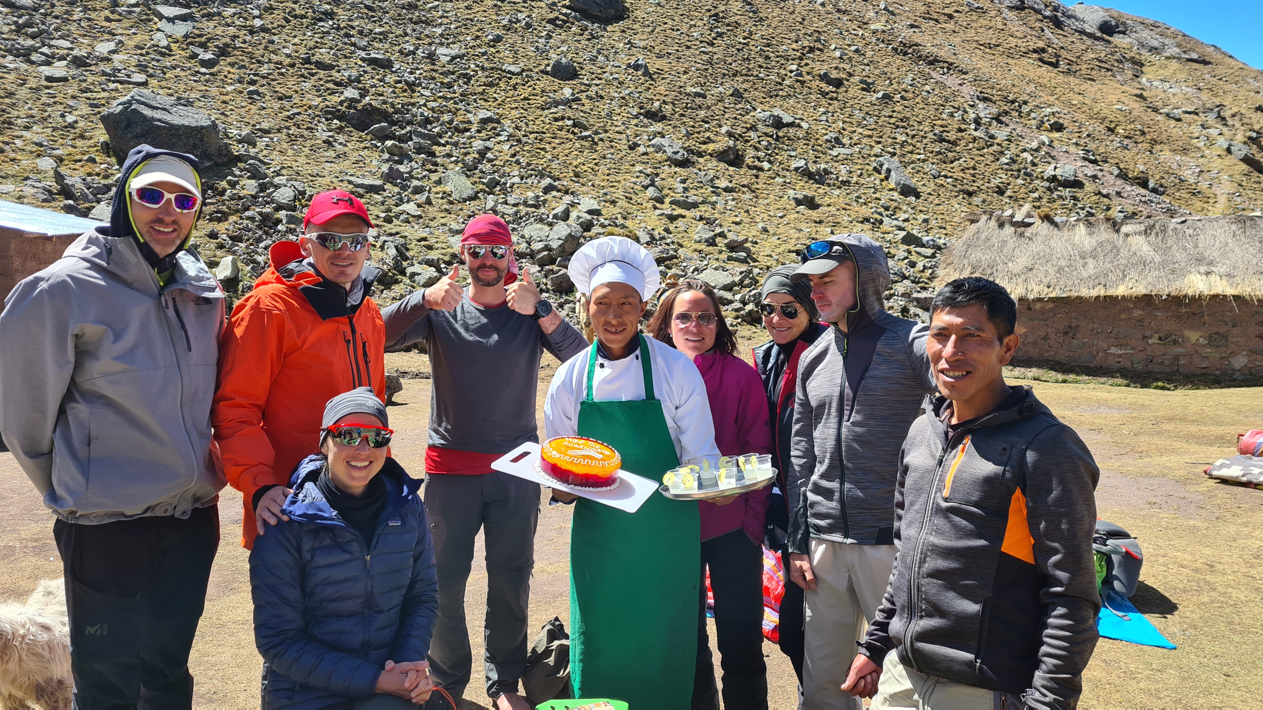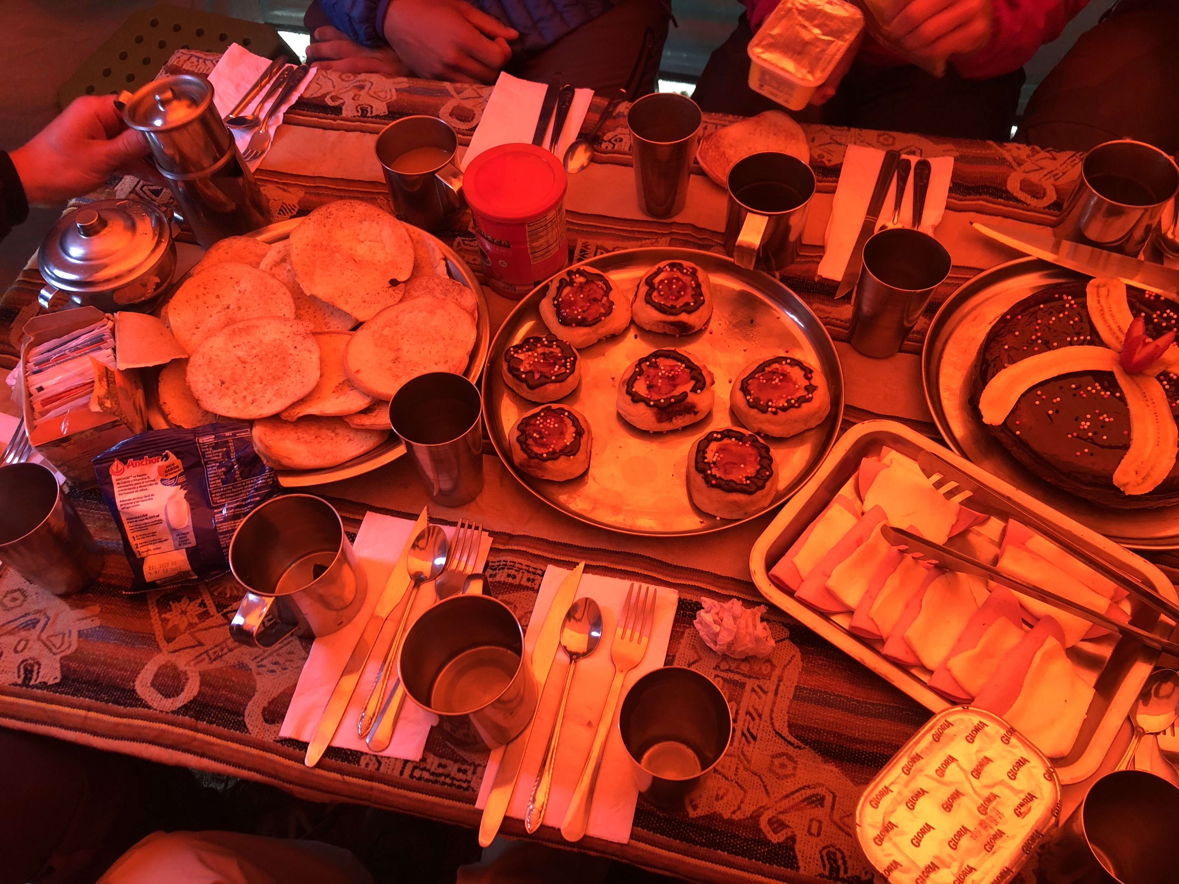 Ensuite, c’est roulant descendant jusqu’au camp où nous attend un autre délicieux repas. Ce midi, le chef a carrément fait un gâteau pour le dessert ! Je suis impressionnée par leurs prouesses culinaires à plus de 4 500 m d’altitude !