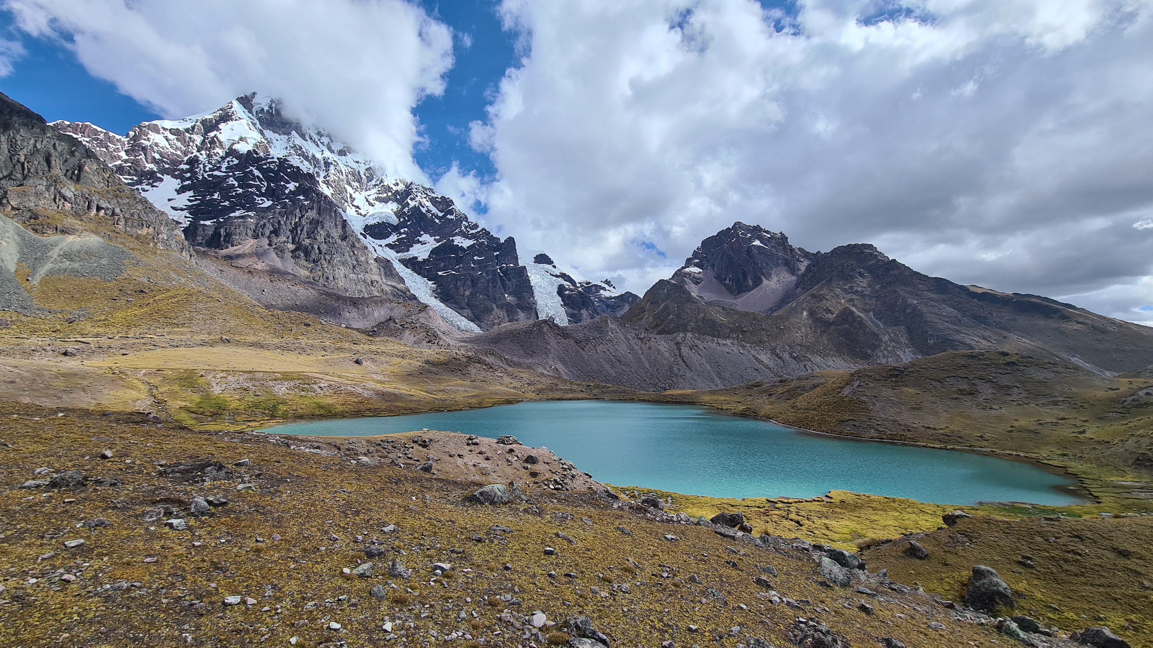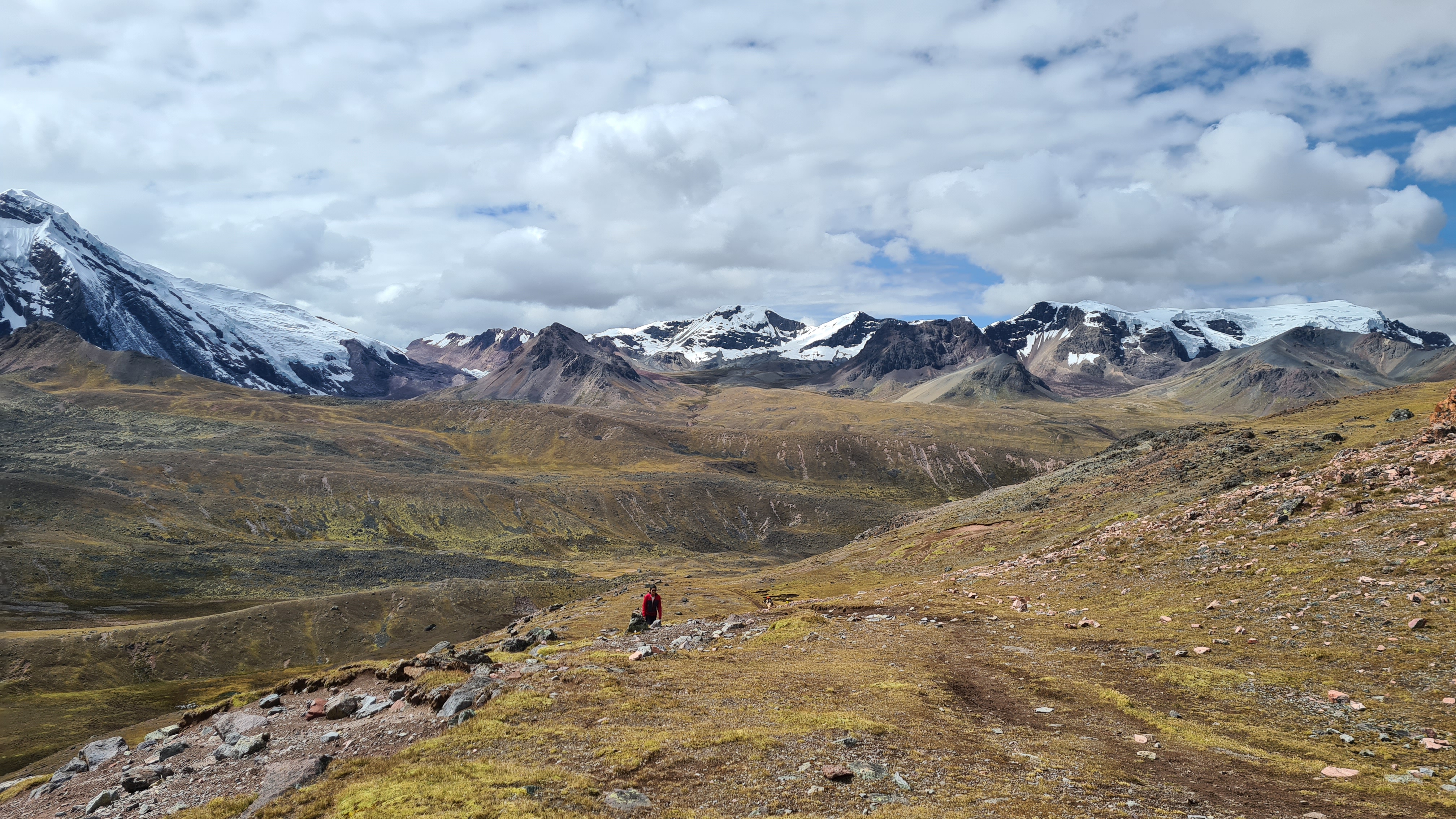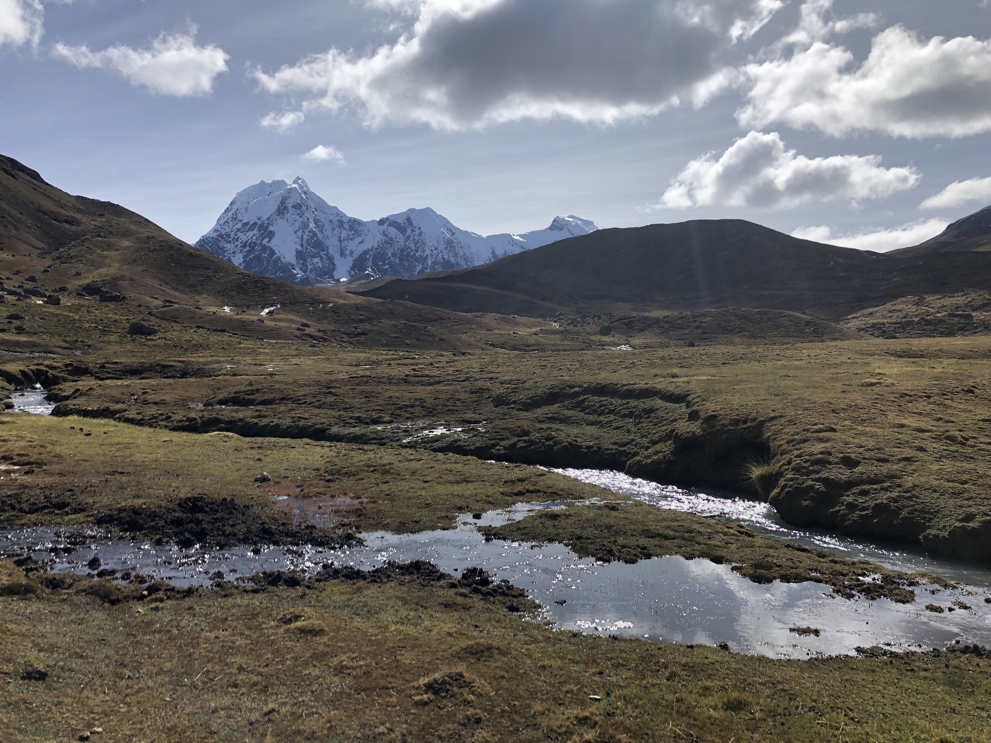 Au programme du jour : un dernier pass à 5100m, le Jampa Pass après avoir marché dans le décor des glaciers Tres Picos et Puca Punta. Pour le franchir, 5km d’ascension et 445m de D+. Il me faudra un peu plus d’1h18 pour en venir à bout, toujours en me calant sur les pas de Cirilo. J’ai aussi repris ma routine musicale : je regarde mon avancée sur la montre seulement quand une chanson se termine et la suivante se déclenche. Cette fois, je ne compte pas le nombre de morceaux en revanche. Il y en aurait trop !