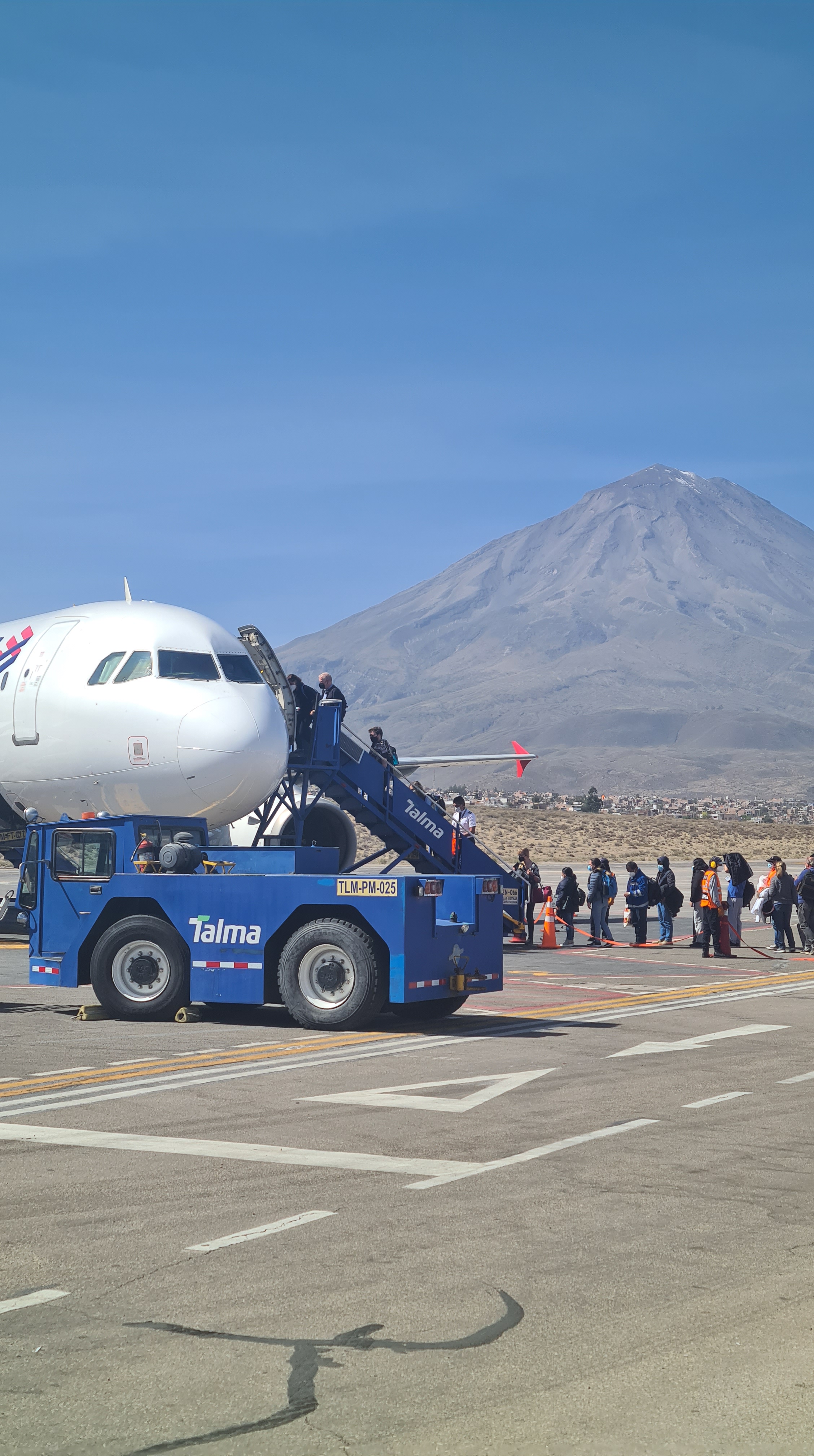 Adios Cusco ! Ce matin, nous embarquons à nouveau avec la compagnie aérienne Latam pour la dernière étape de notre voyage : Arequipa, au pied des volcans Misti et Chachani, dans les Andes péruviennes. 300 jours de soleil par an paraît-il. En tout cas, il est bien présent quand nous nous posons sur le tarmac.