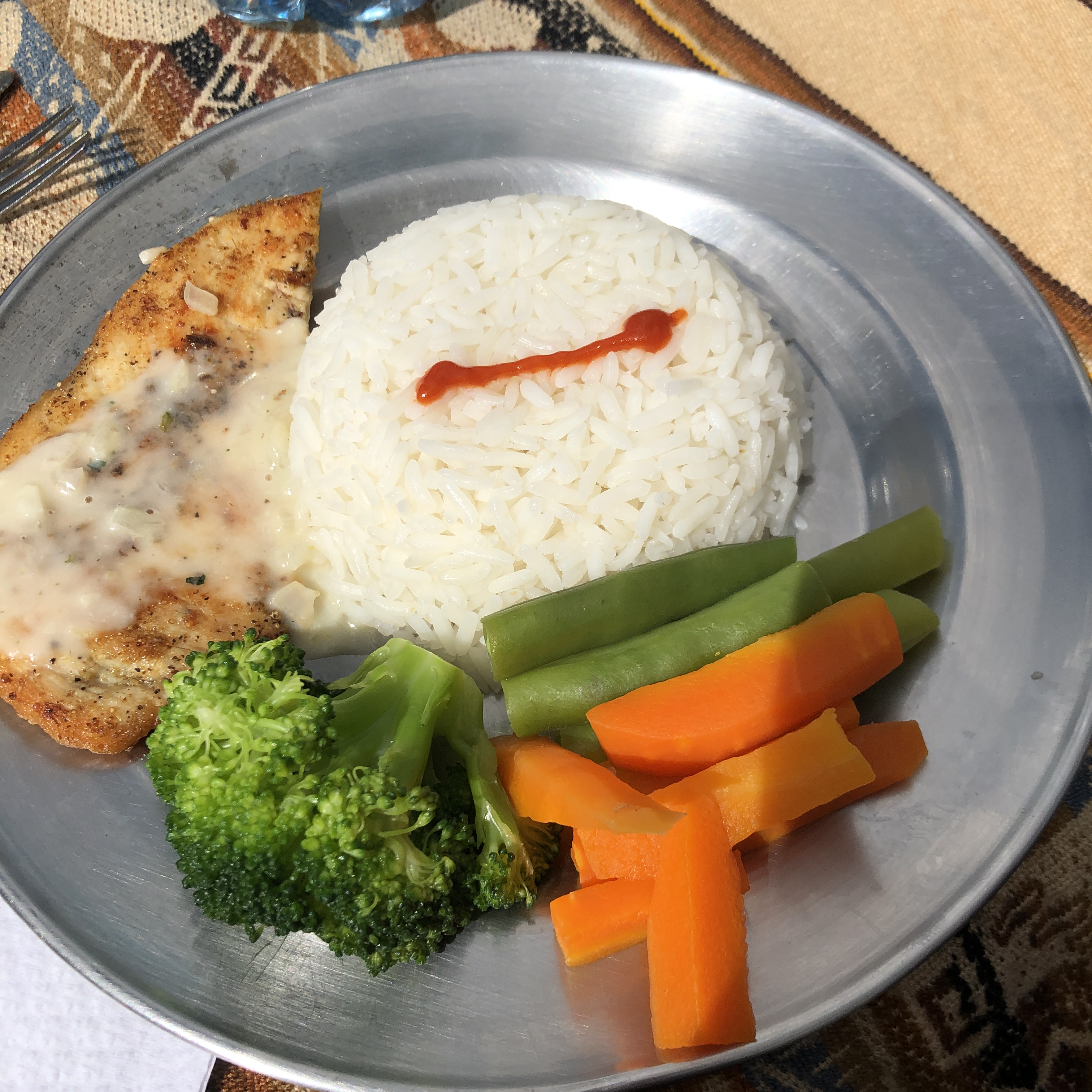 Pour le dîner, plus de tente non plus mais une « salle à manger ». Bref, on est entre quatre murs !