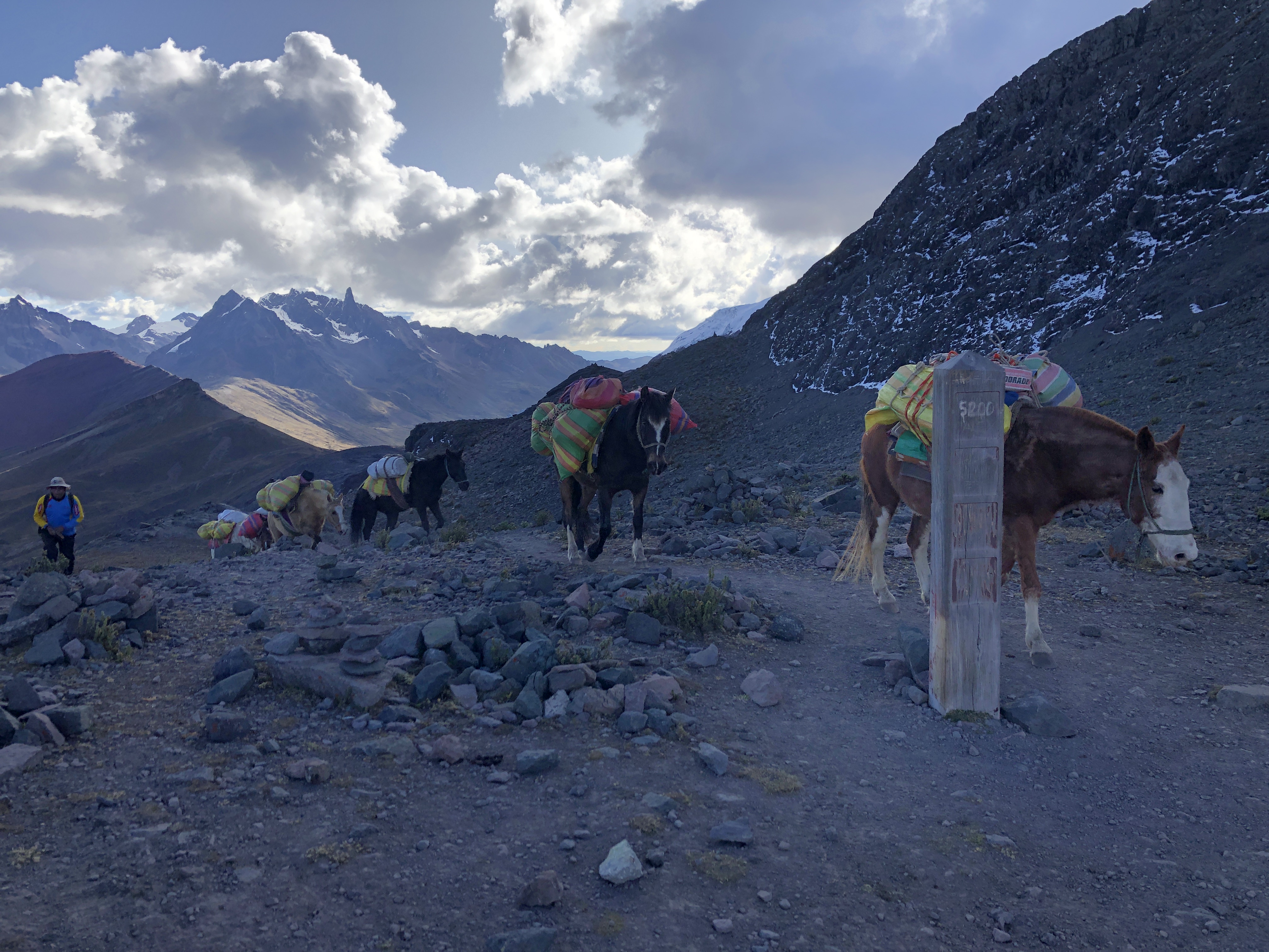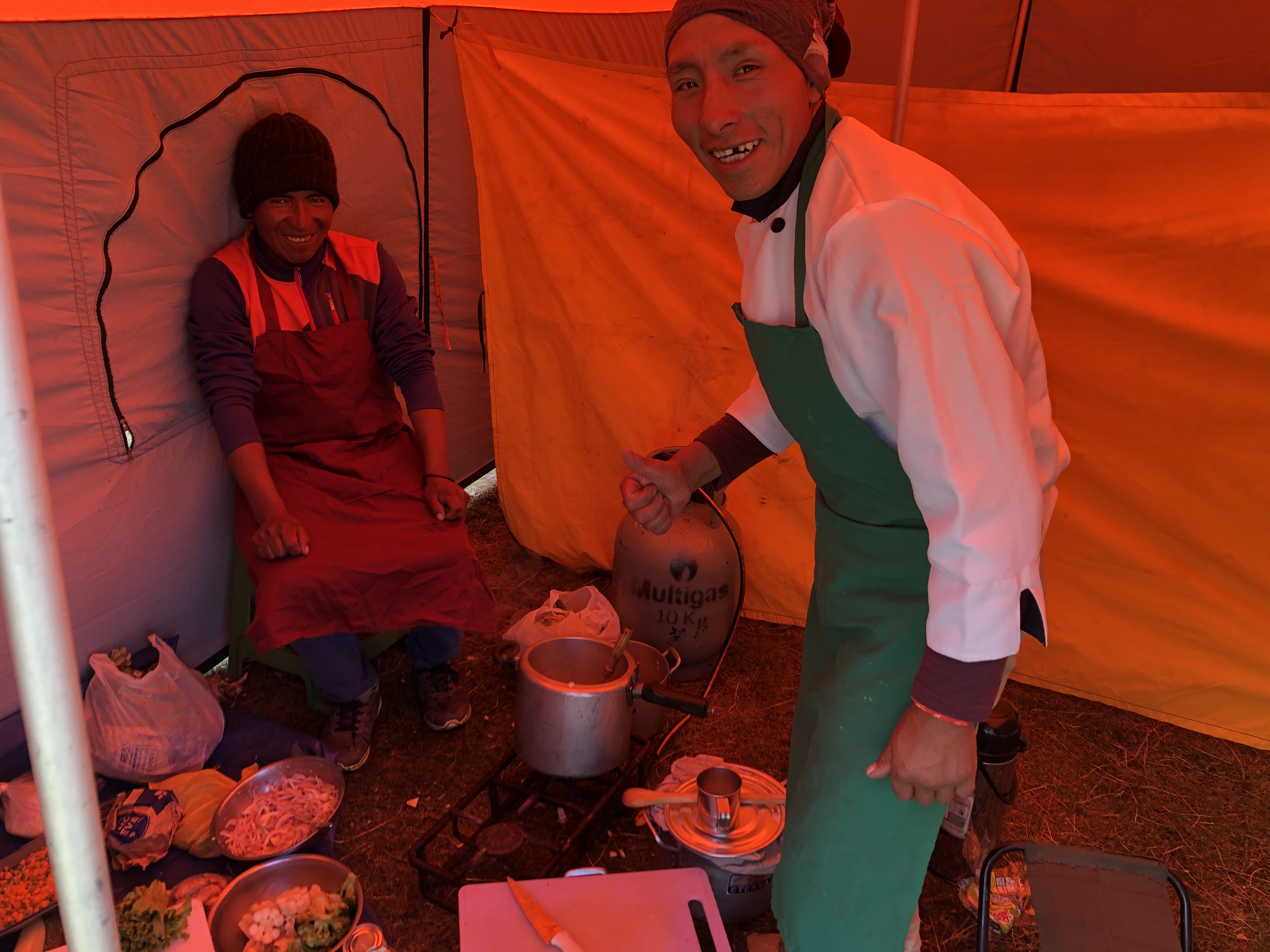Quand nous atteignons notre campement, nous sommes à 4 400 m d’altitude, tout juste de quoi finaliser notre acclimatation. Sous un ciel capricieux, nous regardons nos guides avec mules monter les tentes, préparer le dîner…