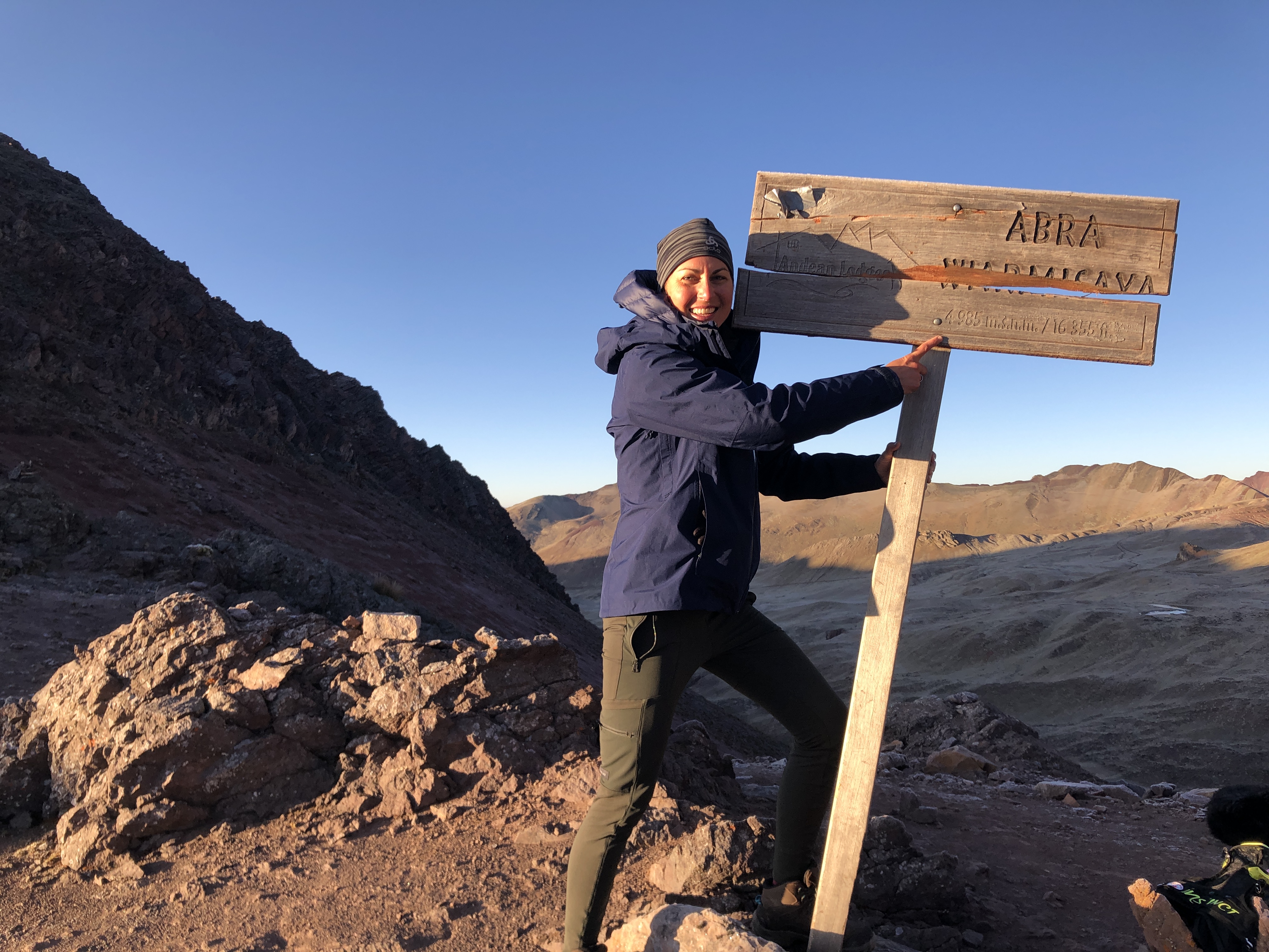 Le groupe choisit de le franchir dès cet après-midi alors comme dirait Cirilo, « c’est parti mon quiqui » ! Il estime entre 1h20 et 1h30 de marche. Je me cale à nouveau sur ma musique et je me crée une cadence de suivi, un « toc » si vous voulez : j’attends la fin d’une chanson et le début de la suivante pour checker où j’en suis du dénivelé. Il monte très très doucement. Il me faudra 16 chansons pour arriver au sommet à 5 200m. Ou peut-être était-ce 17 ou 18. Pour ma défense, à plus de 5 000, on perd 50% d’oxygène ! Il m’aura fallu 48’34 pour franchir le panneau, juste sur les talons de Regis. Dire qu’il trouve toujours que je ne pousse pas assez sur les pédales à vélo !