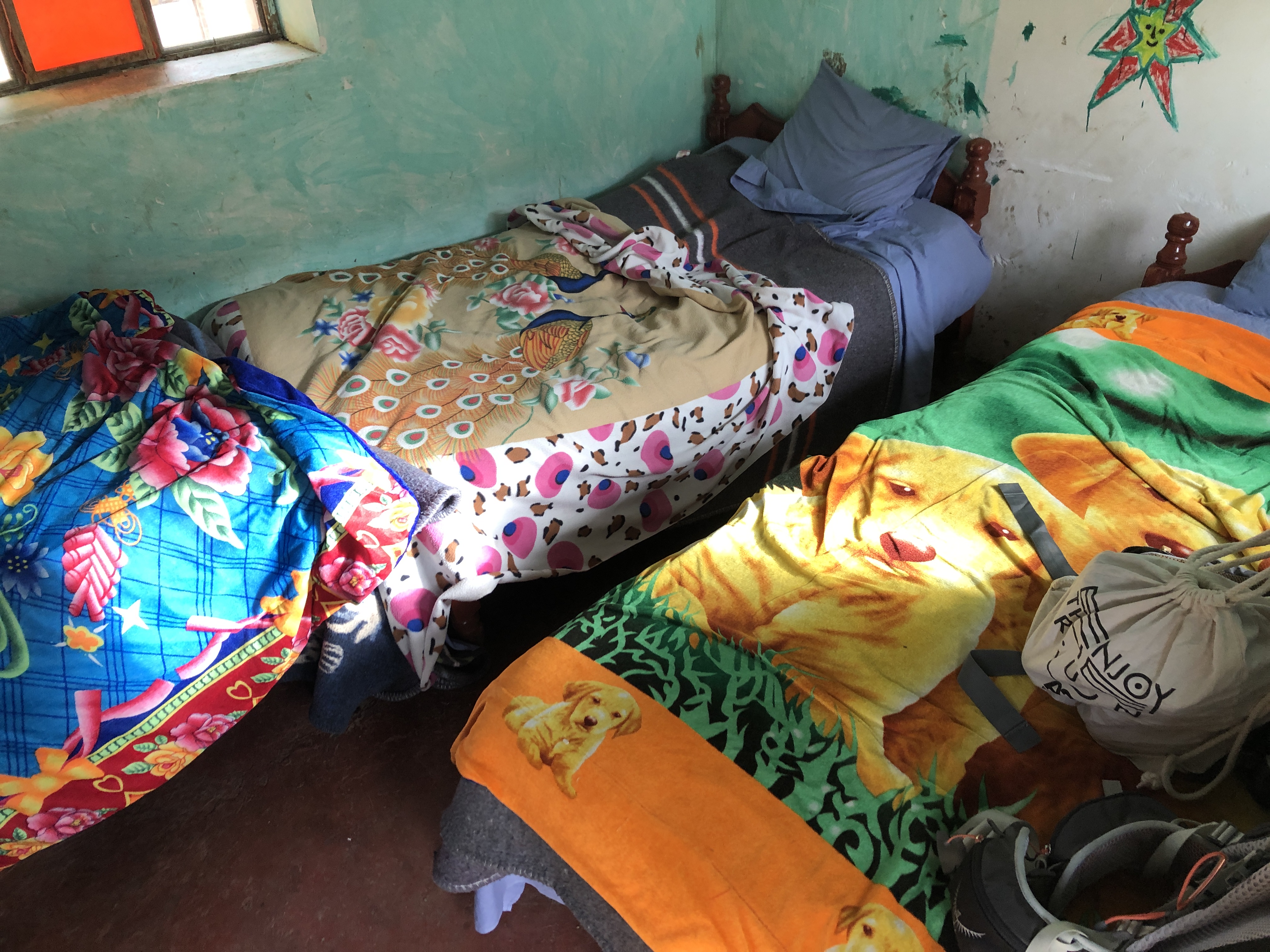 Ce soir, pas de tente, des mini maisons primaires soit 4 murs et des lits posés à l’intérieur.
