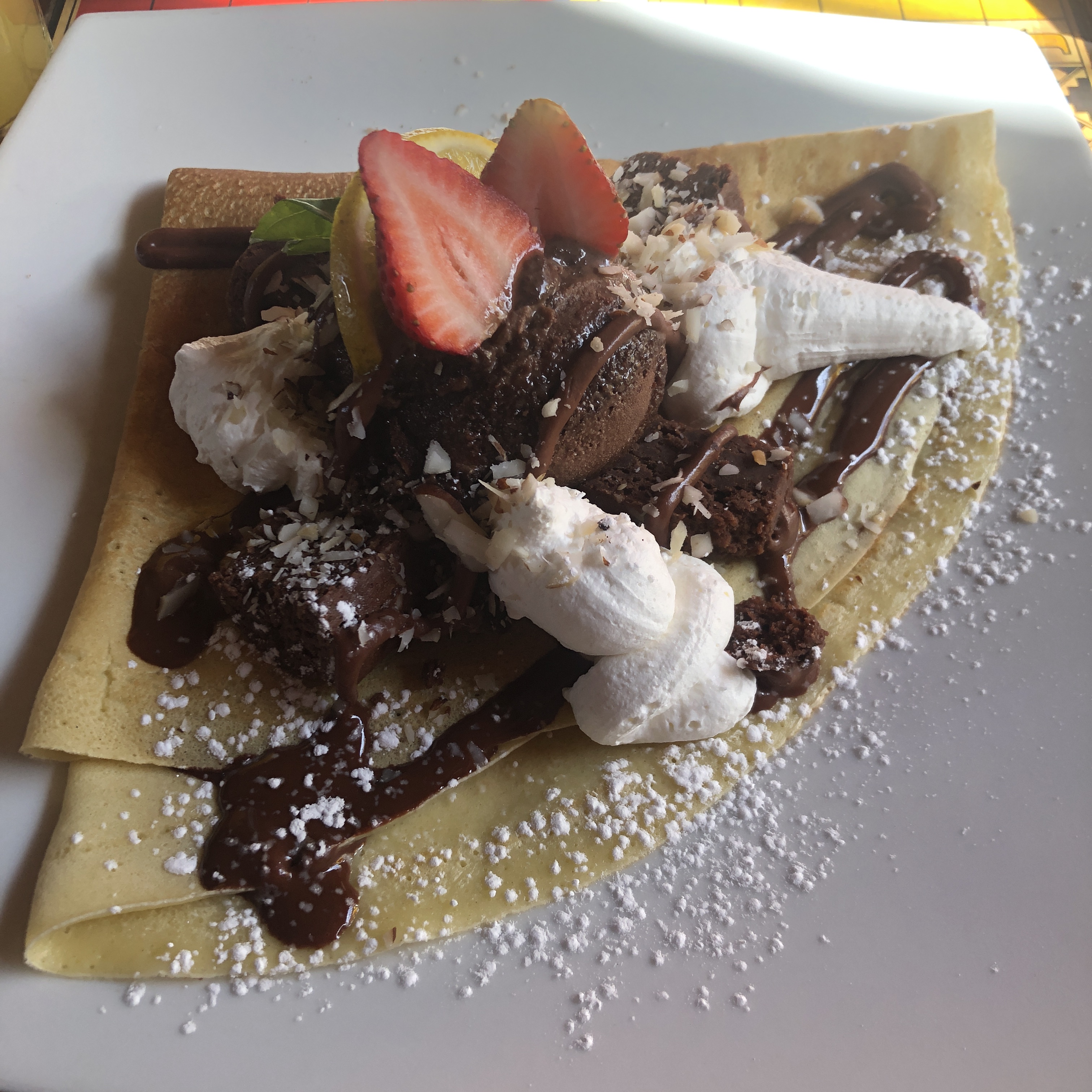 Je profite de la longue route en voiture pour piquer un somme réparateur. Mais le meilleur moment sera celui quand on se pose à la crêperie Crepisimo de l’Alliance Française, à deux pas de l’hôtel. Il est près de 14 heures et je succombe au plaisir de « La decadente », une crêpe composée de morceaux de brownies, de noisettes, de chantilly et de chocolat chaud. Après l’effort, le réconfort !