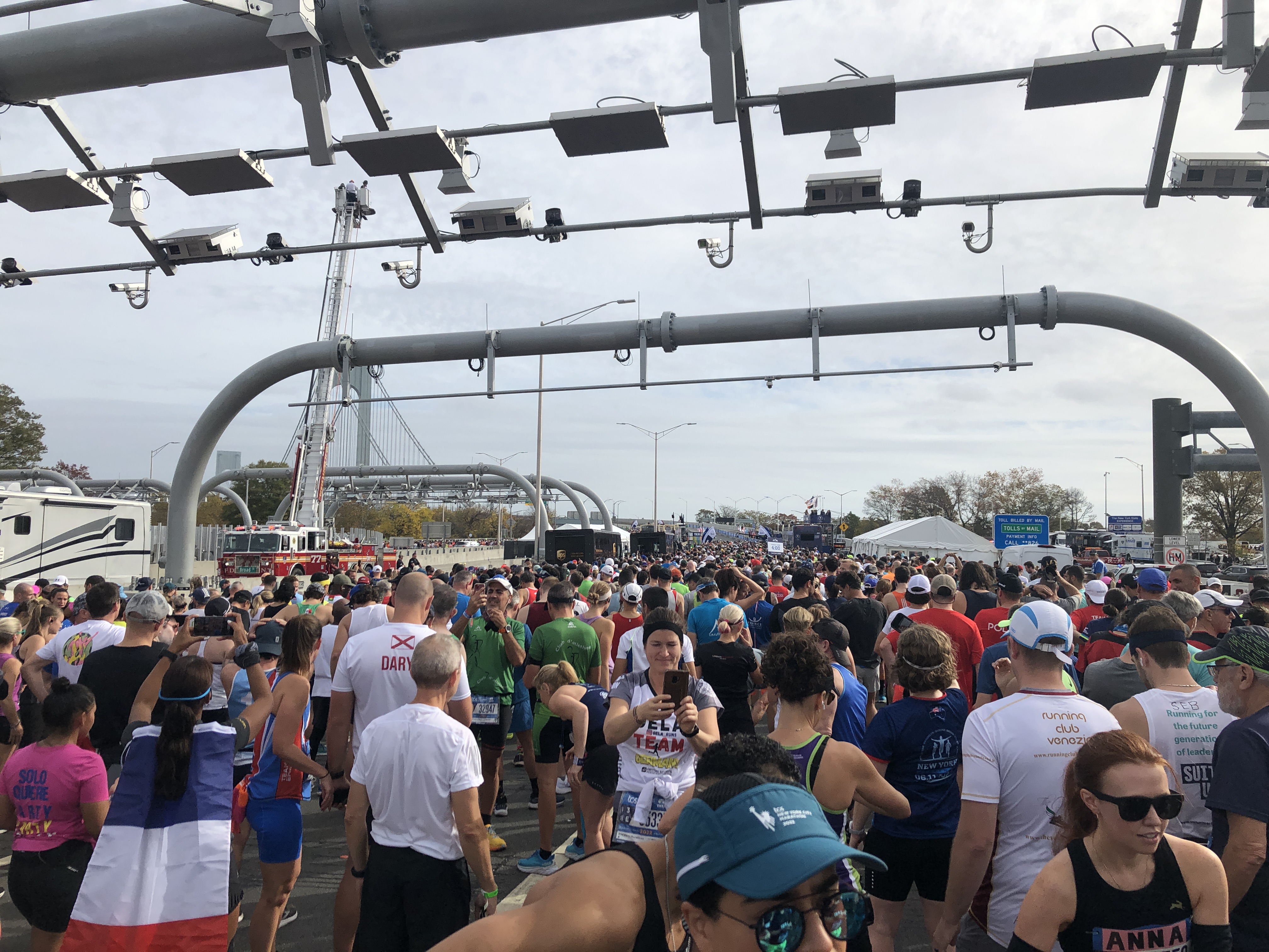Les frissons m’envahissent quand nous nous approchons du Verrazano Bridge par le Upper Level et que je ne vois rien d’autre à perte de vue que des coureurs qui remplissent les voies, désertées par les voitures pour l’occasion.