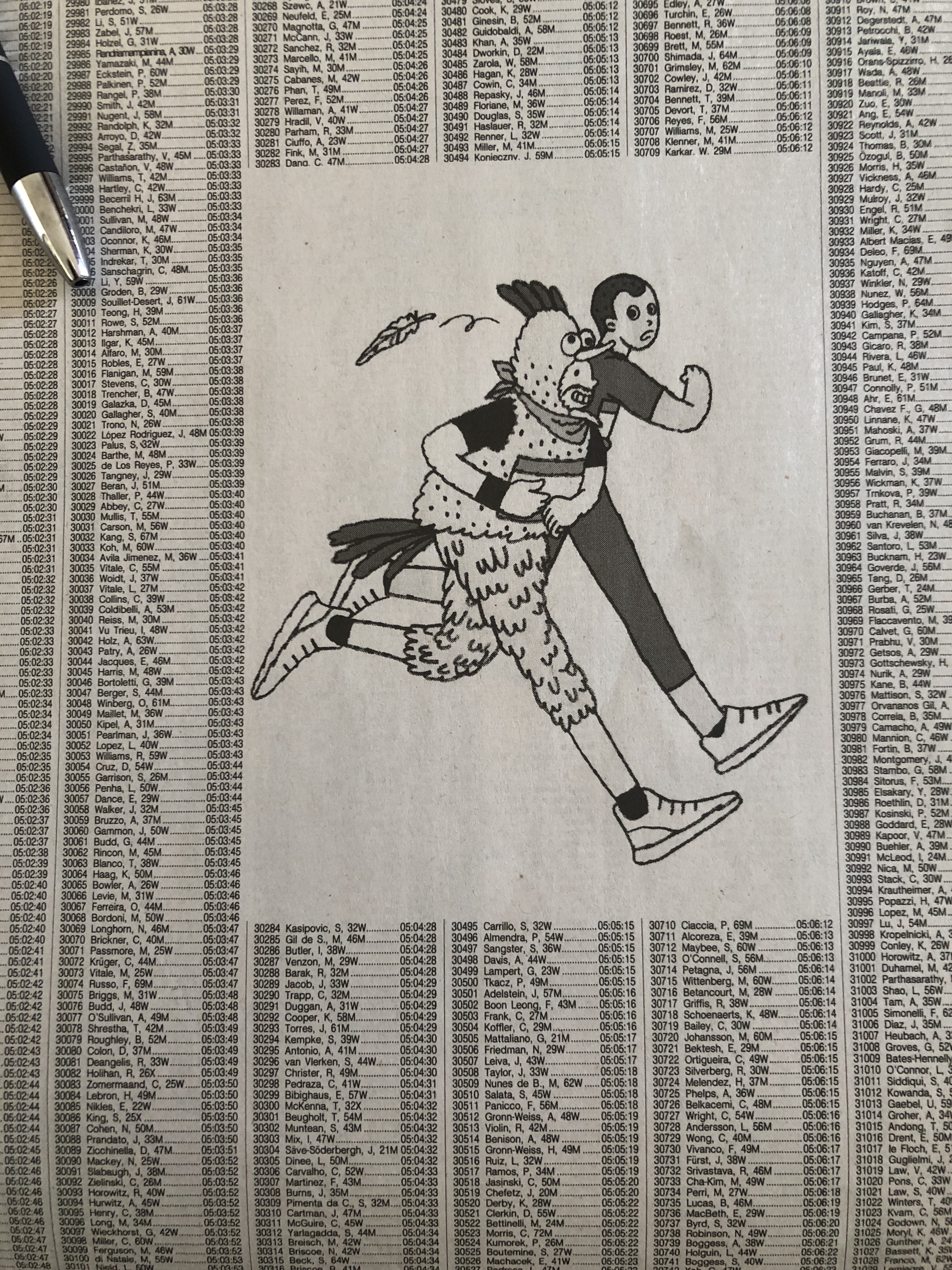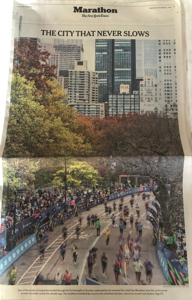 Ça tombe bien, nous avons un objectif : choper l’édition spéciale marathon du New York Times qui liste les noms de tous les finishers. Et d’après nos infos, il est souvent écoulé dès 7 heures du matin…