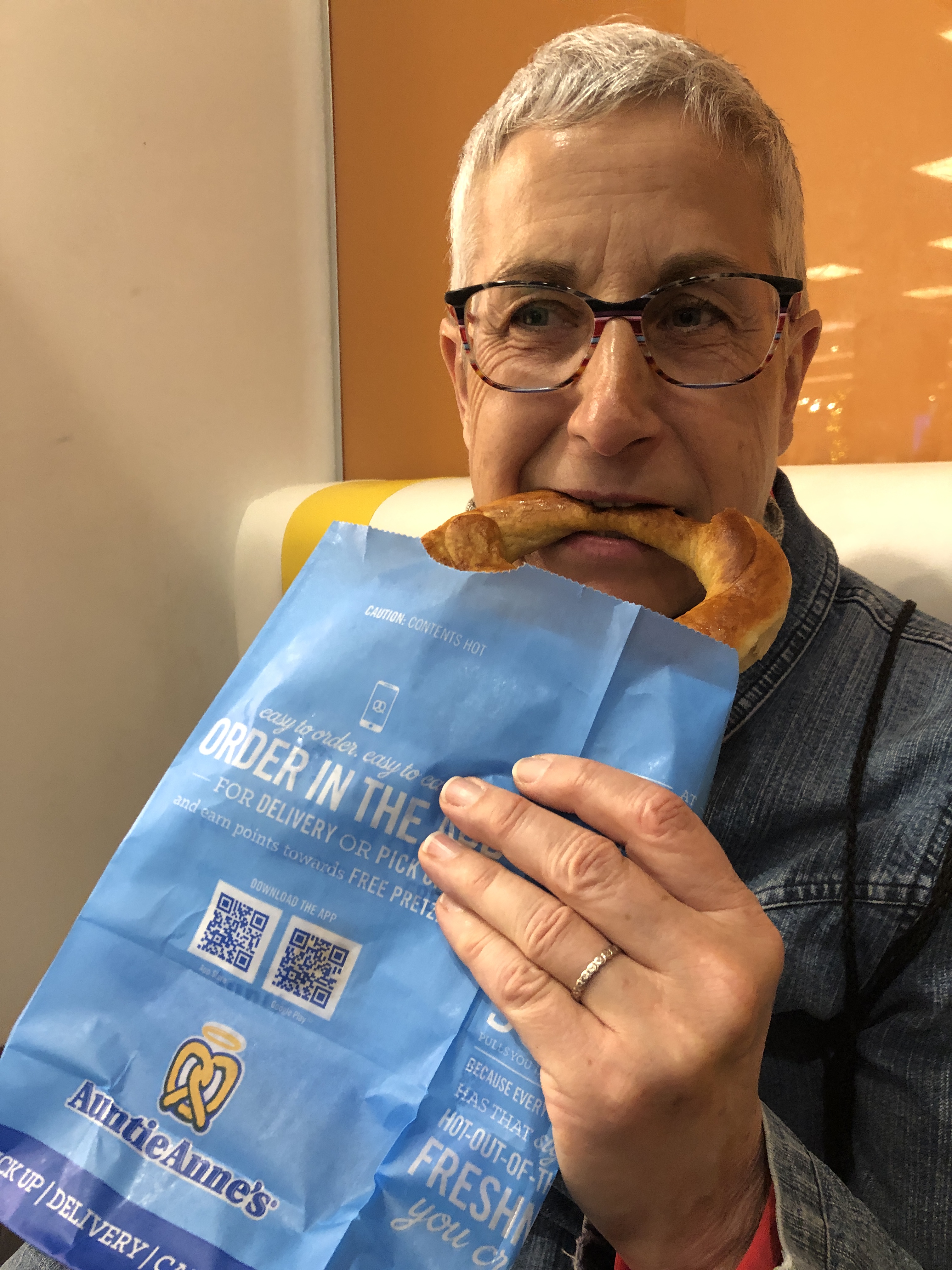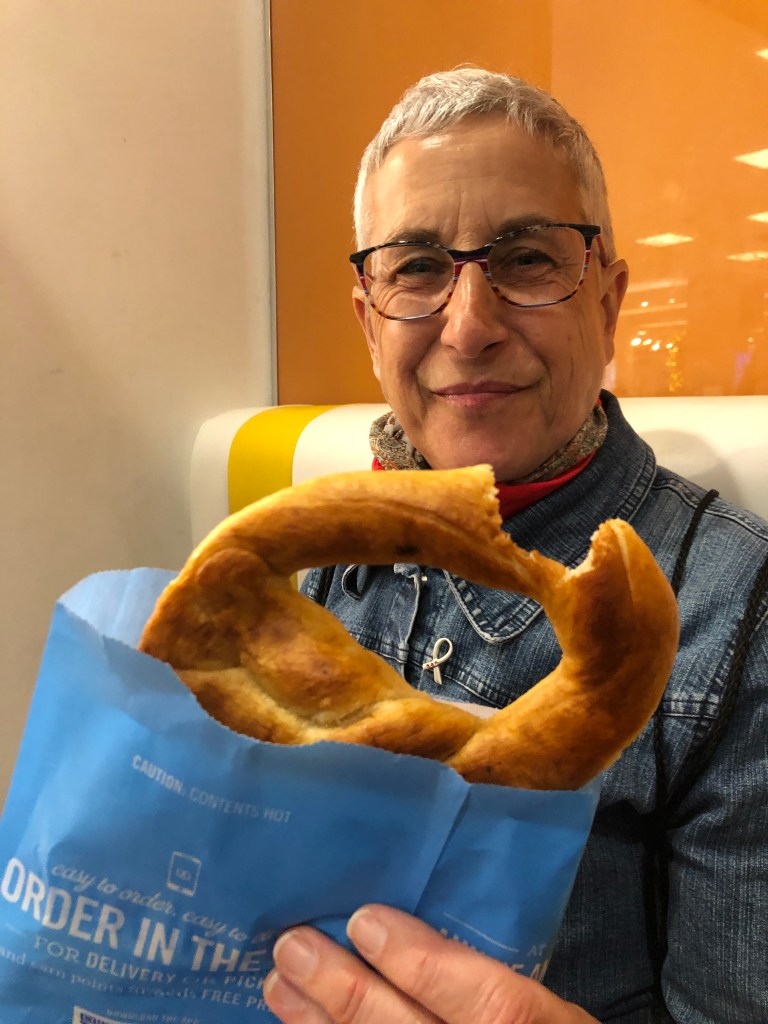 Un pretzel de chez Aunt Annie’s pour reprendre des forces et nous faire tenir jusqu’au plateau repas Air France et c’est retour à l’hôtel.