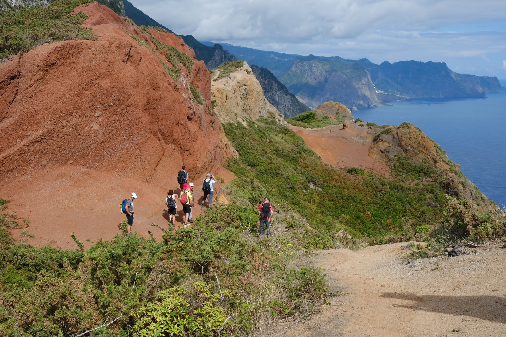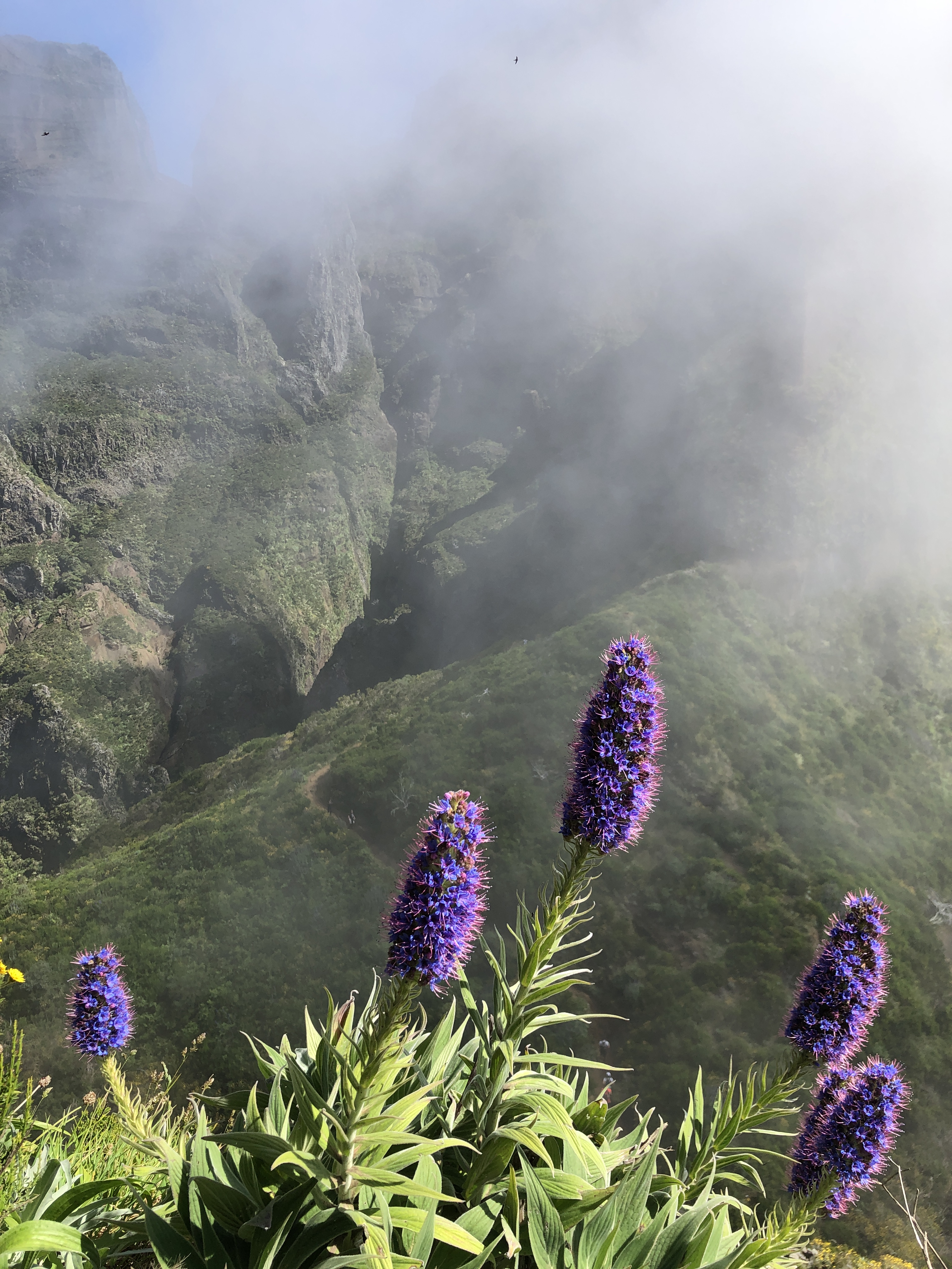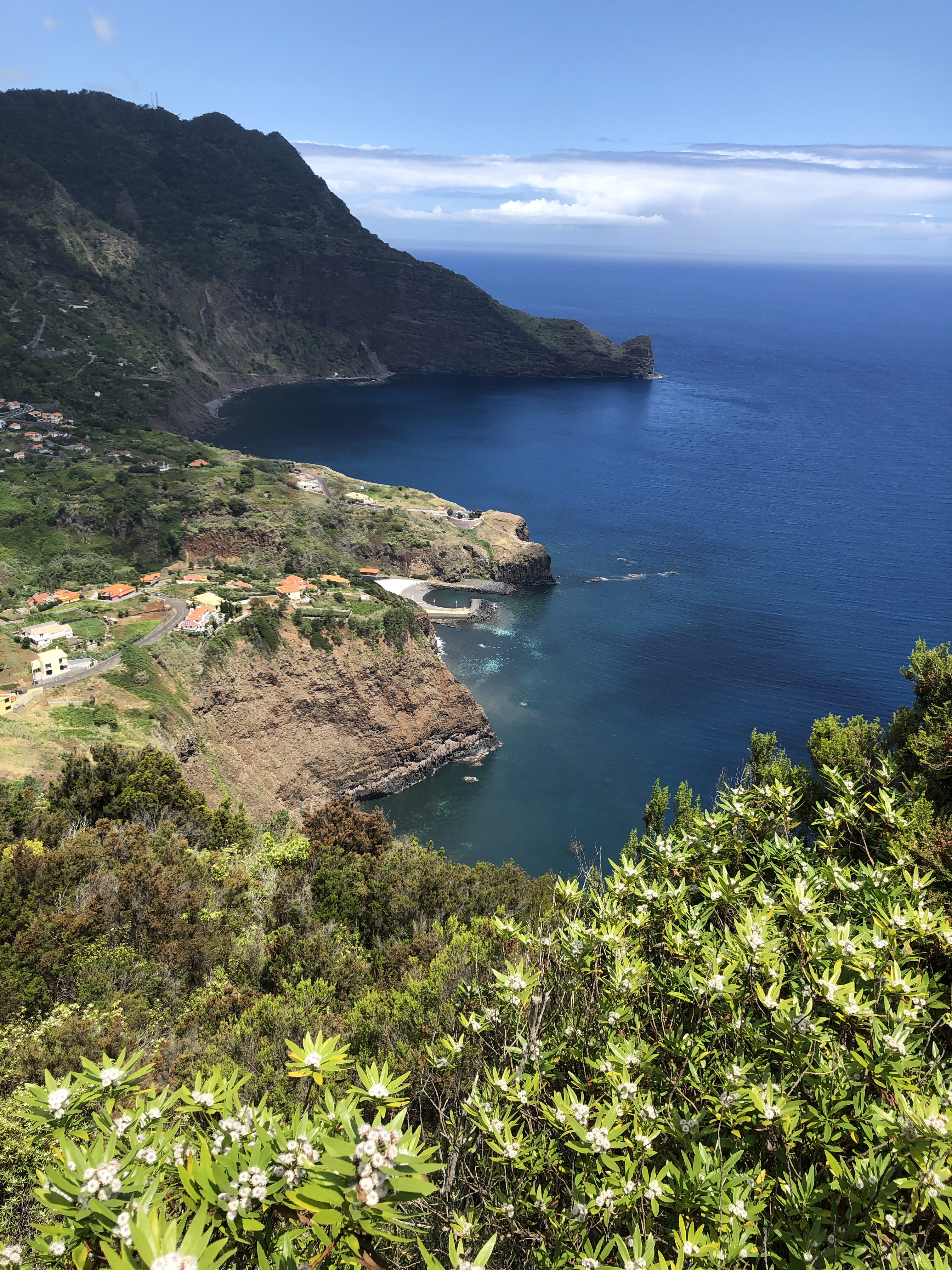 Nous descendons ensuite vers la mer en suivant un sentier en balcon où nous retrouvons les fameuses cultures en terrasses de Madère, bordées de jolies végétations méditerranéennes et de joubarbes à plateau.