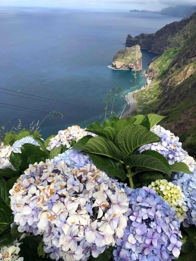 Nous poussons jusqu’au belvédère de la Rocha do Navio, bordé d’hortensias, qui offre une vue magnifique sur l’océan transparent.