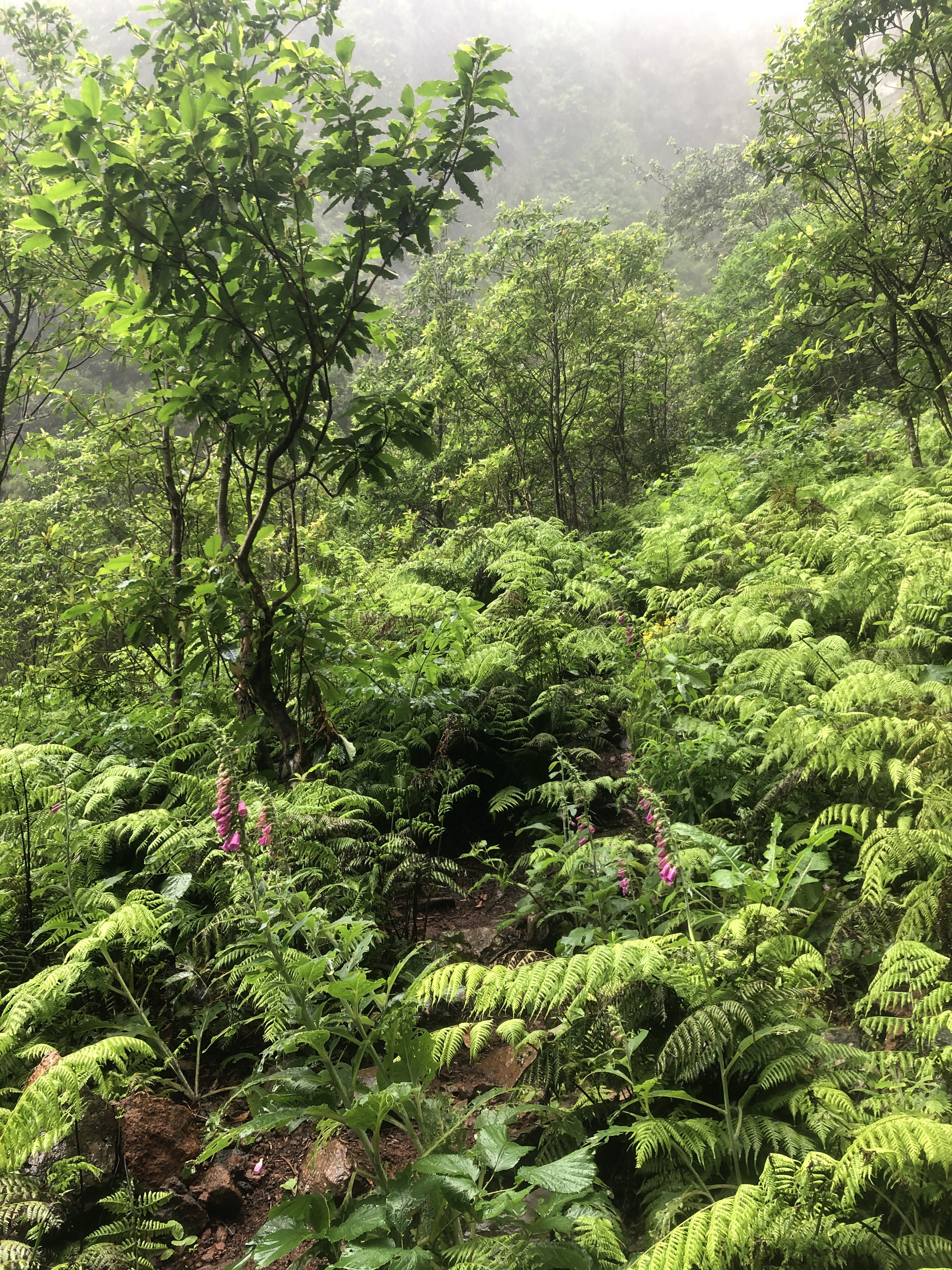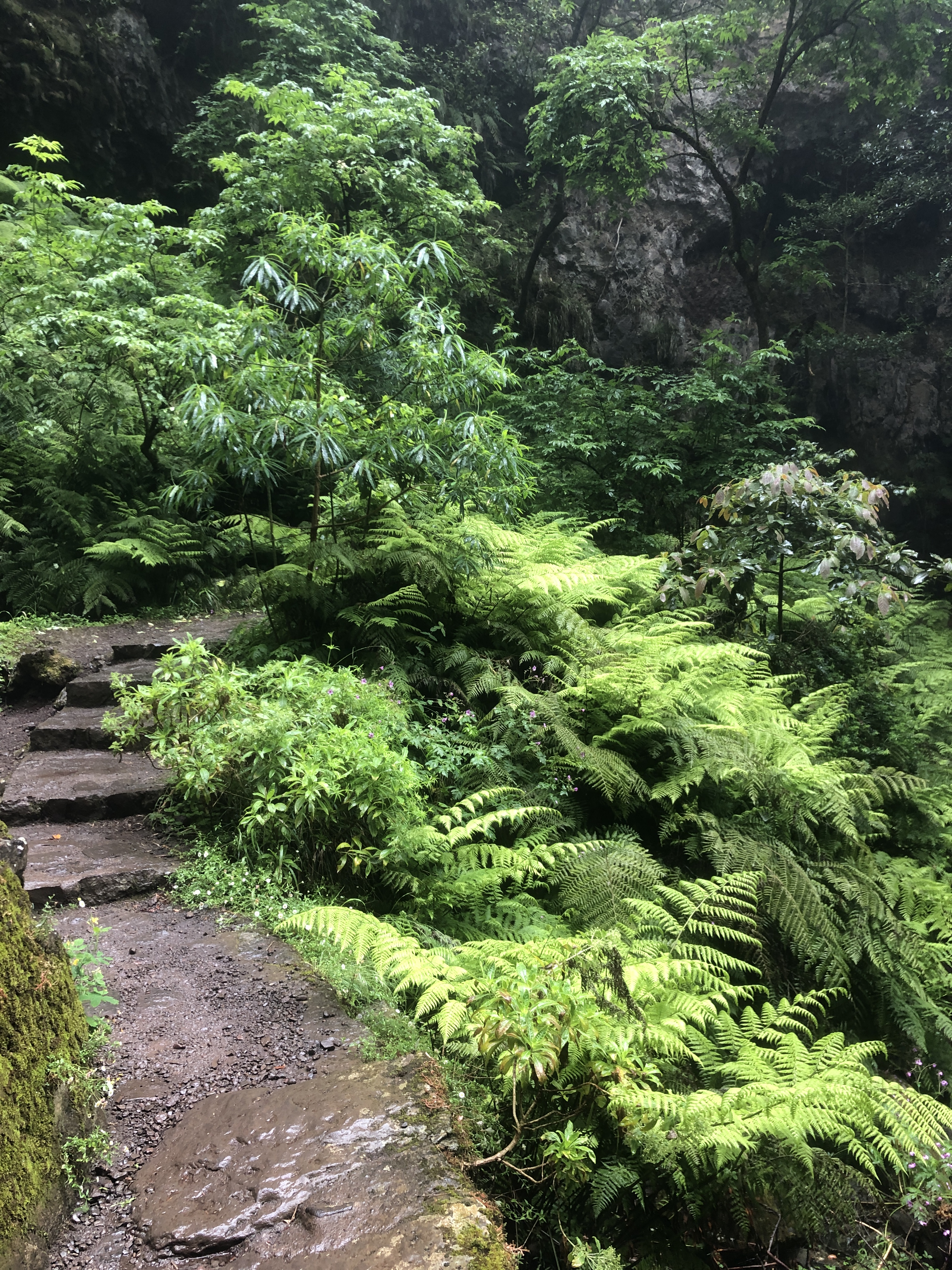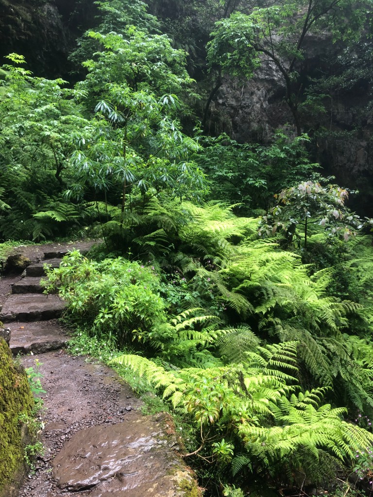 Nous nous enfonçons dans l’antre de la laurissilva (forêt indigène) par une levada qui s’enfonce dans une vallée profonde. Et là, c’est une enfilade de marches qui montent et qui descendent sur quasi 3 kilomètres. Le corps se met enfin à transpirer !