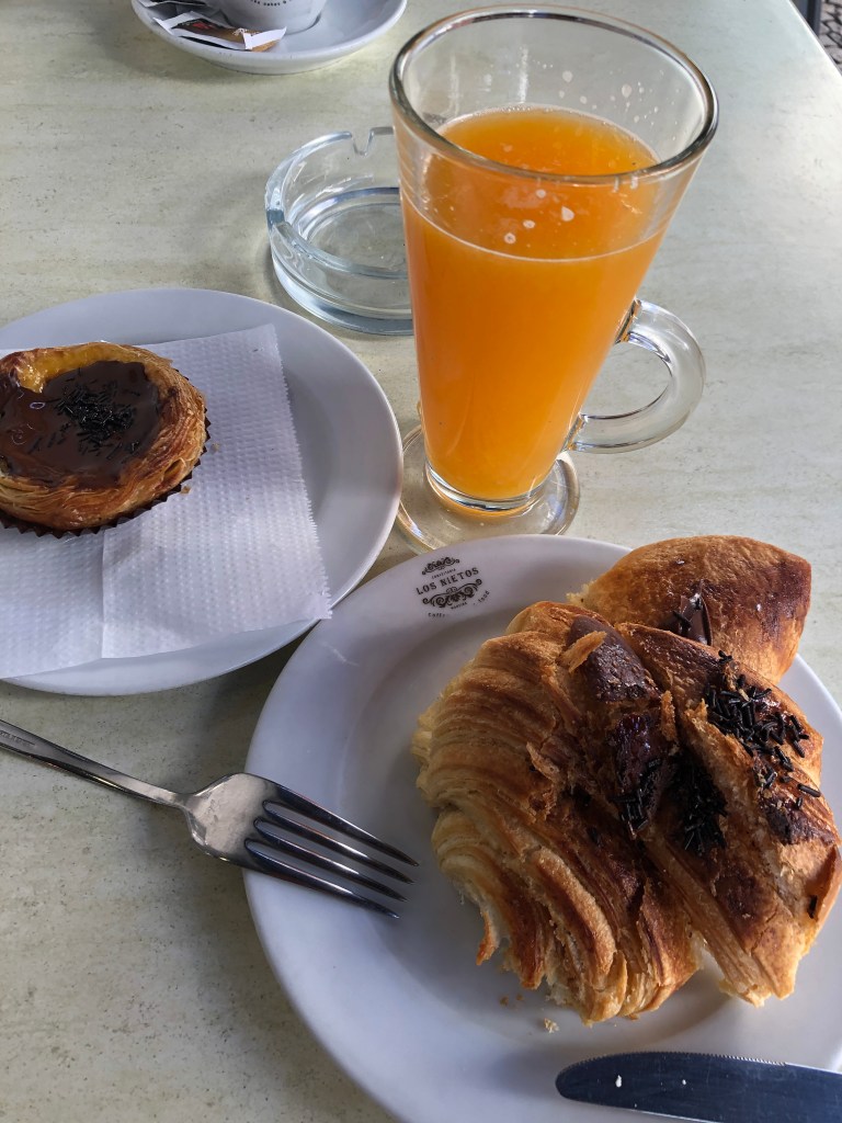 Après un peu de lecture sur le balcon pour évacuer la chaleur corporelle et une bonne douche, j’estime que j’ai bien mérité une gourmandise à la pâtisserie située à quelques centaines de mètres de l’hôtel : Confeitaria Los Nietos. Régis m’accompagne, on partage un pasteis de nata nappé de Nutella et je complète avec un croissant et un jus d’orange pressé.