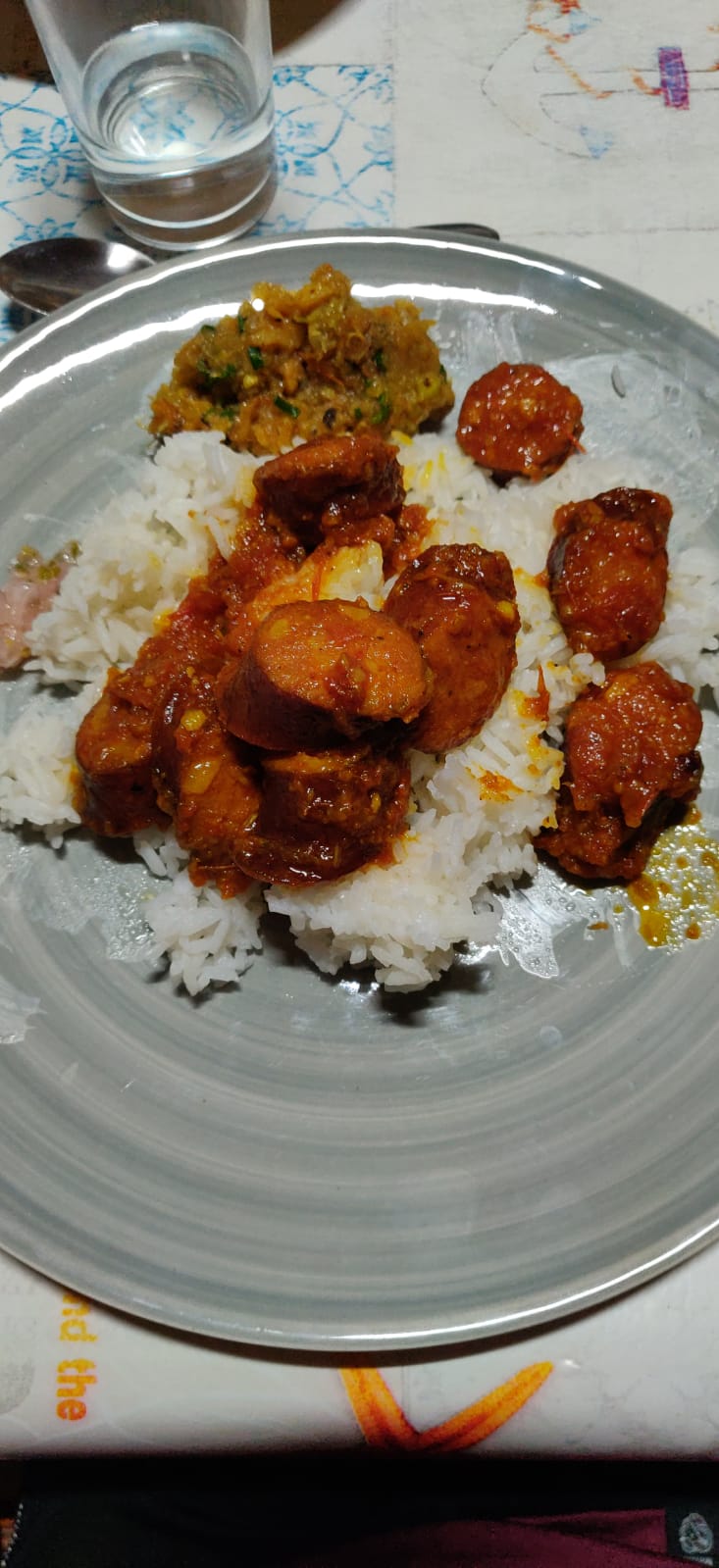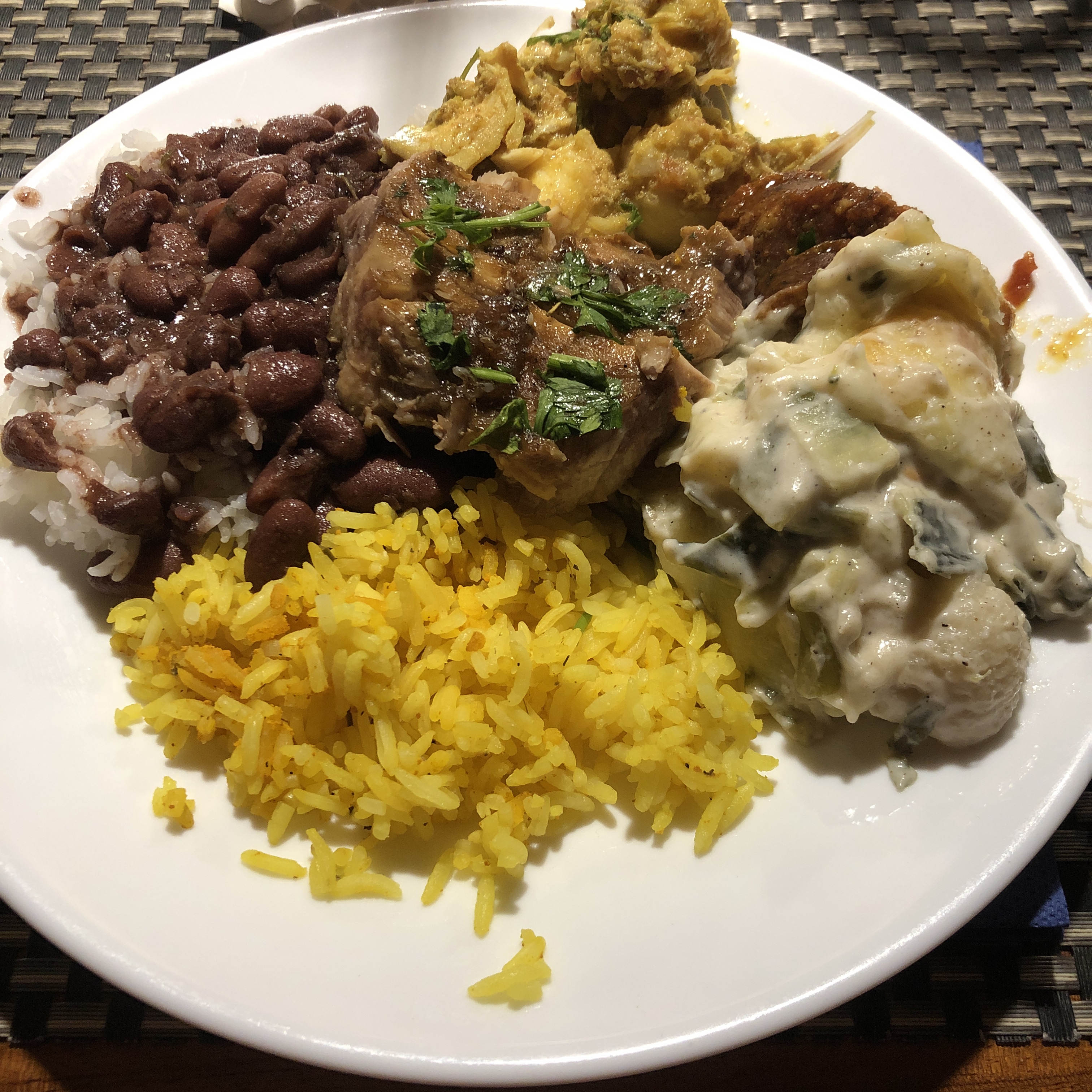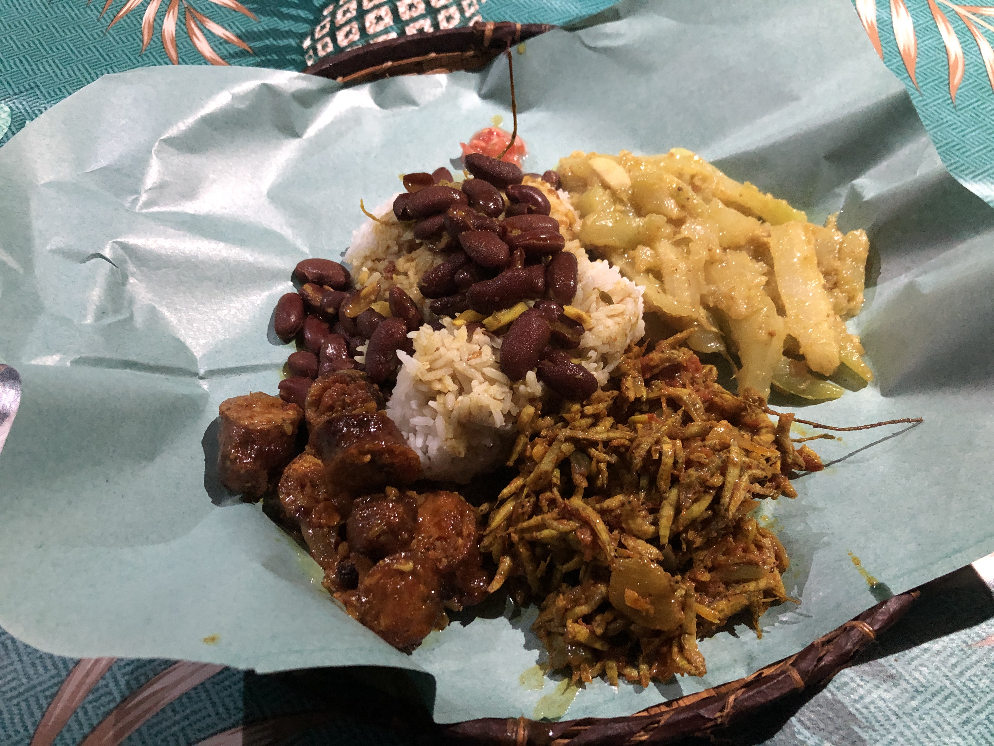 Après l’apéro composé de bouchons poulet, nous dégustons riz / rougail saucisses / haricots rouges / bichiques / frites de chouchou.