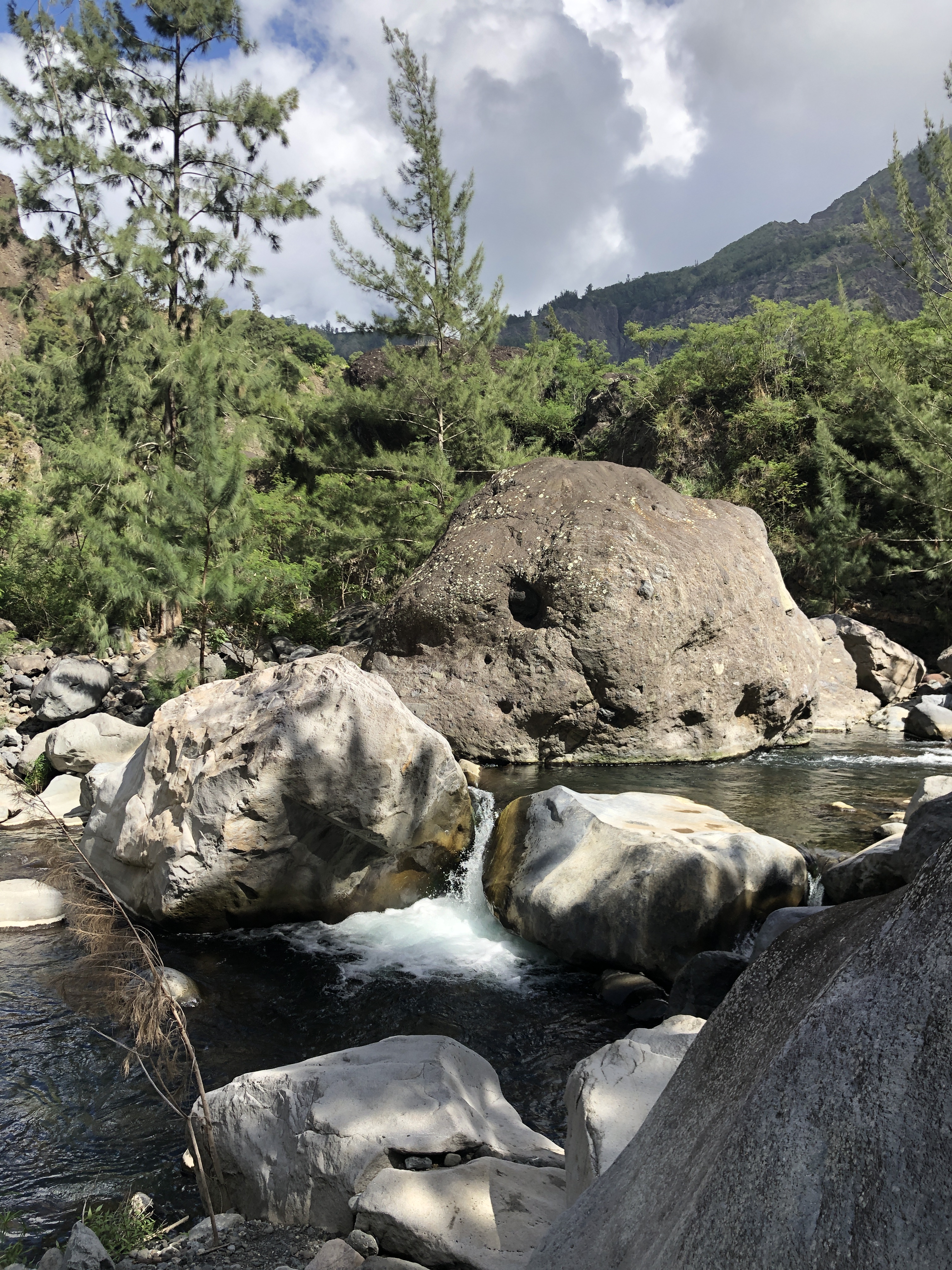 Pour accéder aux fameux rochers qui forment donc La Chapelle, de nombreuses traversées d’eau comme j’aime (pas) jusqu’à la rivière Le Bras Rouge, où nous nous posons pour le pique nique.