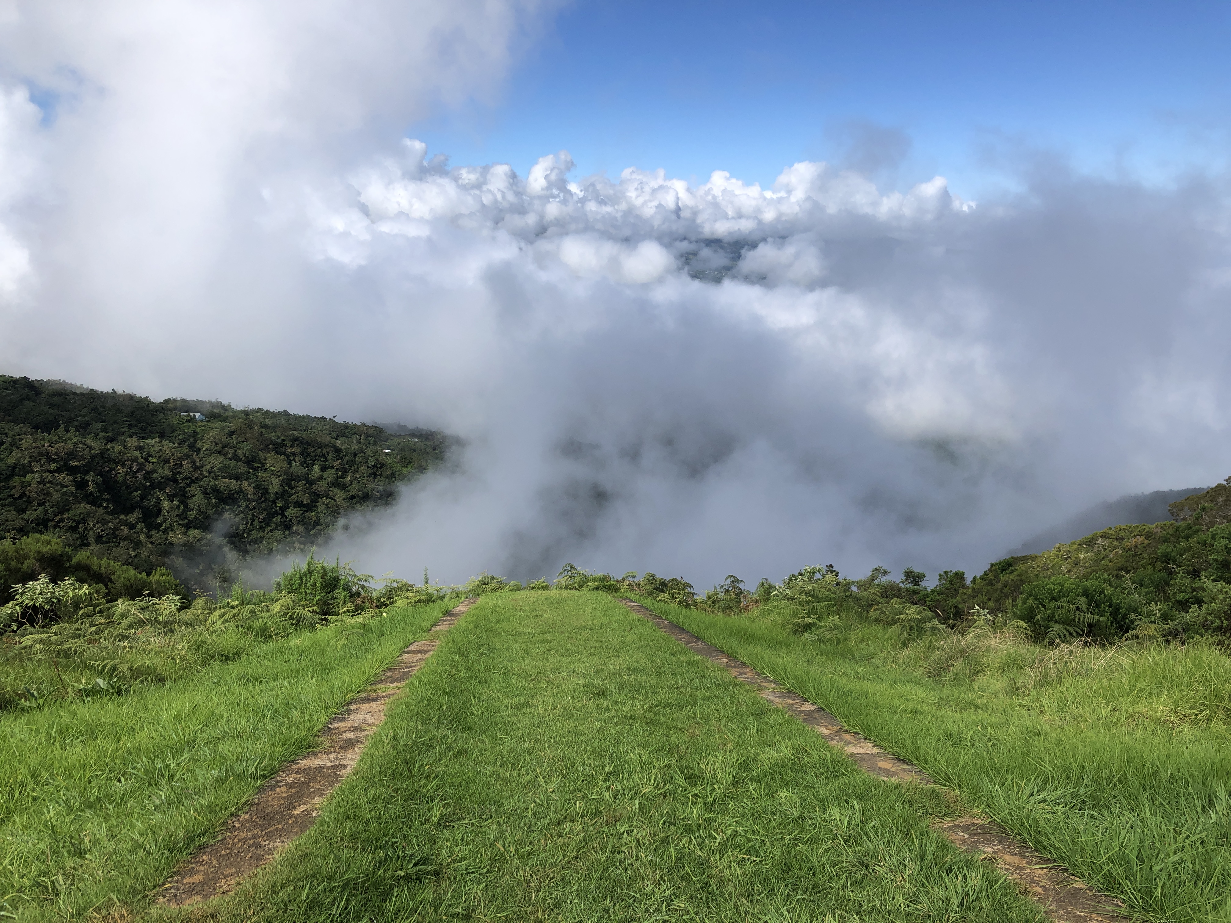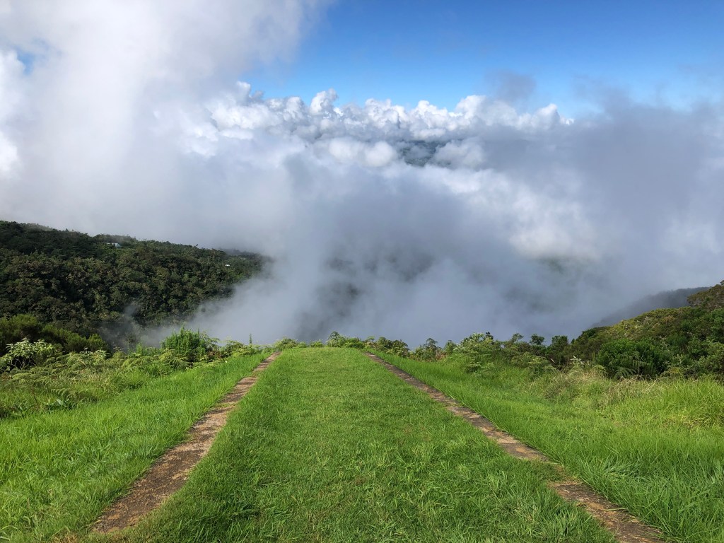 Au bout de quelque 5 kilomètres, nous observons la rampe de lancement des deltaplanes sous les nuages. Avant de nous poser pour le pique nique à Camp Marron, du nom des esclaves qui s’échappaient, perché à 1780m.