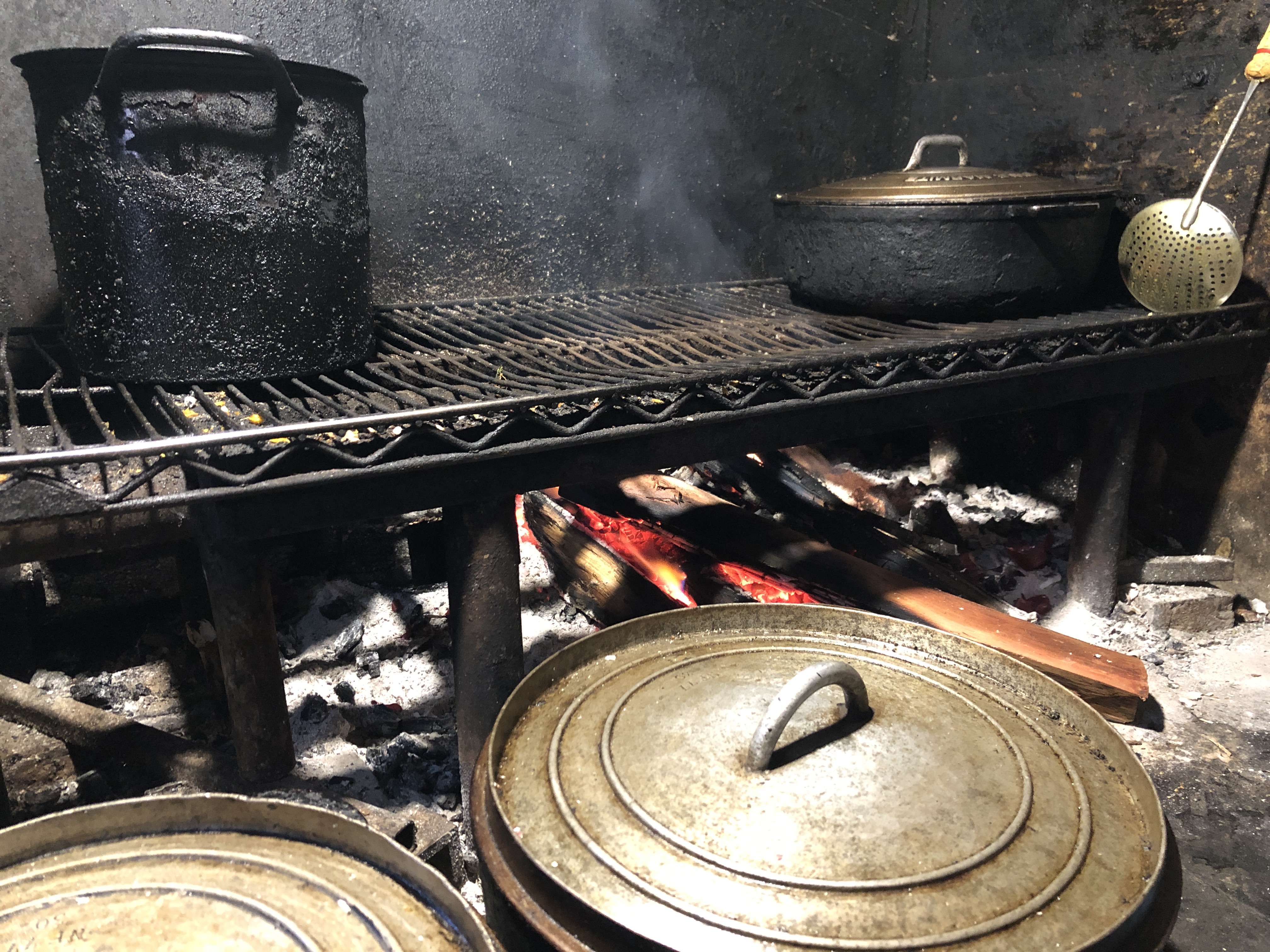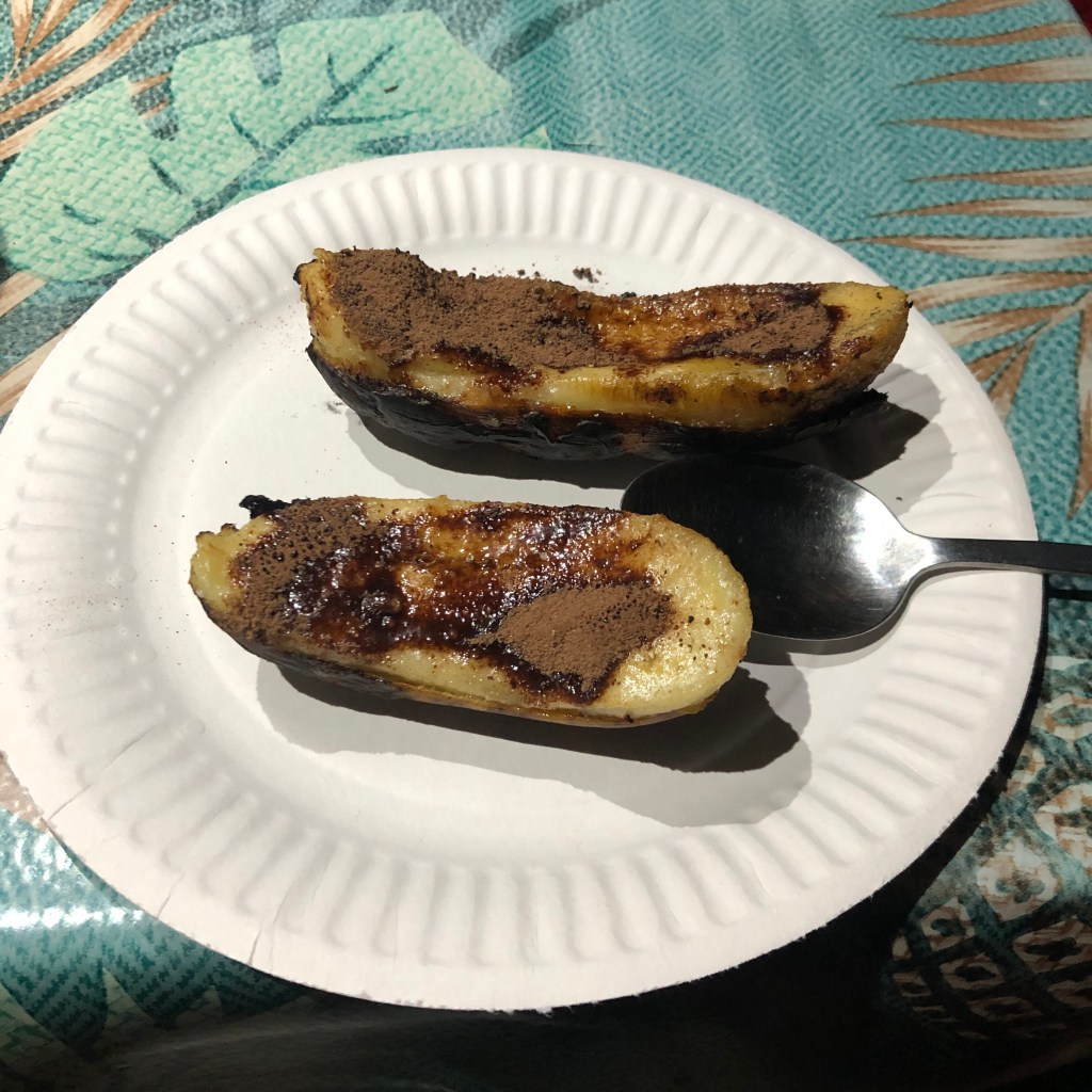 En dessert, banane (blanche) flambée au feu de bois sucre chocolat. Et c’est moi qui les ai préparées !