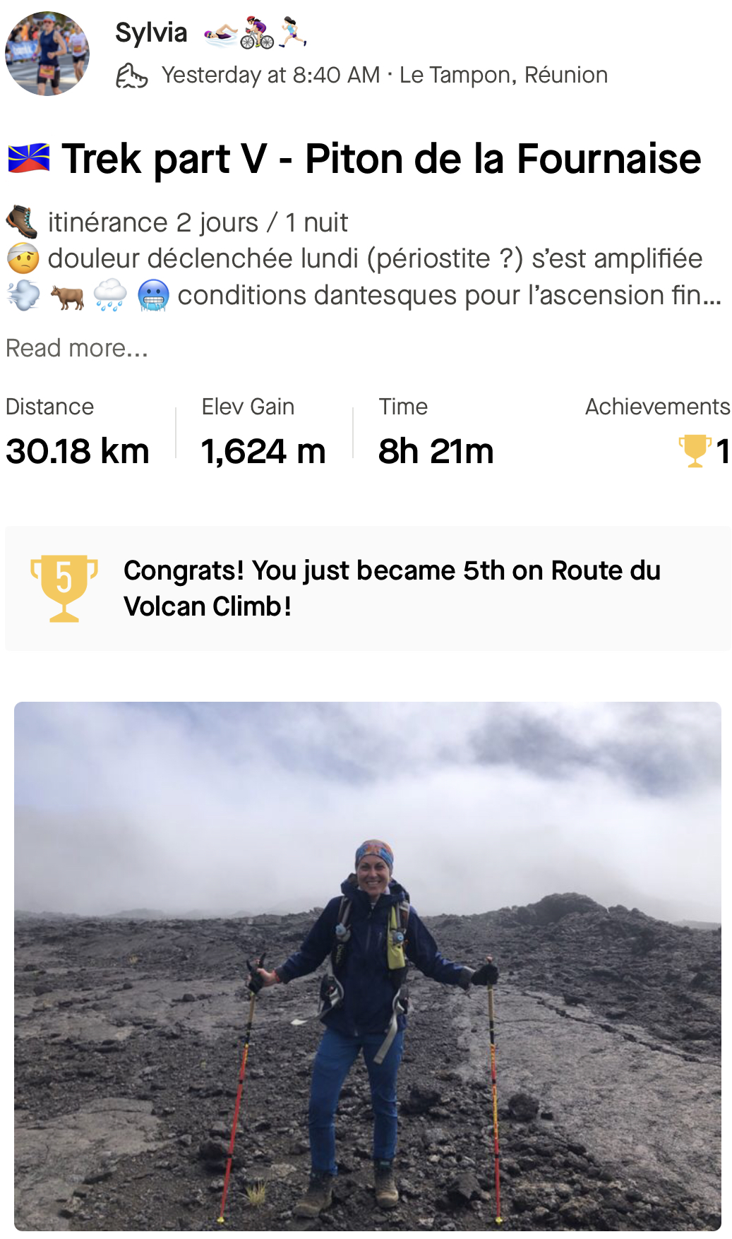 Au final, nous marcherons 11 km AR pour atteindre le sommet du Piton de la Fournaise et redescendre.