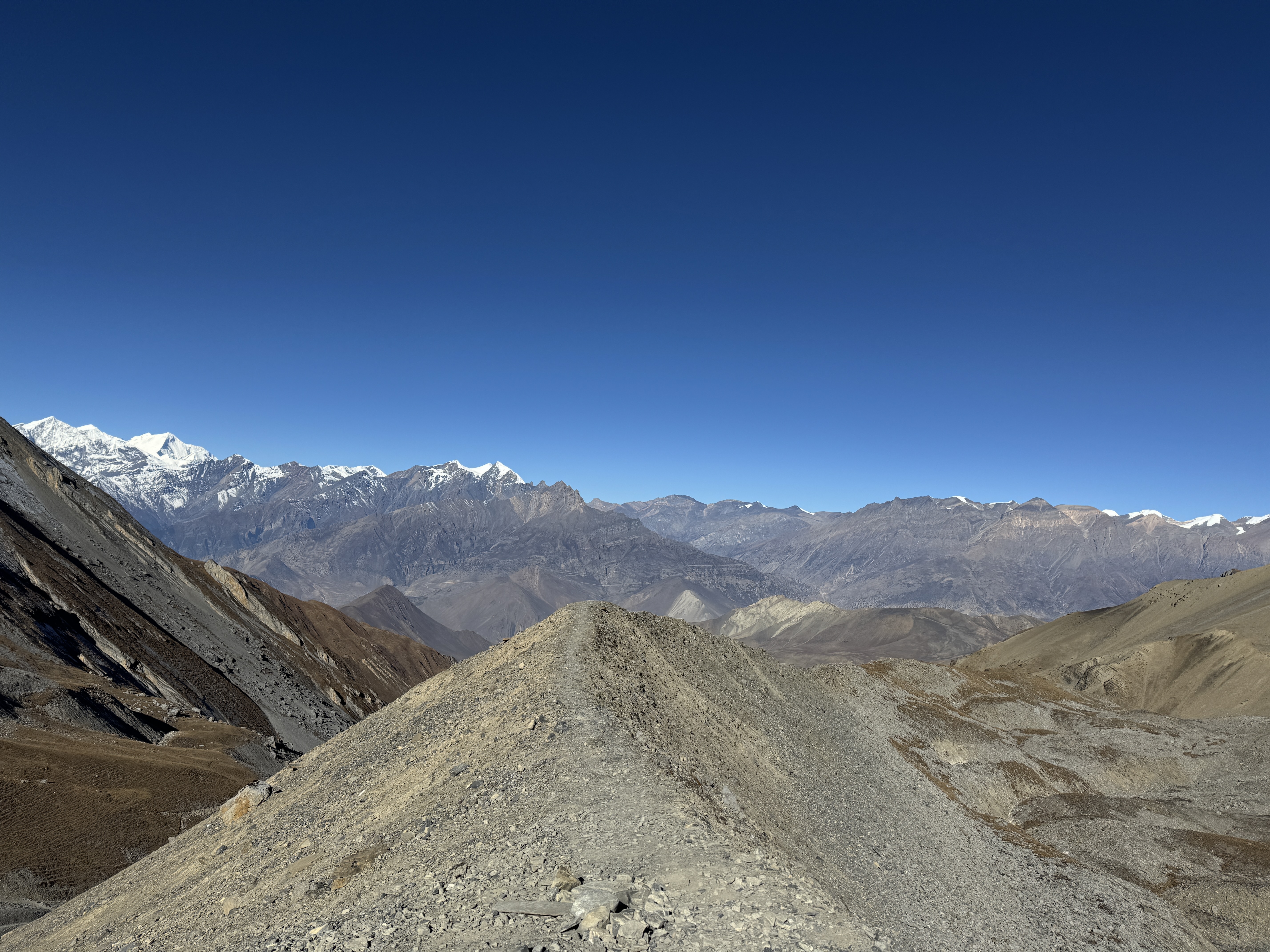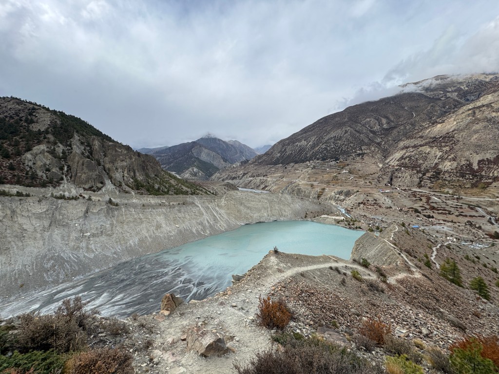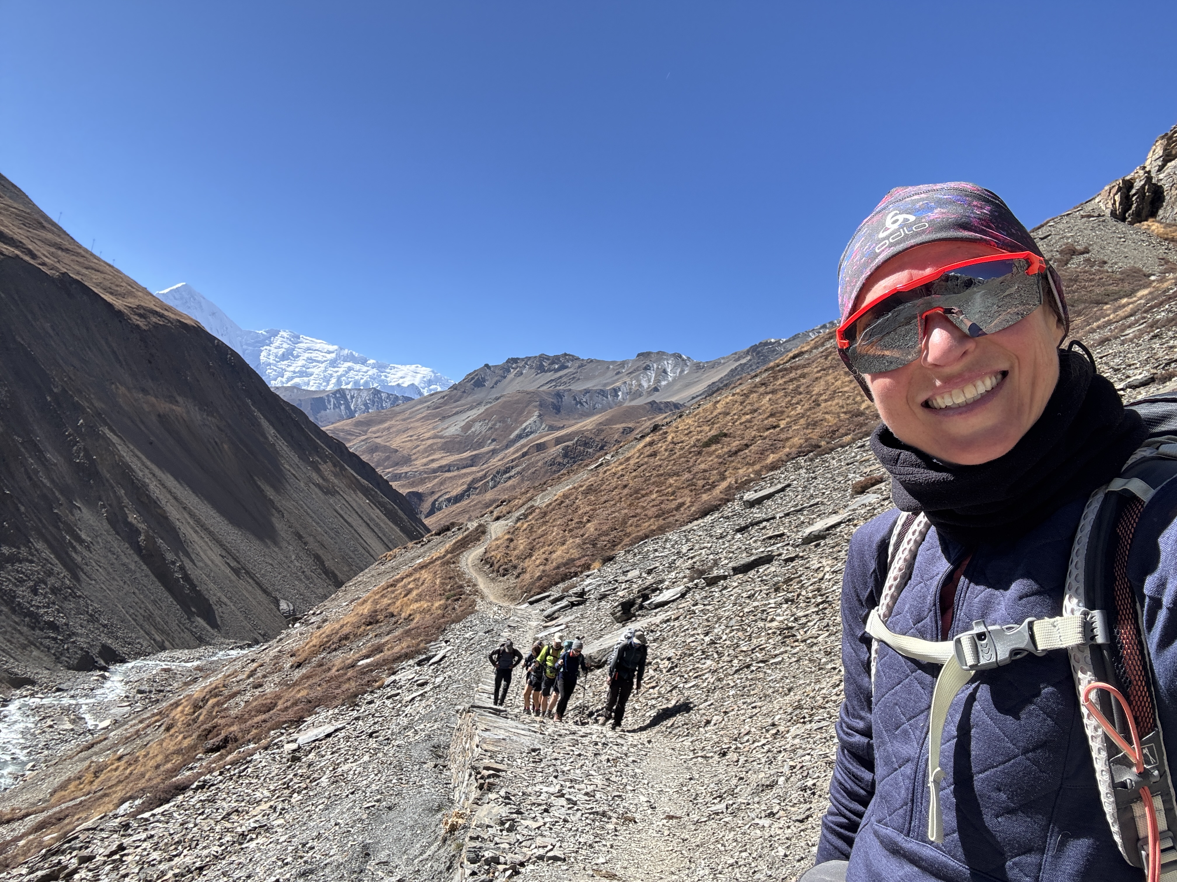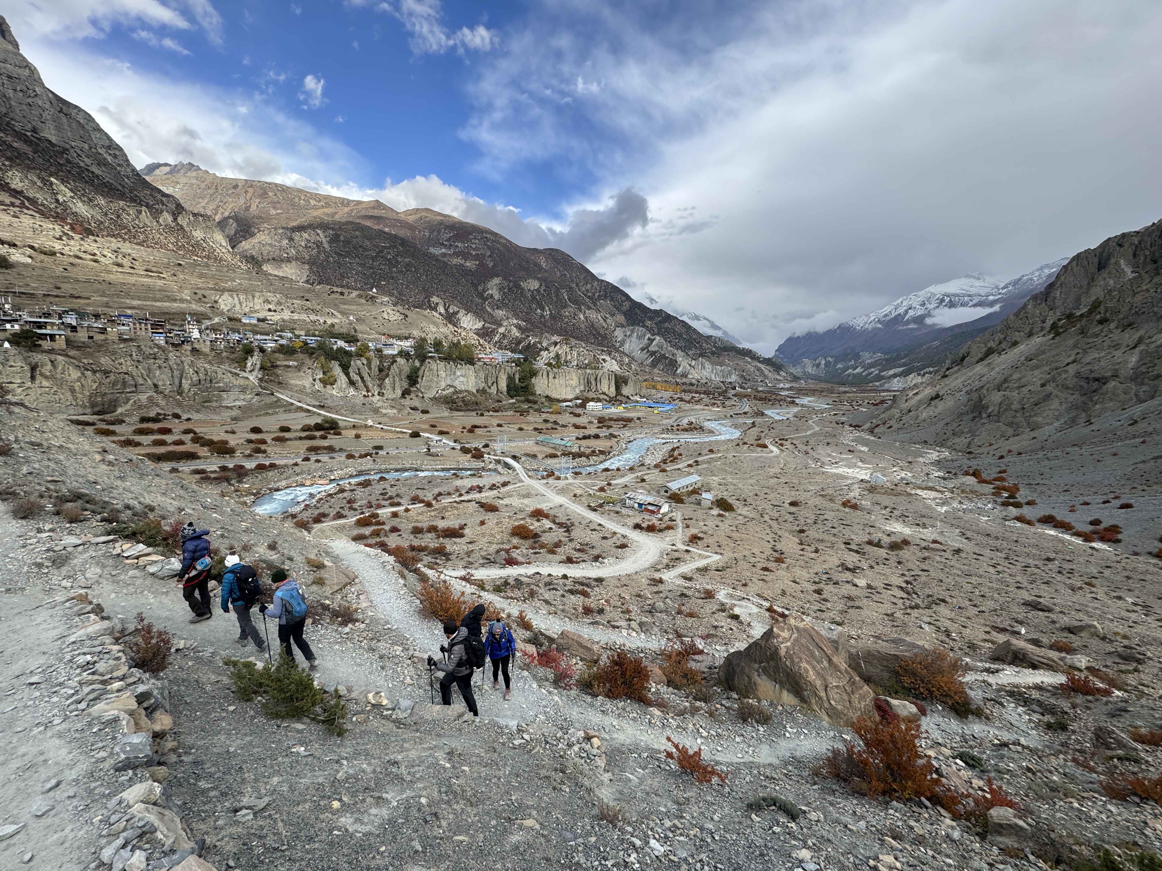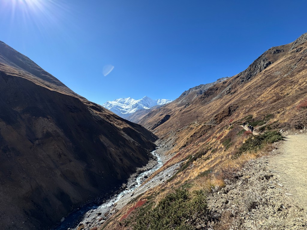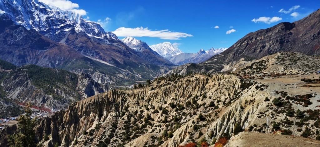 La descente est tout aussi spectaculaire, avec une vue sur la chaîne de montagnes de Dhaulagiri et Annapurna. Mais qu’est-ce qu’elle est longue ! 10 km, 1700 D-