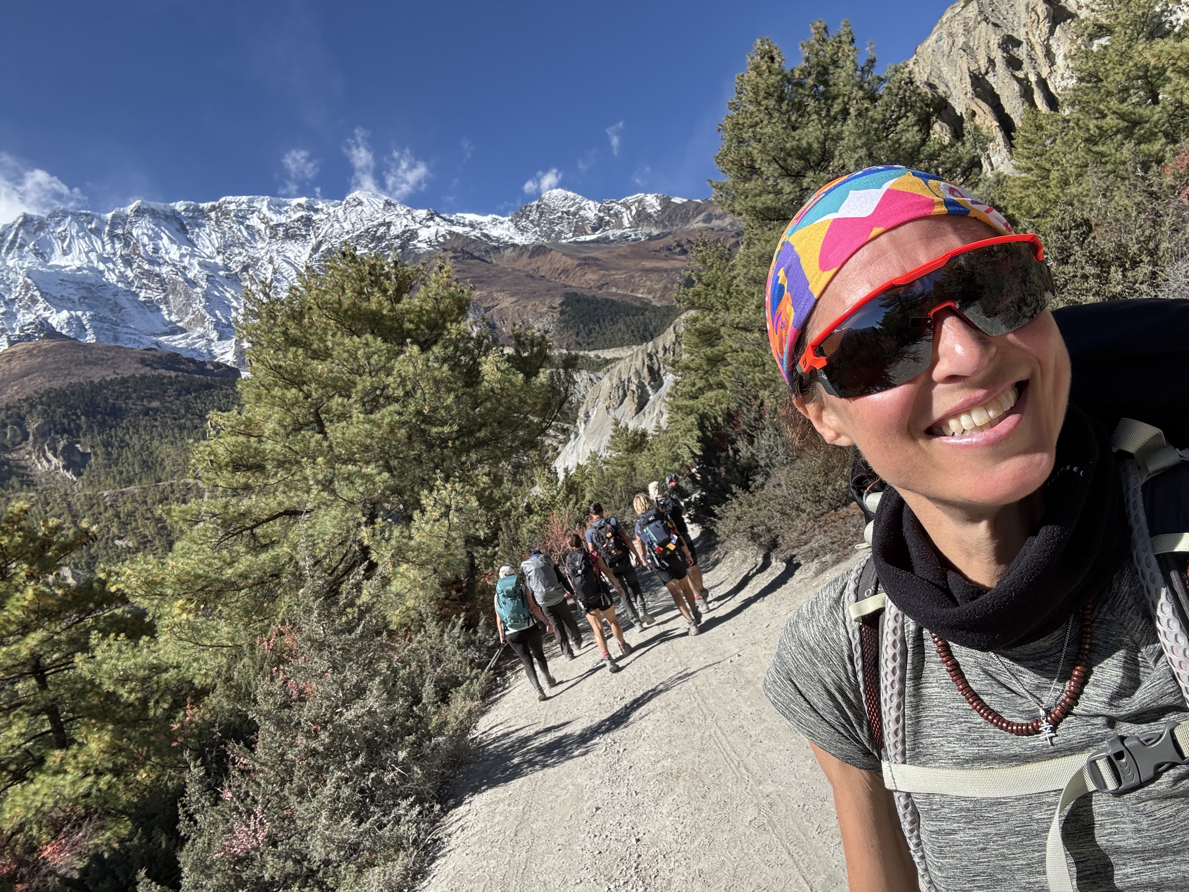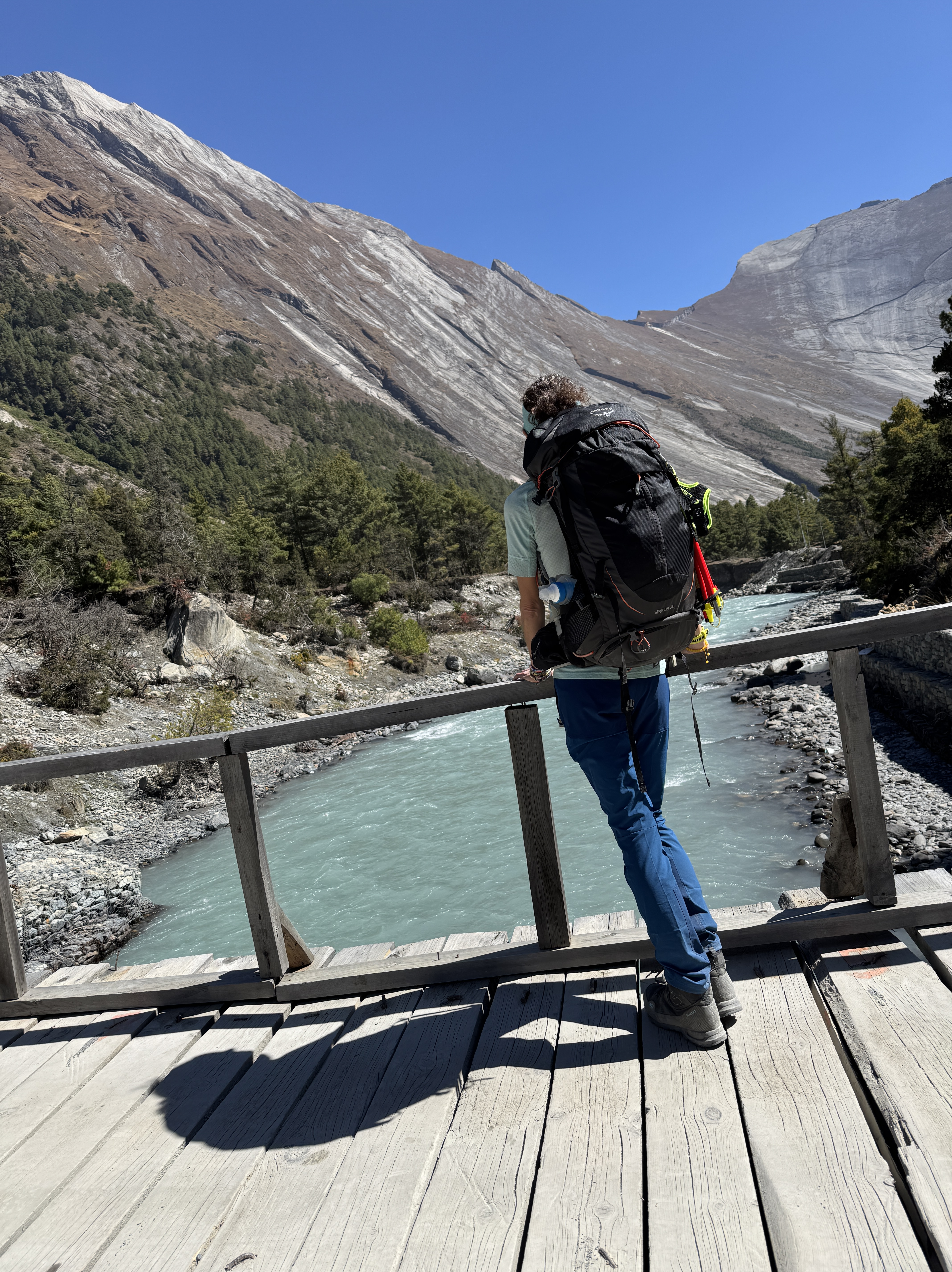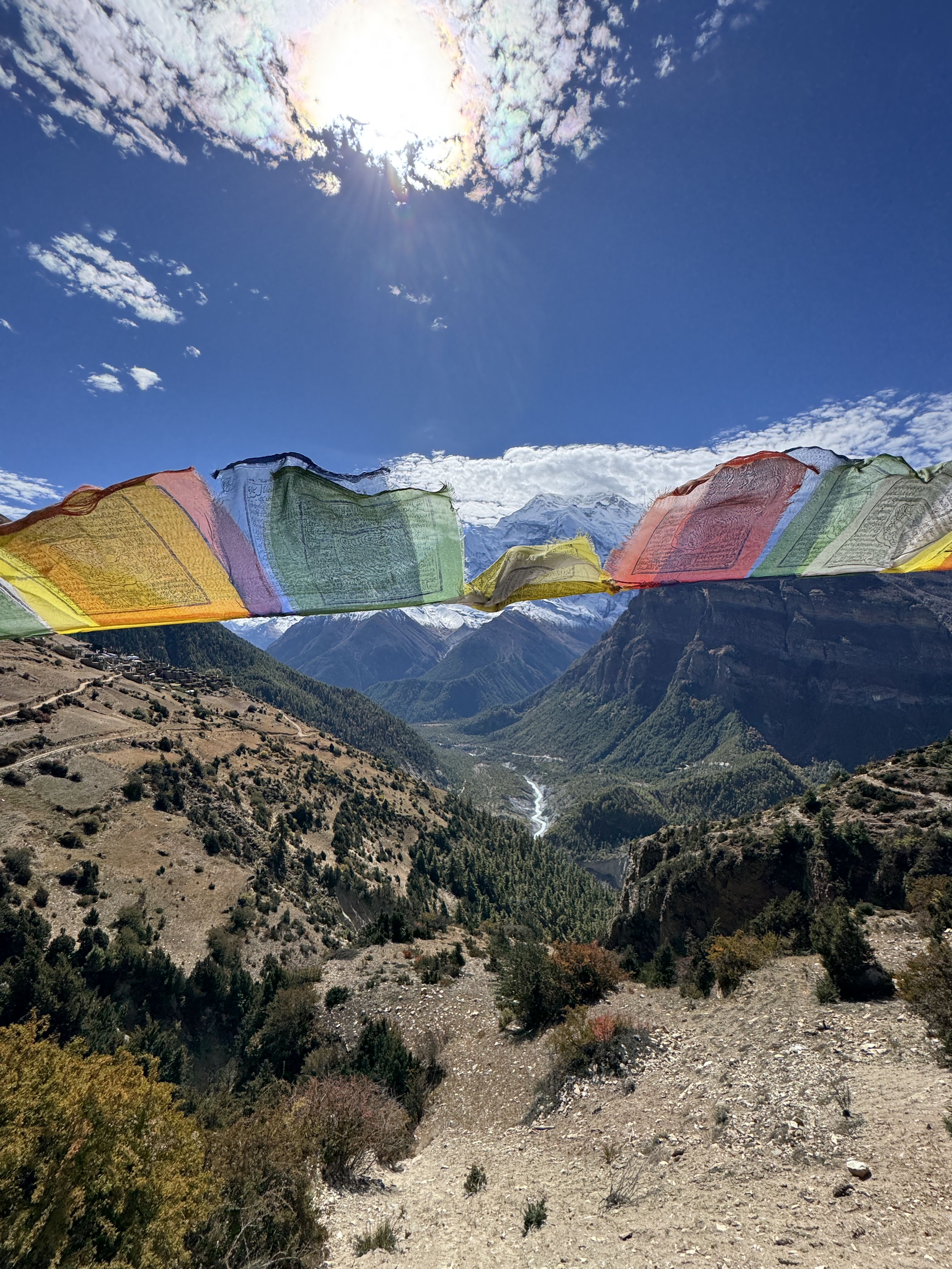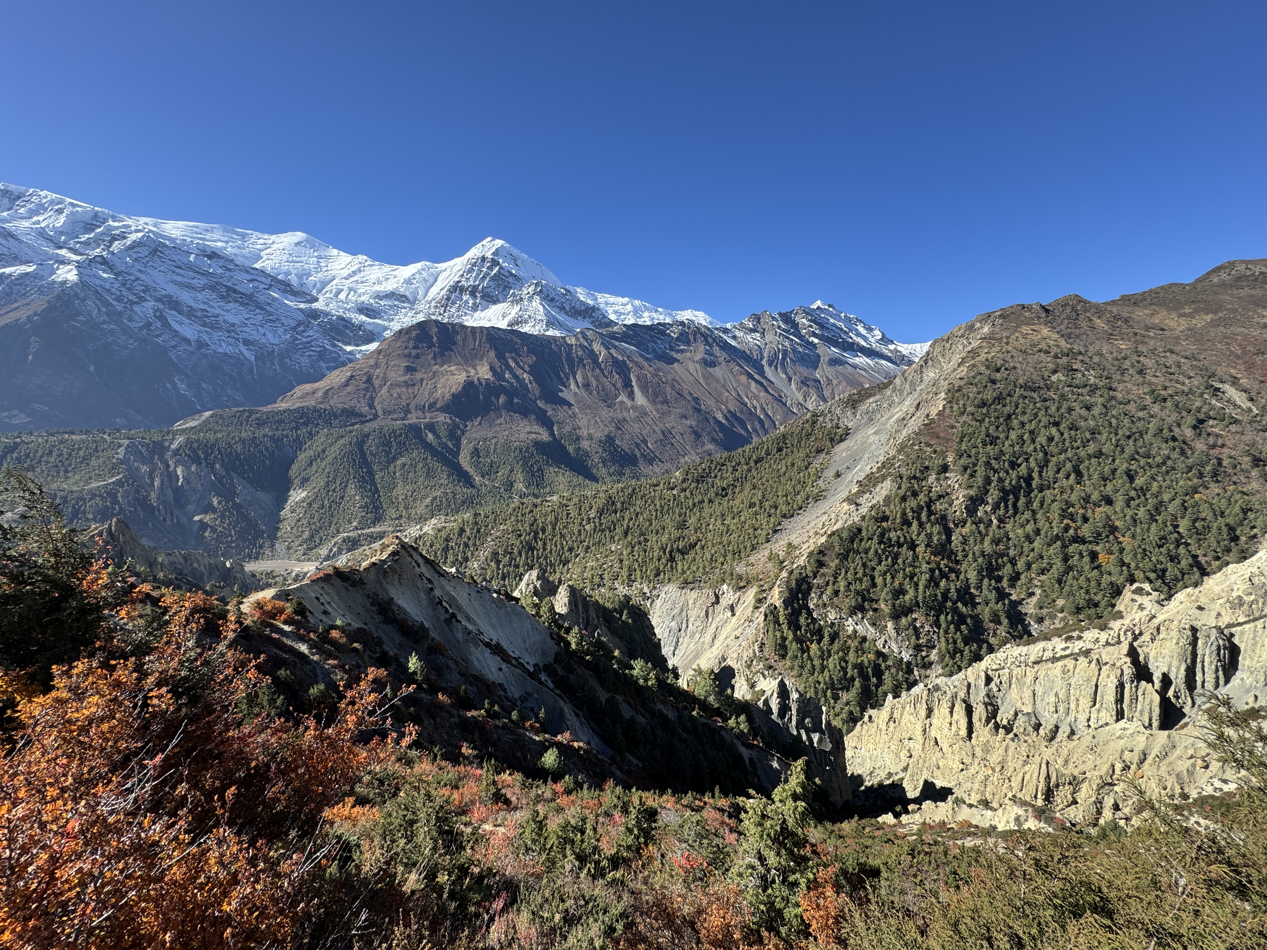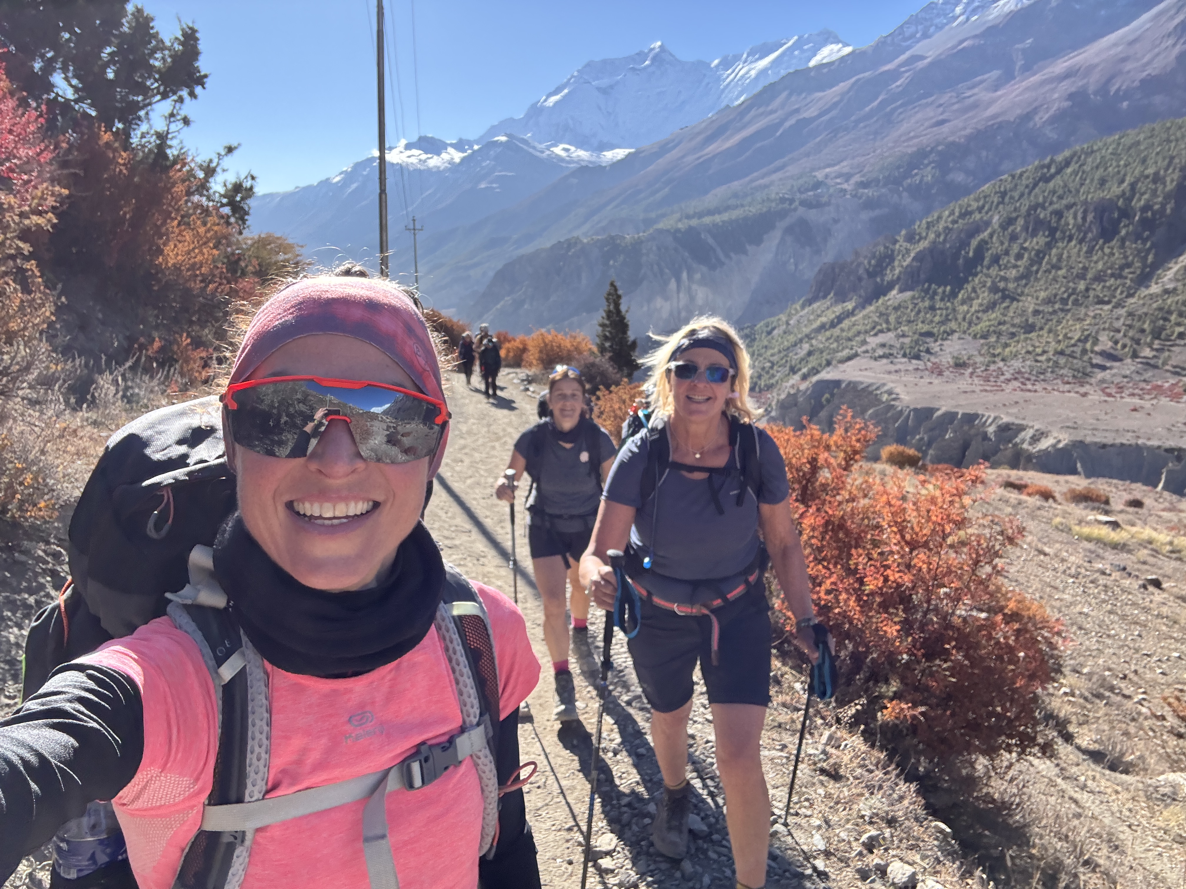 La descente est tout aussi spectaculaire, avec une vue sur la chaîne de montagnes de Dhaulagiri et Annapurna. Mais qu’est-ce qu’elle est longue ! 10 km, 1700 D-