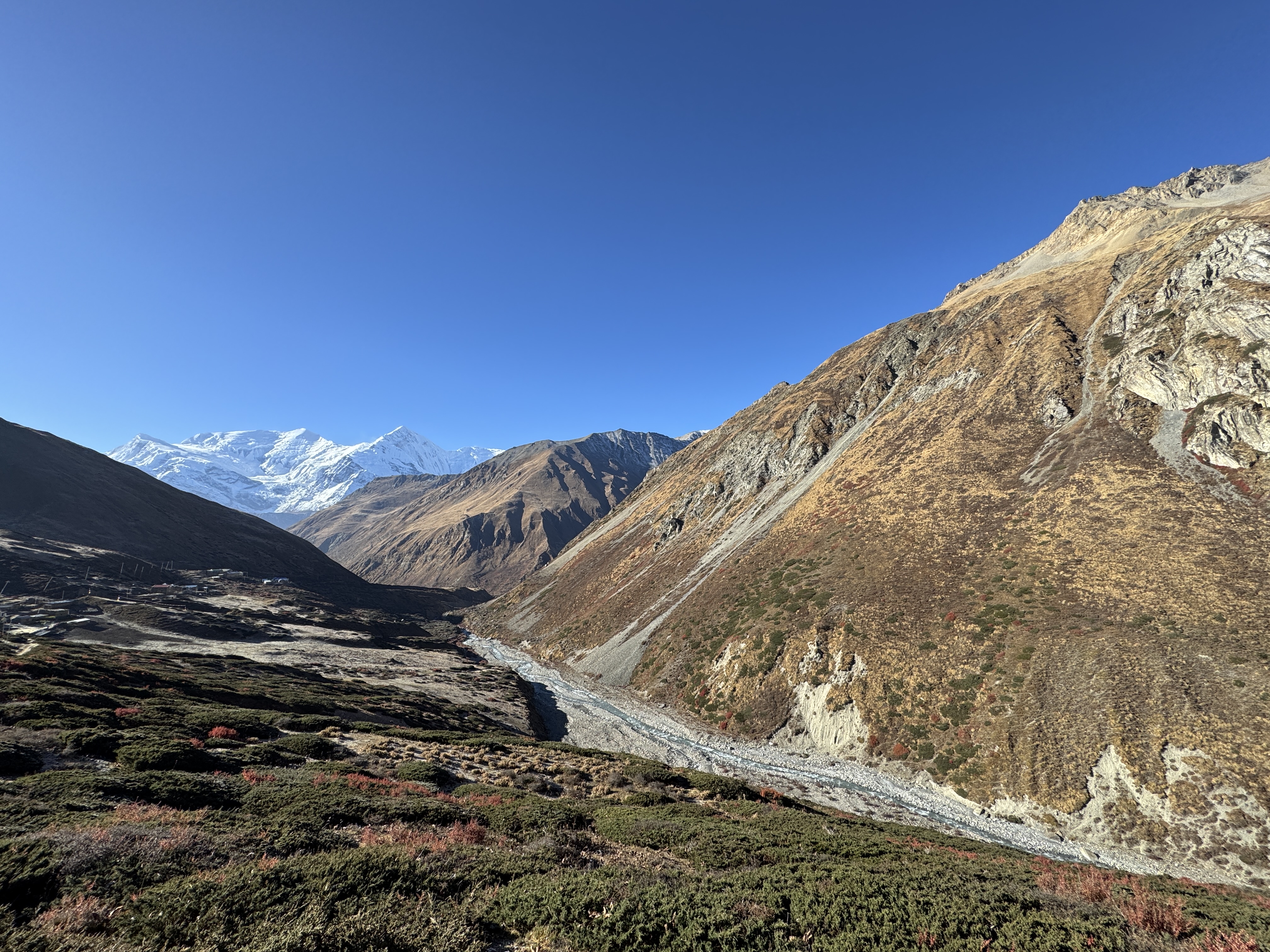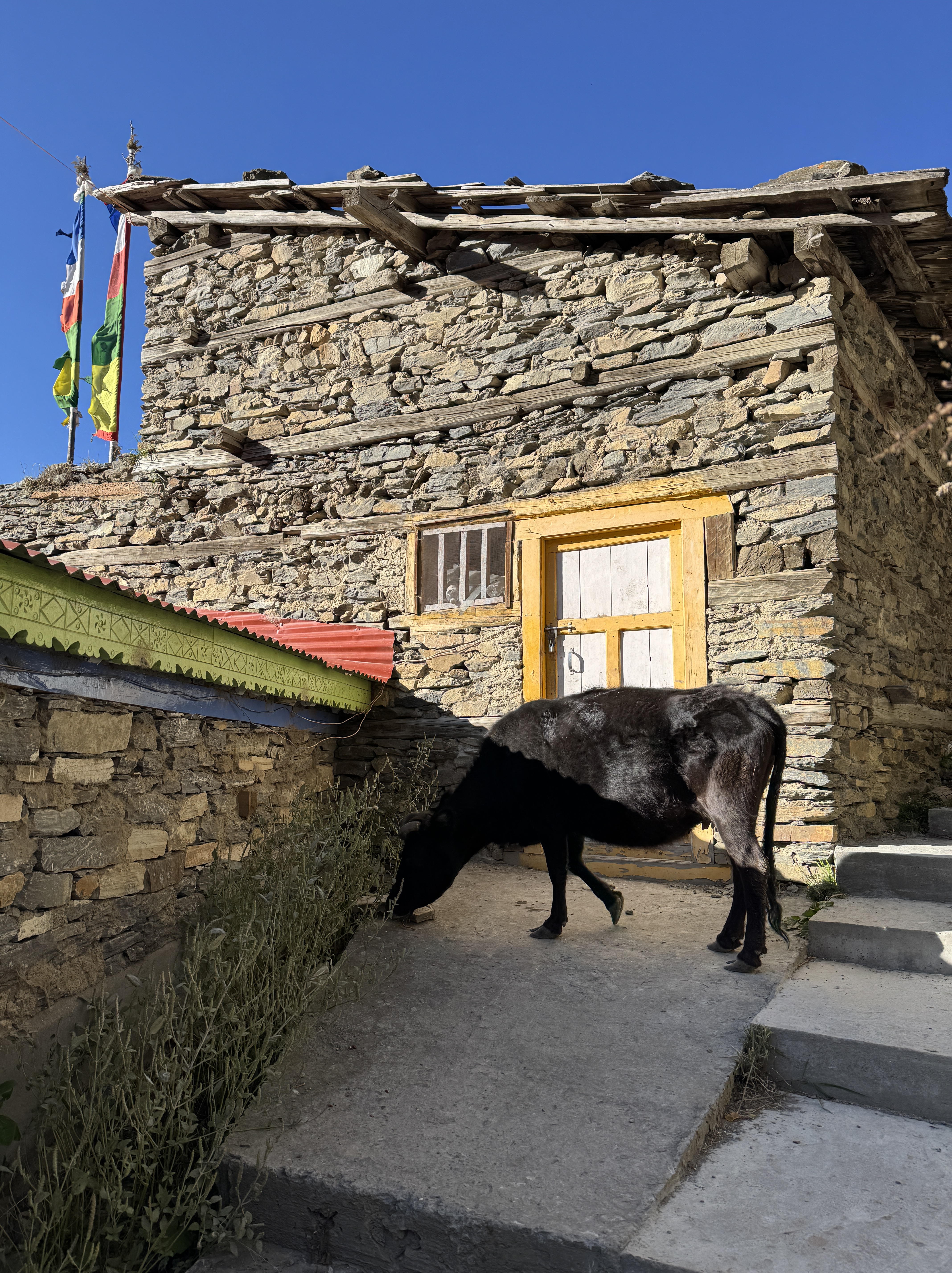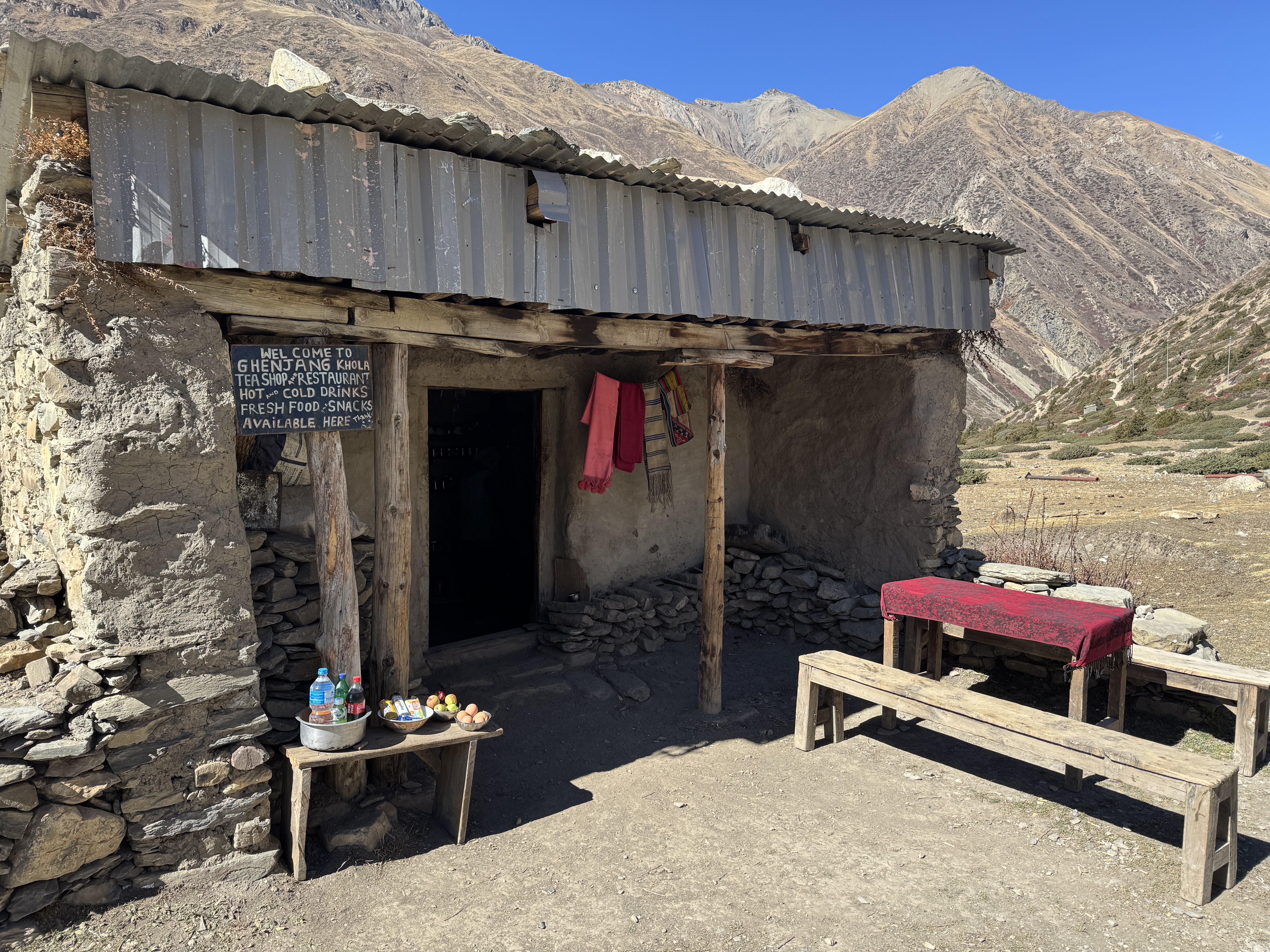 On fait une pause à Dihkur Pokhari à 3 150m pour la recharge en eau. Un village aux mille couleurs au milieu des montagnes asséchées. Dire qu’il y a quelques semaines, c’était la mousson.