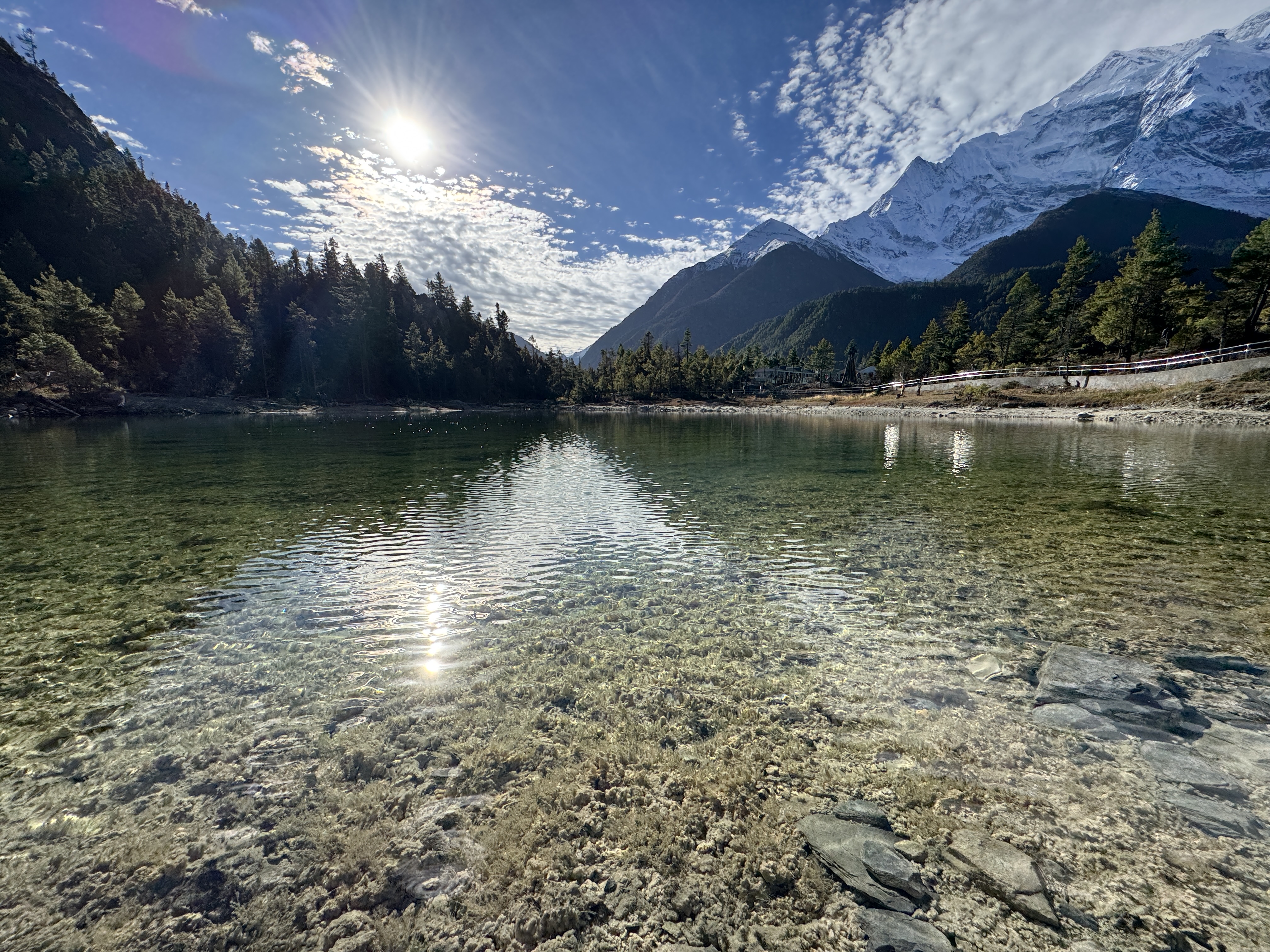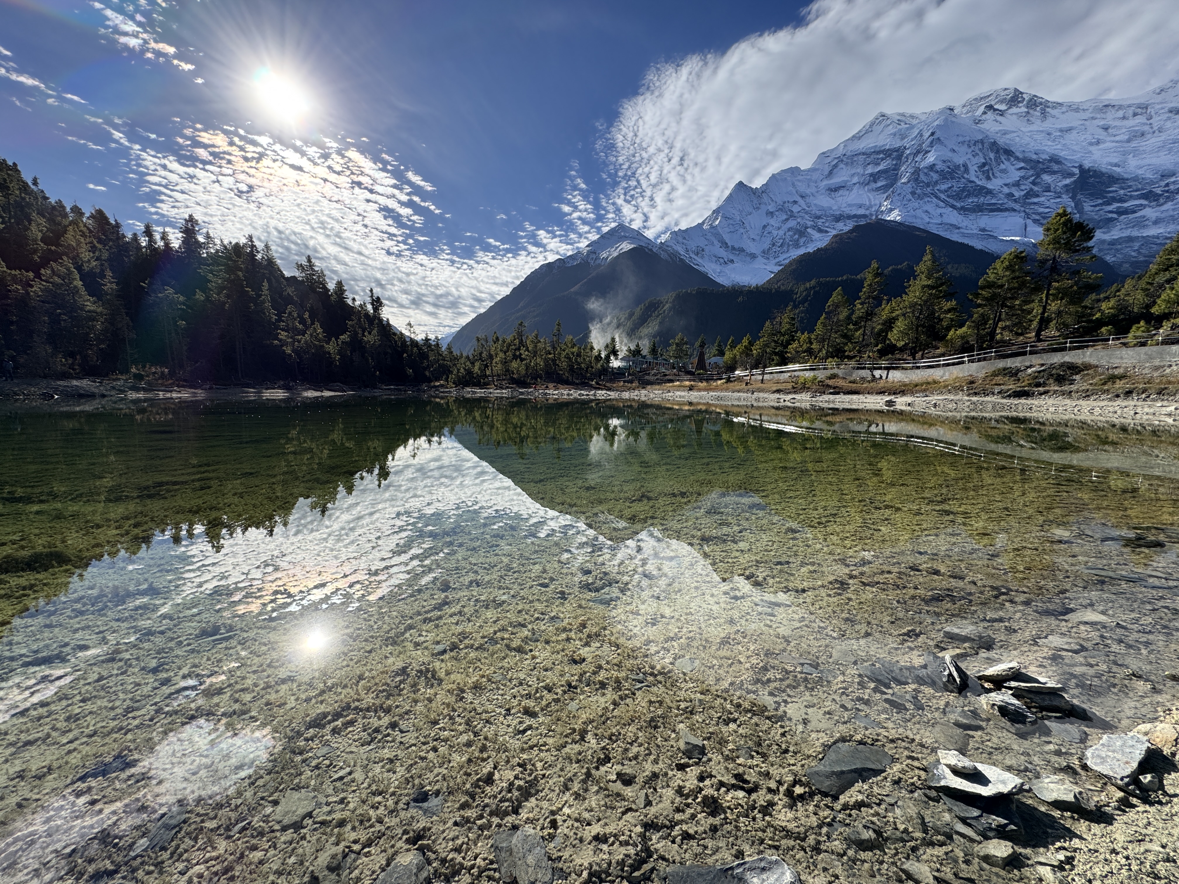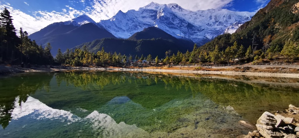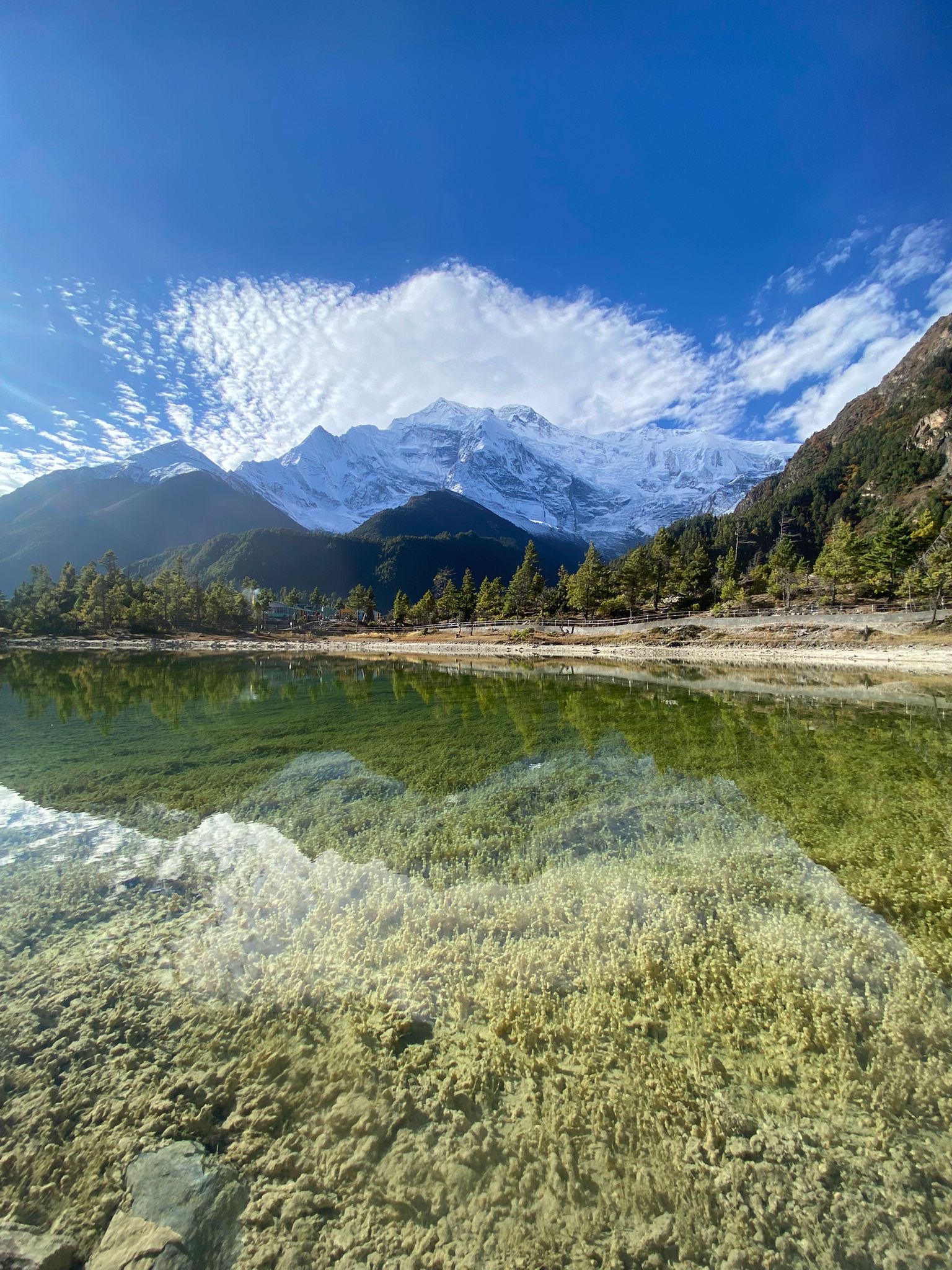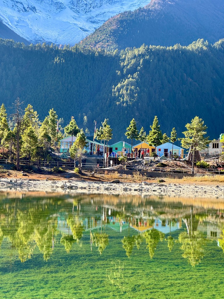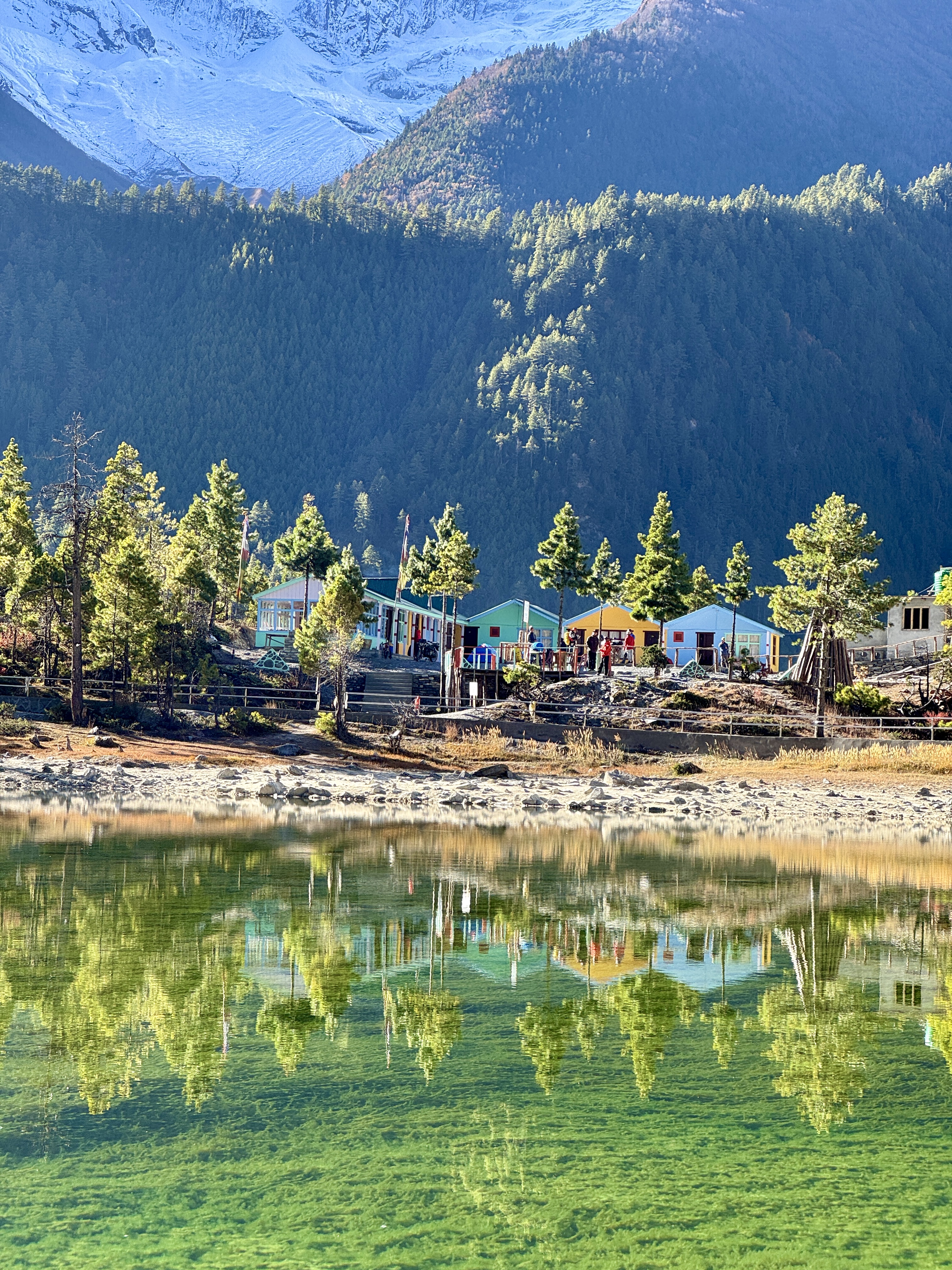 Sur le chemin, on fait une halte au Lac Vert (3 200 m car ça nous arrive de descendre aussi) dans lequel se reflète Annapurna 2.