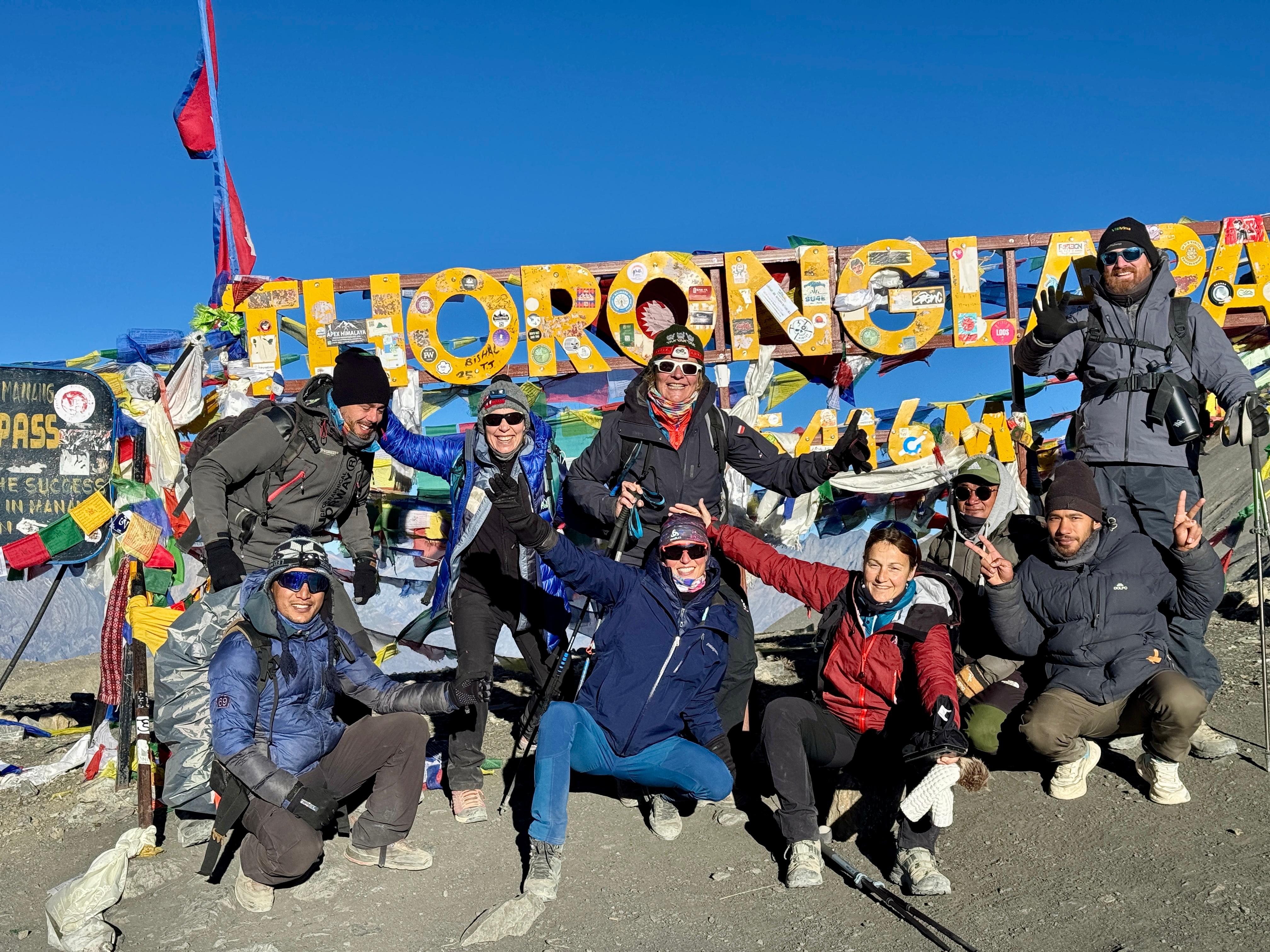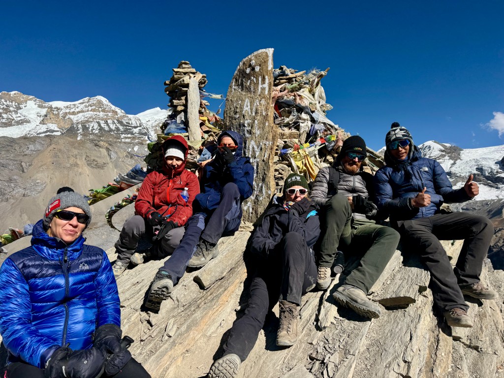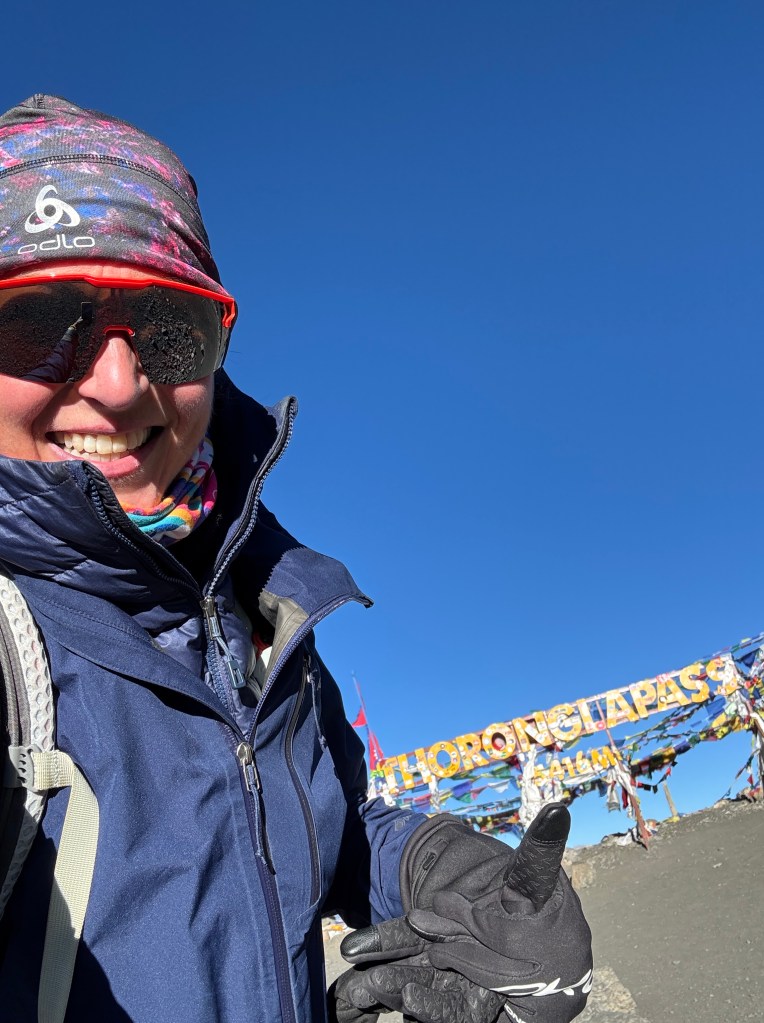 Je poursuis sur ma lancée et quel bonheur de voir le signe d’arrivée : Thorongla Pass, 5 416 m ! Il m’aura fallu 1h20 pour en venir à bout (hors arrêts attente groupe). 4,10 km, 500 D+. Putain que j’ai eu froid mais putain que c’était beau !