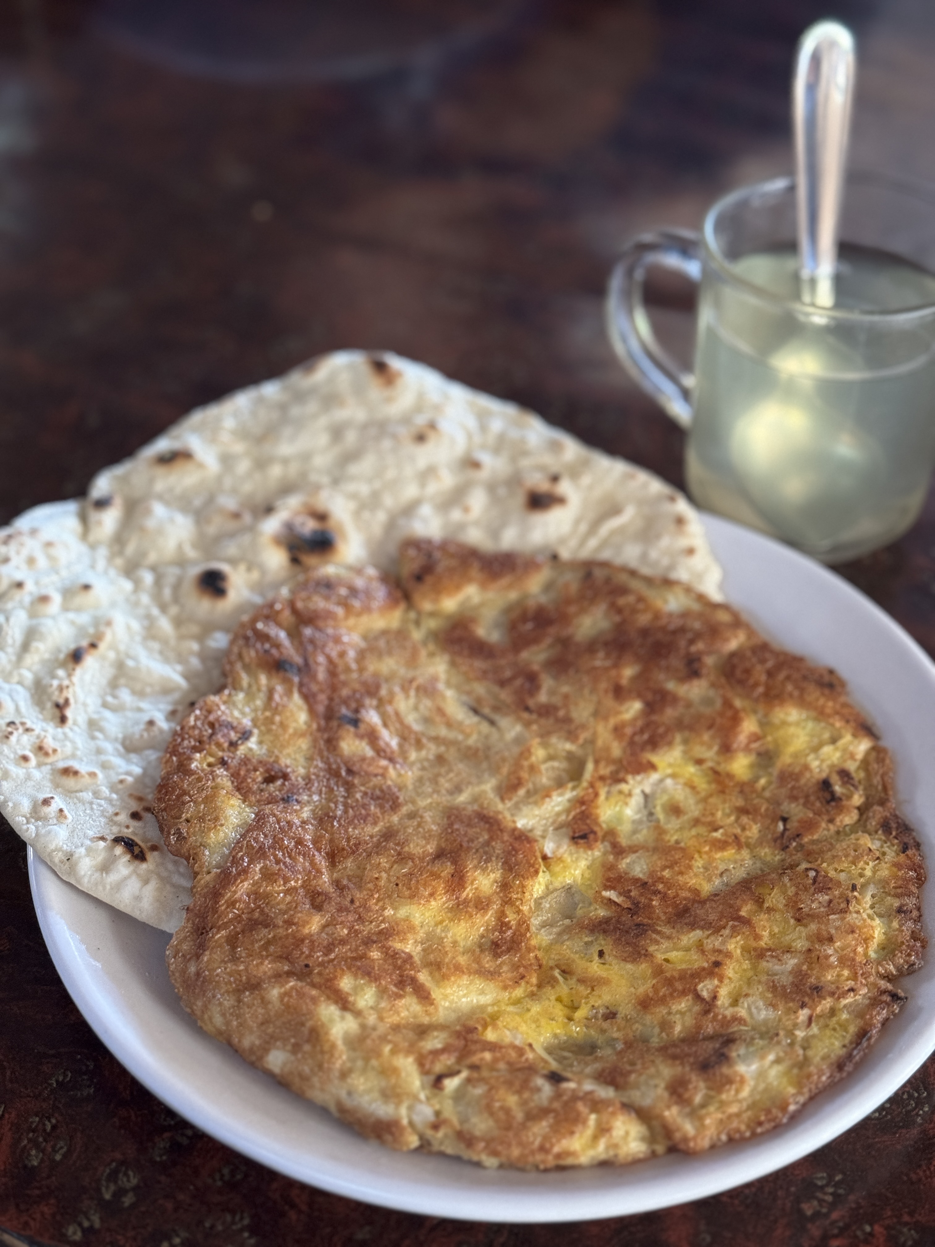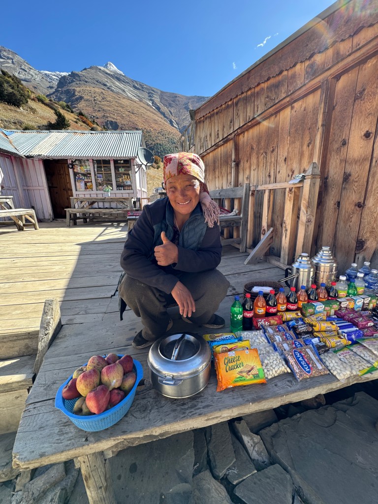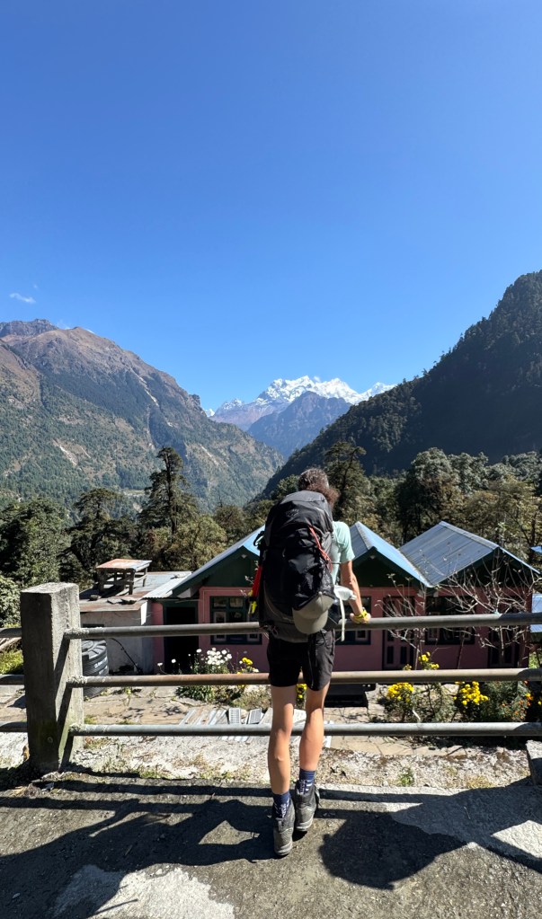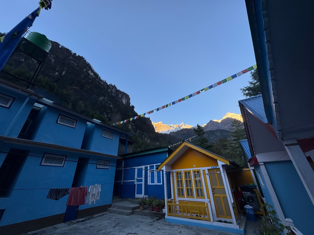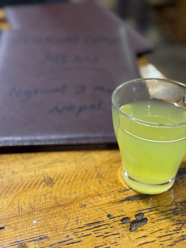 On commence par un hot lemon pour nous mettre en appétit et, sans surprise, le repas déchire. Florian m’avait recommandé le Chicken Dal Bhat, l’un des meilleurs du trek selon lui. La soupe de lentilles est onctueuse, le riz cuit à merveille, les légumes parfaitement épicés et le poulet savoureusement cuisiné. Je le déguste, enveloppée dans la chaleur du poêle, en excellente compagnie. Ces moments de convivialité comptent parmi mes préférés.