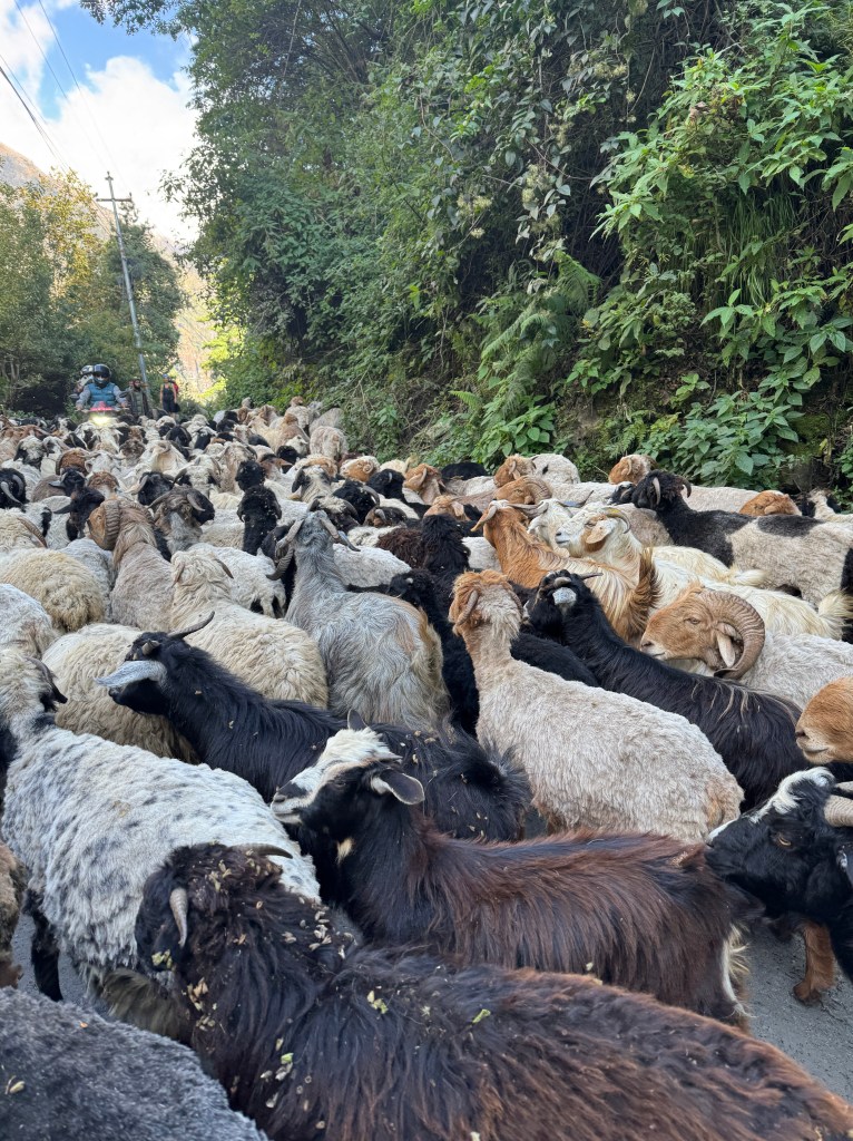 Ici, nos pas croisent un troupeau de chèvres, là des chevaux népalais. C’est dépaysant à souhait. C’est d’ailleurs toujours plus agréable quand nous quittons la piste, un peu trop encombrée de 4*4, motos et camions qui s’effacent dans la poussière.