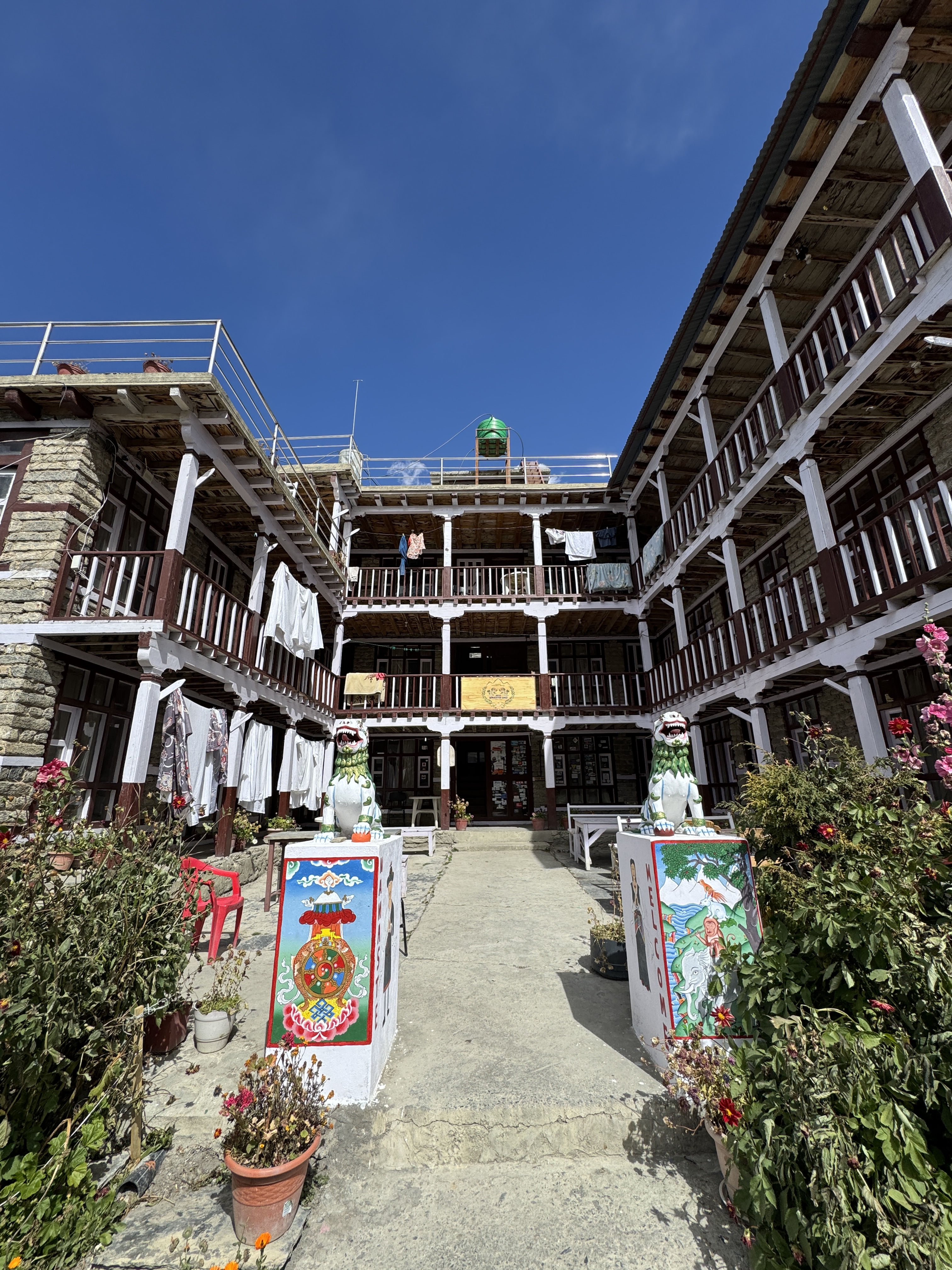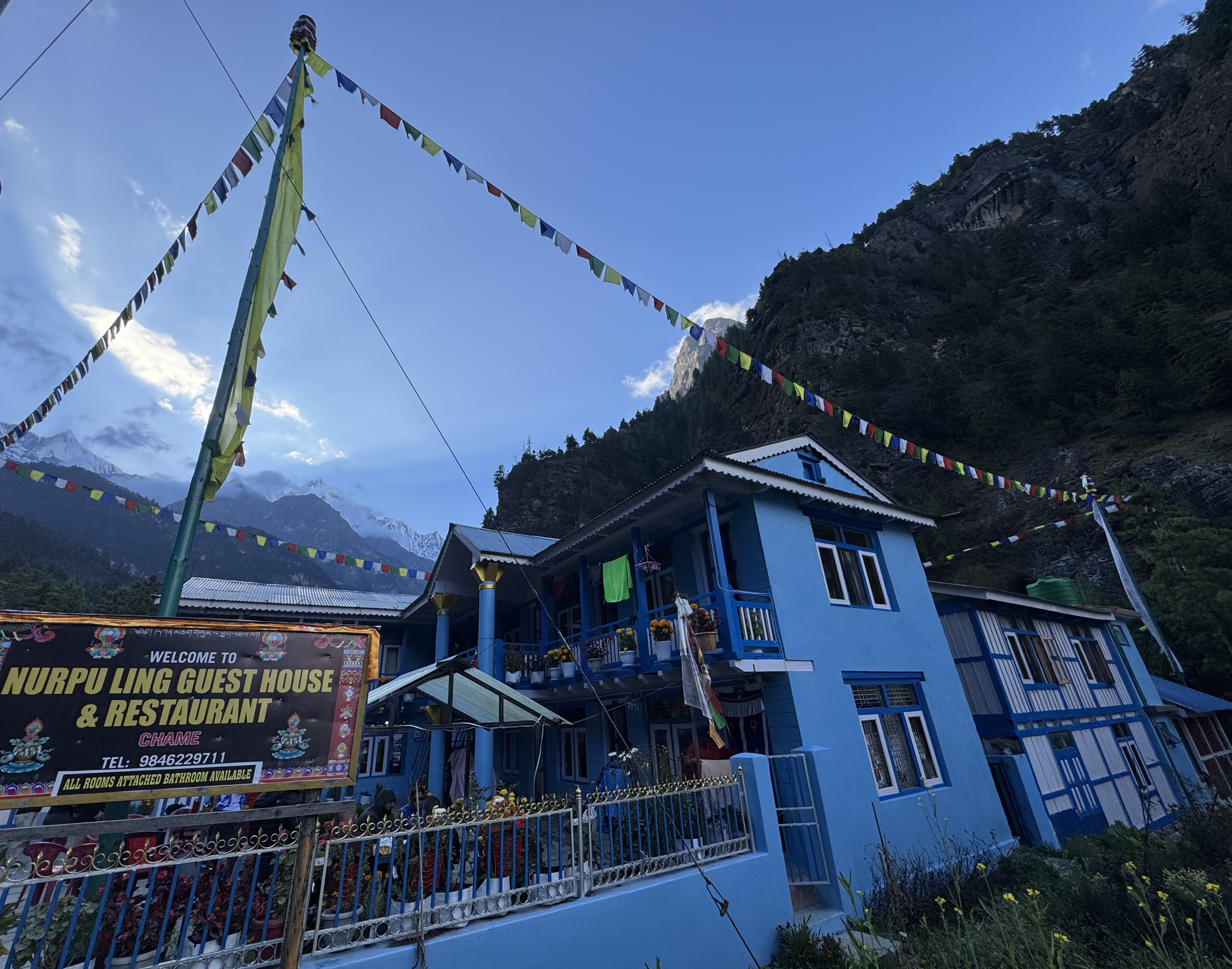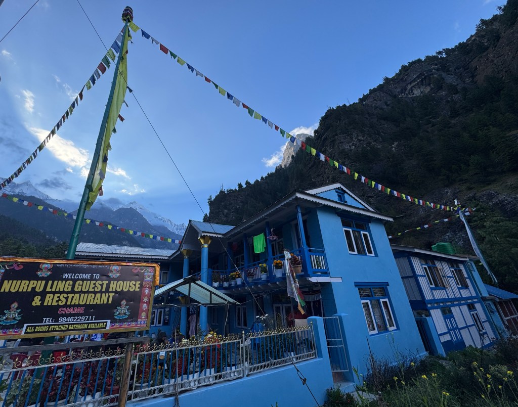 À 15h30, heure prévue, nous entrons dans Chame, planté à 2 670m. Nous prenons rapidement possession de nos chambres au Nurpu Ling Guest House. C’est coloré et plutôt bien équipé.