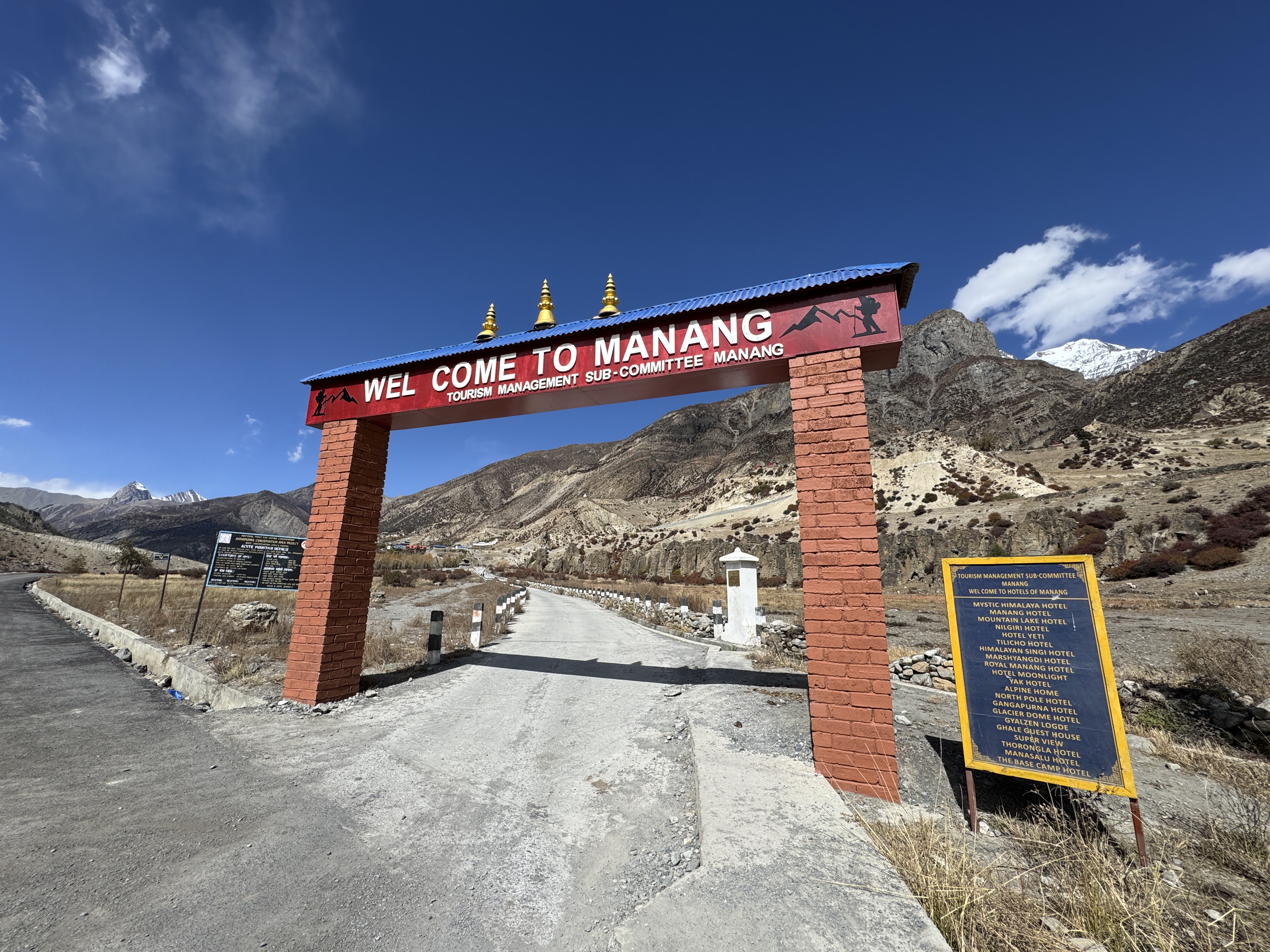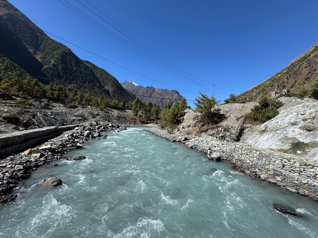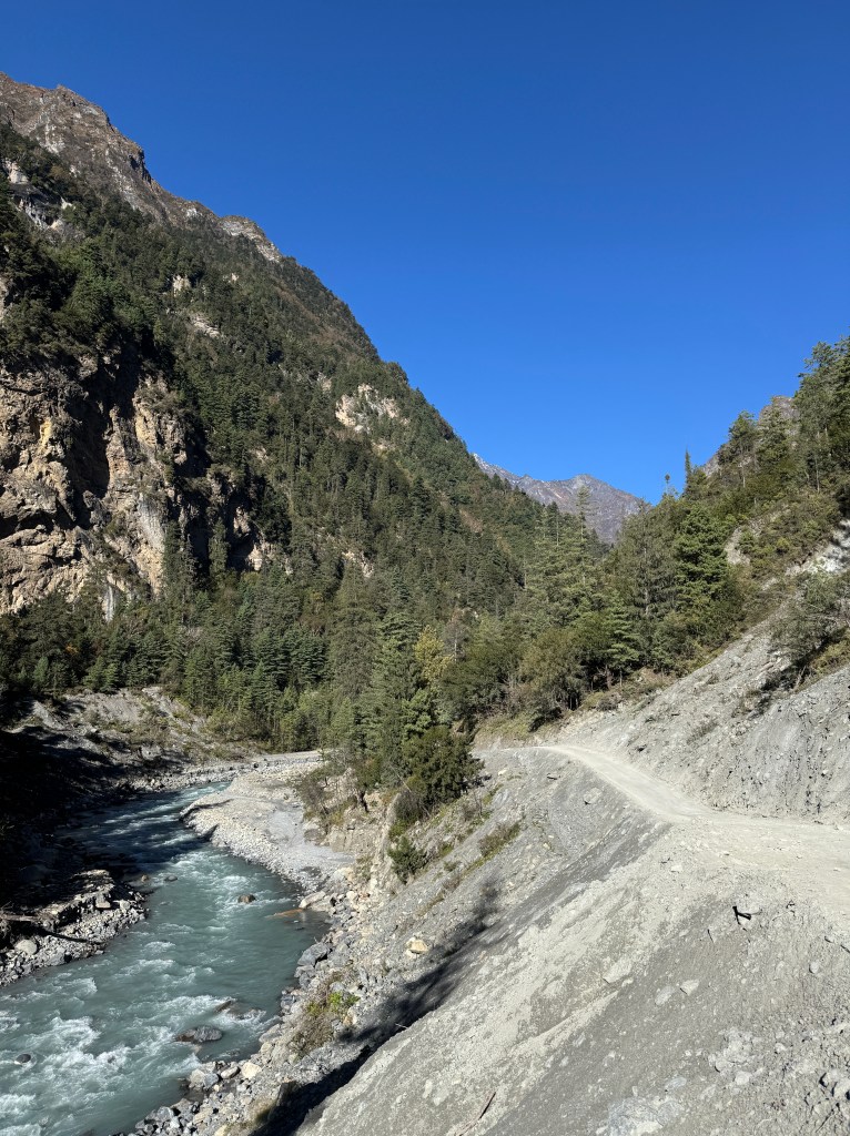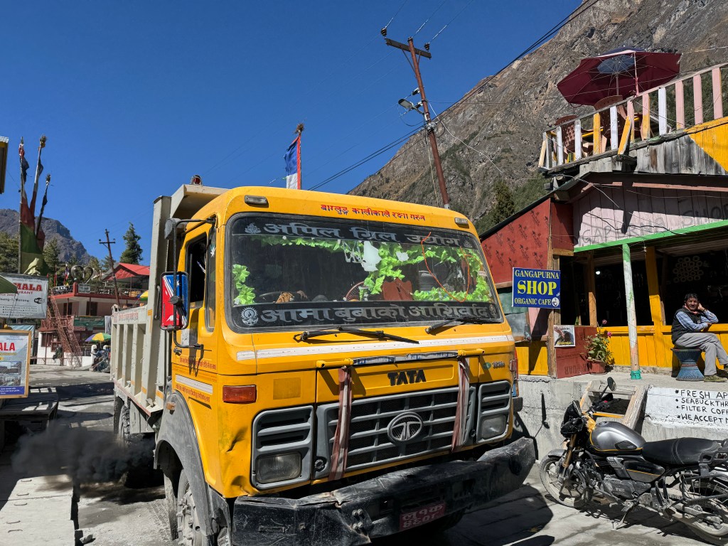 Il faut dire que la circulation est plus fluide, la route ressemble plus à une route – d’ailleurs, il y a un parapet, c’est dire ! – et le conducteur appuie sur le champignon. Nous sommes désormais dans le département de Manang (le Népal en compte 71).