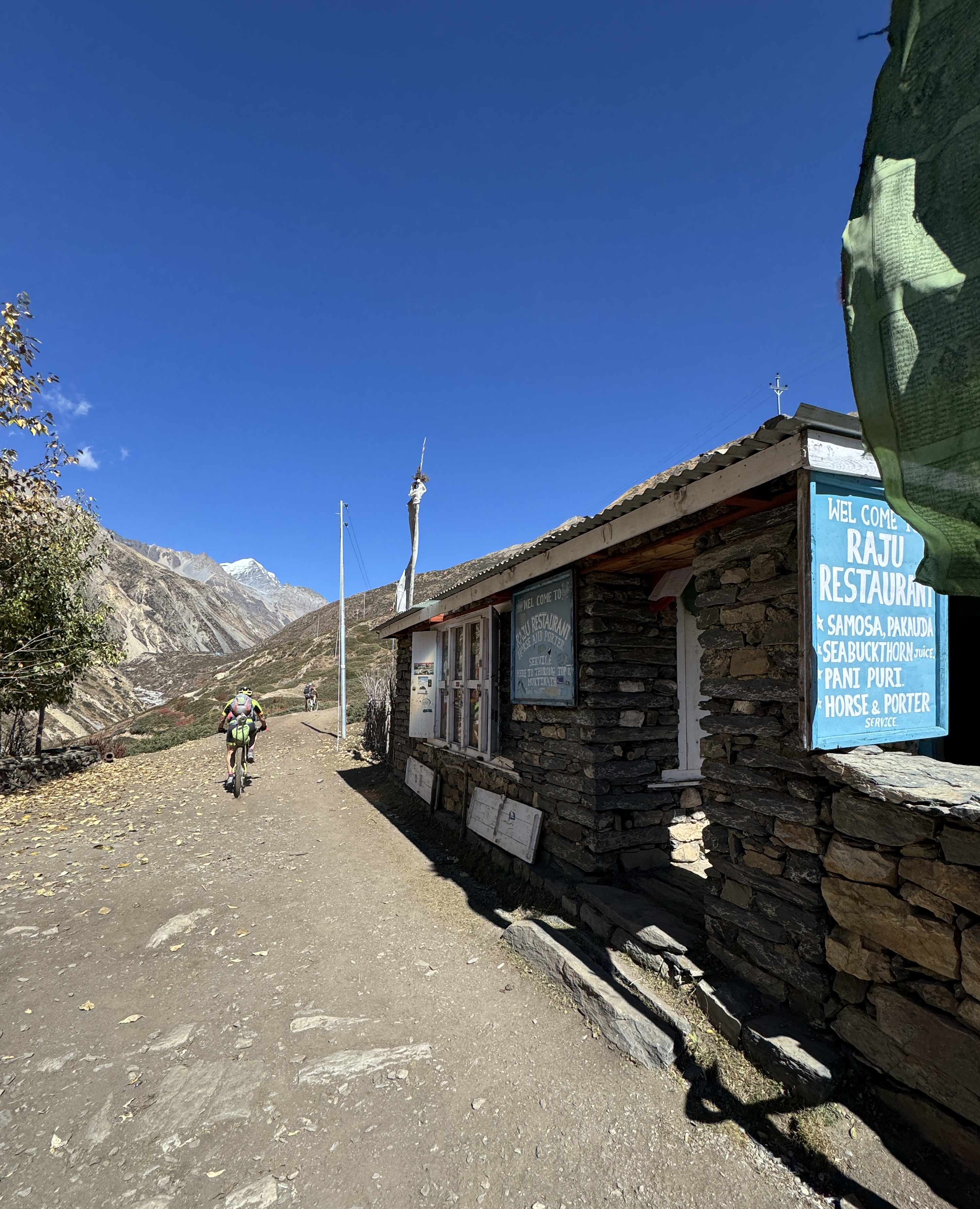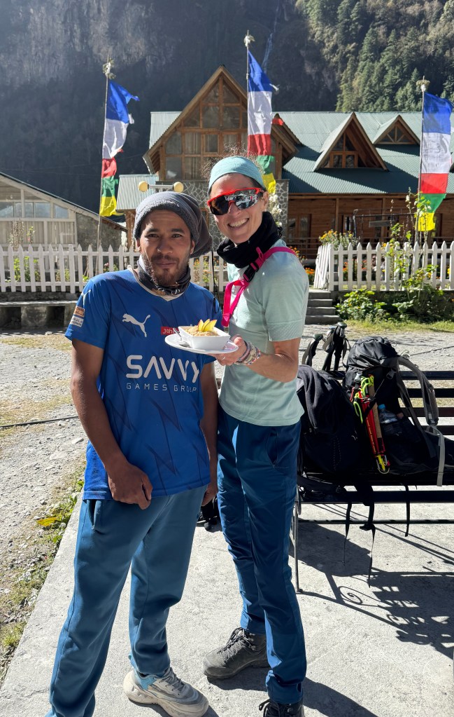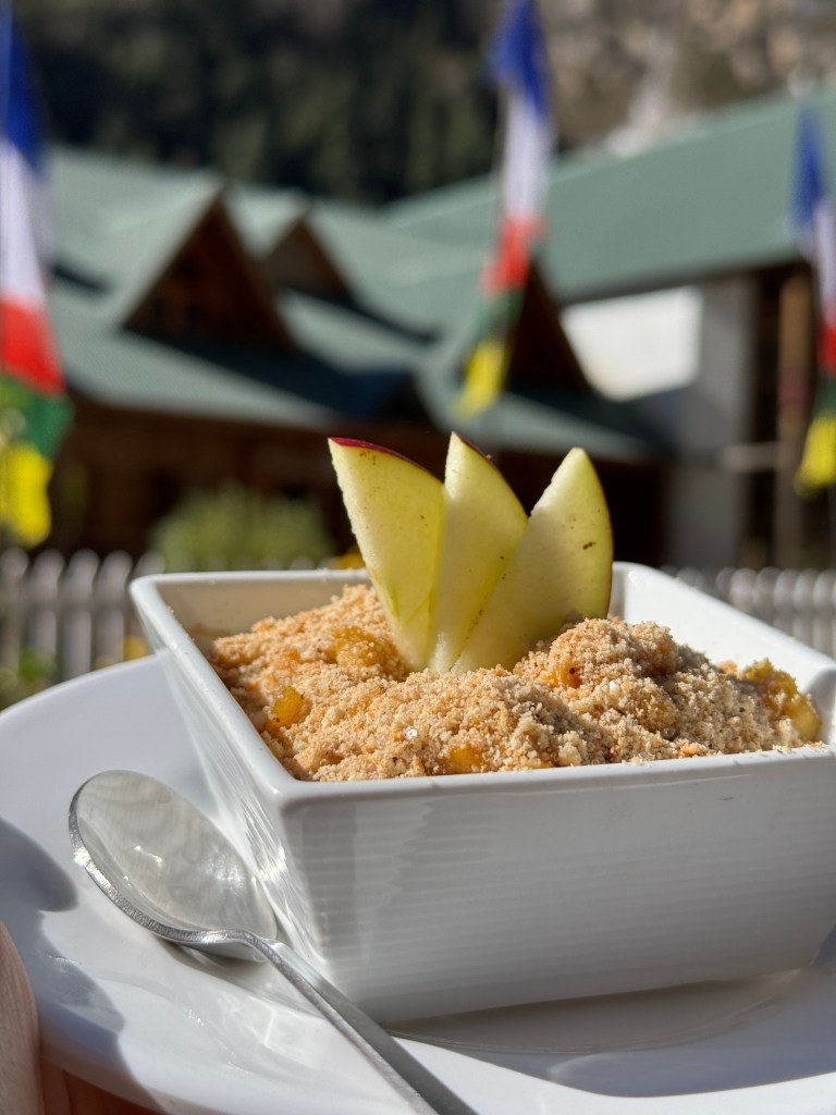 Florian nous en parlait depuis notre arrivée, il ne nous avait pas menti. Le crumble est un délice, avec un goût de cannelle qui m’accompagnera encore sur le sentier. J’ai plaisir à le partager avec mon porteur, Gopal. Pour seulement 2,50€.