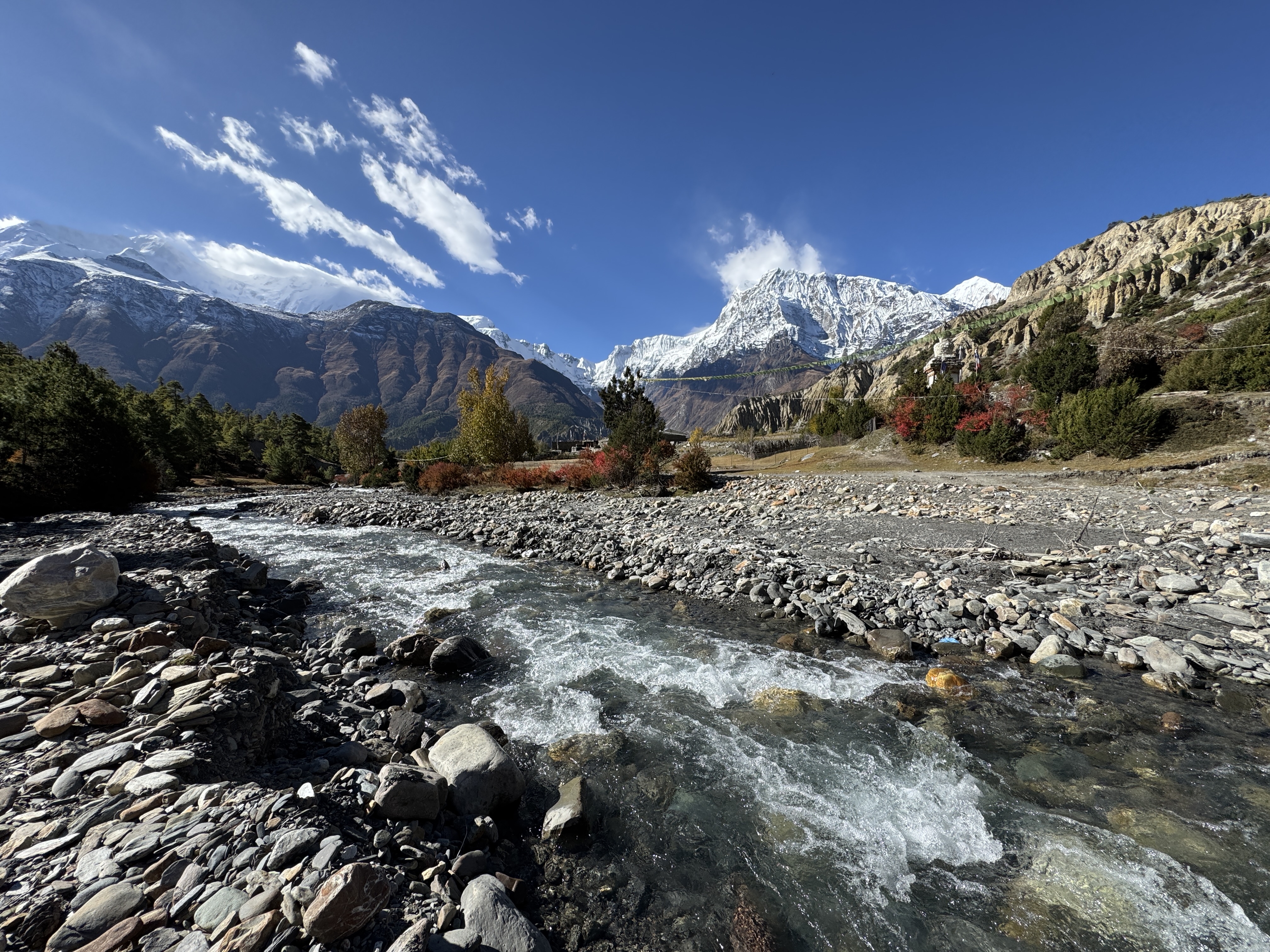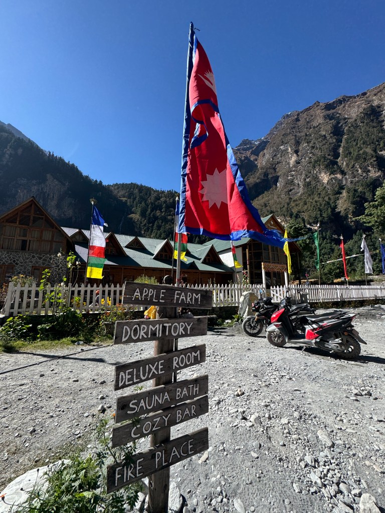 Au bout d’un peu moins de deux heures de marche, nous commençons à apercevoir des vergers de pommes, plantés à l’entrée de Bhratang, au cœur de la Manang Valley, à 2 850m d’altitude.