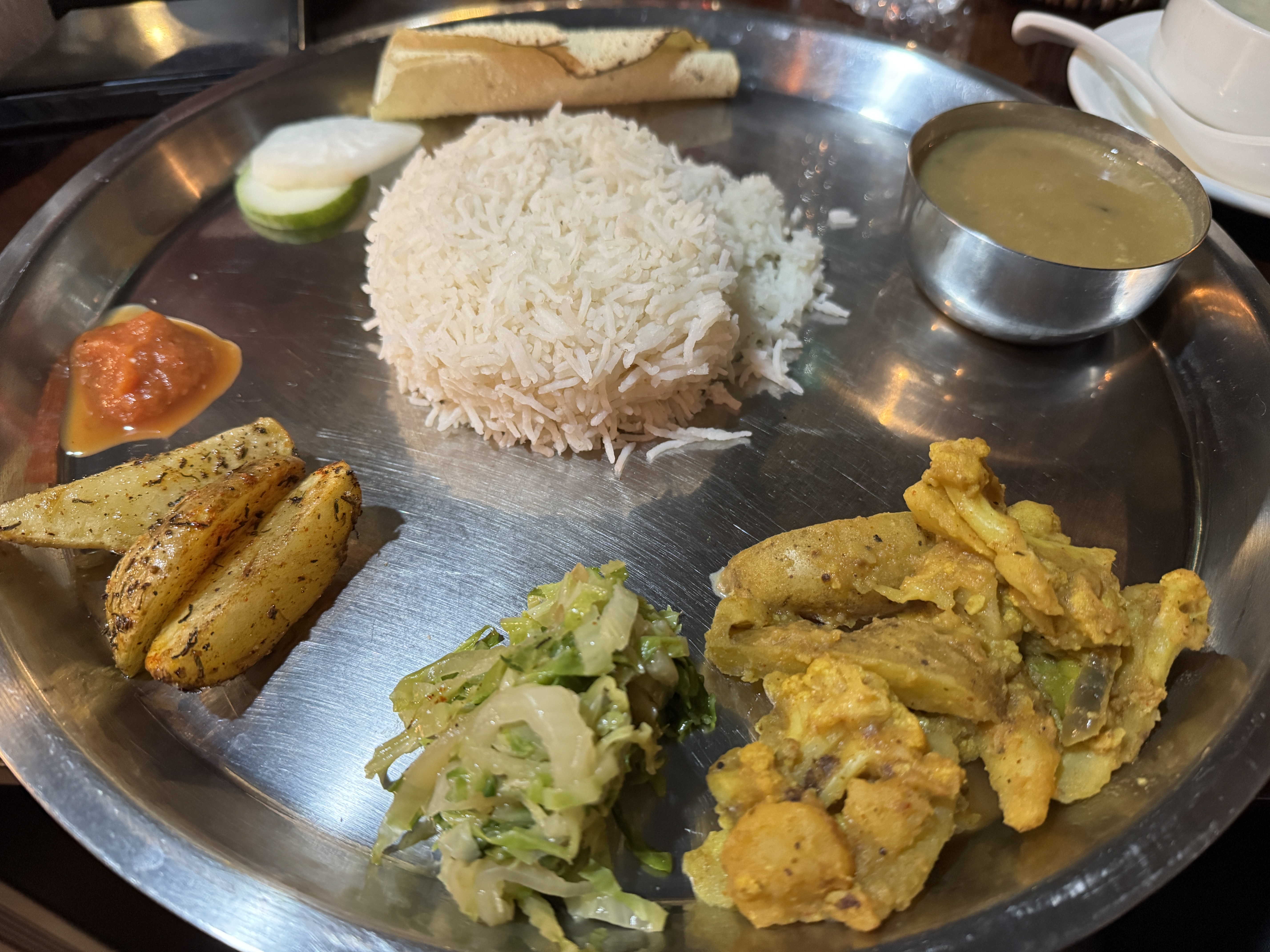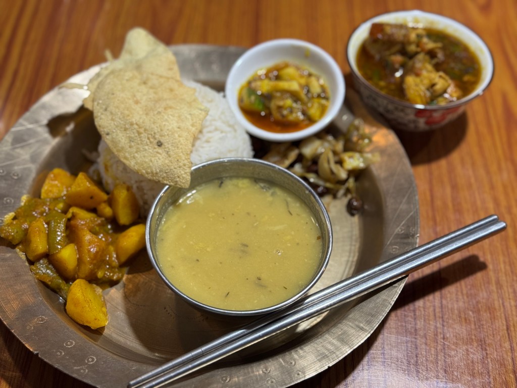 La creamy veggie soup est délicieuse, de même que le Thali Nepali veggie (équivalent du Dal Bhat).