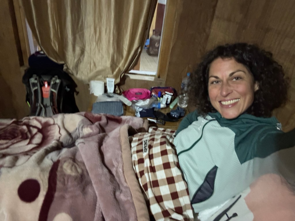 À 5h30, je me réveille. Finalement, dans une chambre à -6 degrés, je n’ai pas si mal dormi, bien emmitouflée dans mon sac à viande, mes deux couvertures, ma cagoule, ma polaire et mes gants.