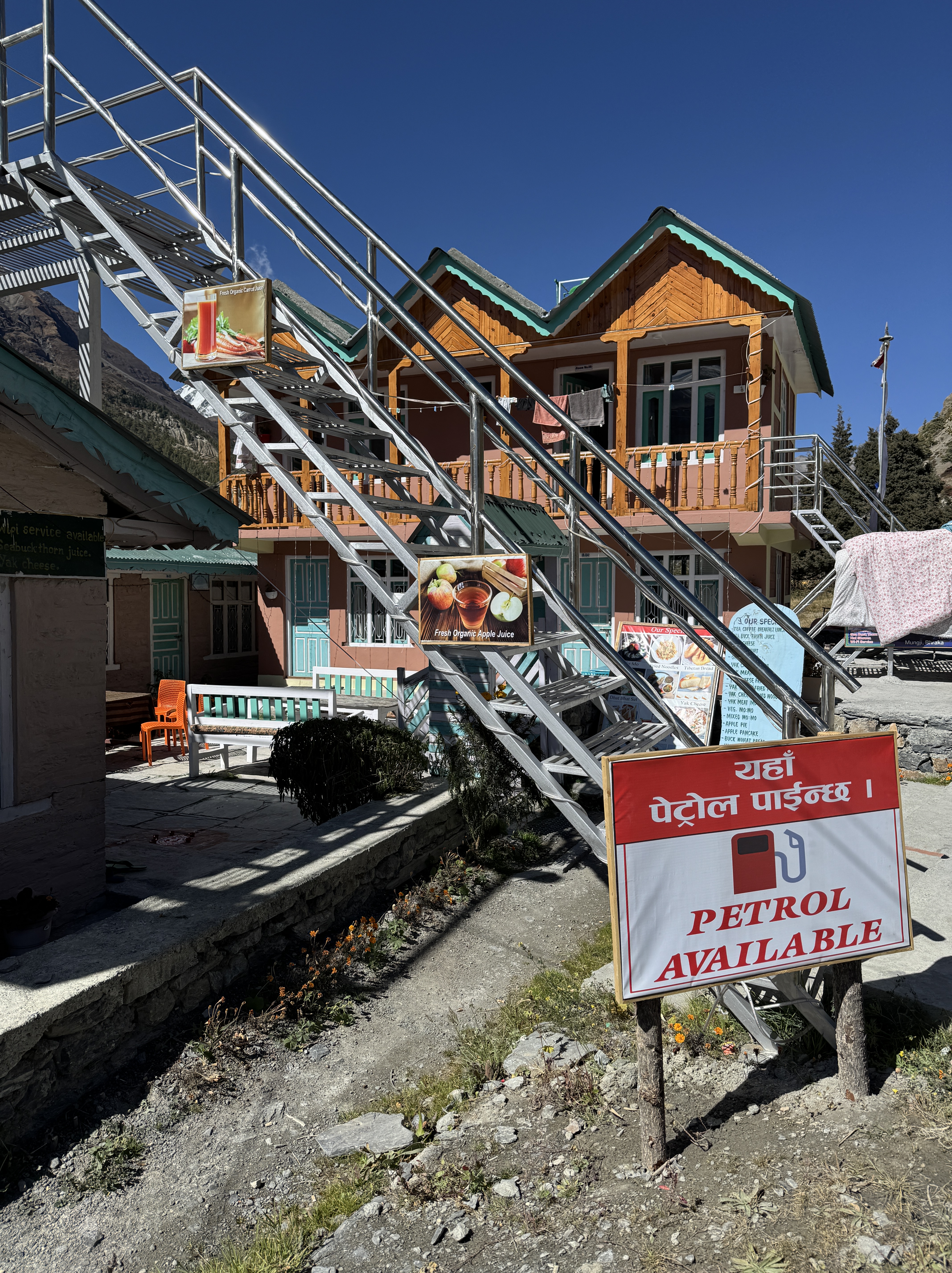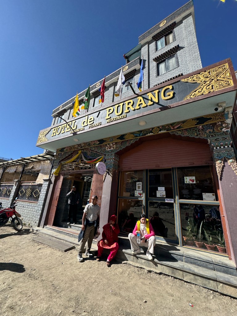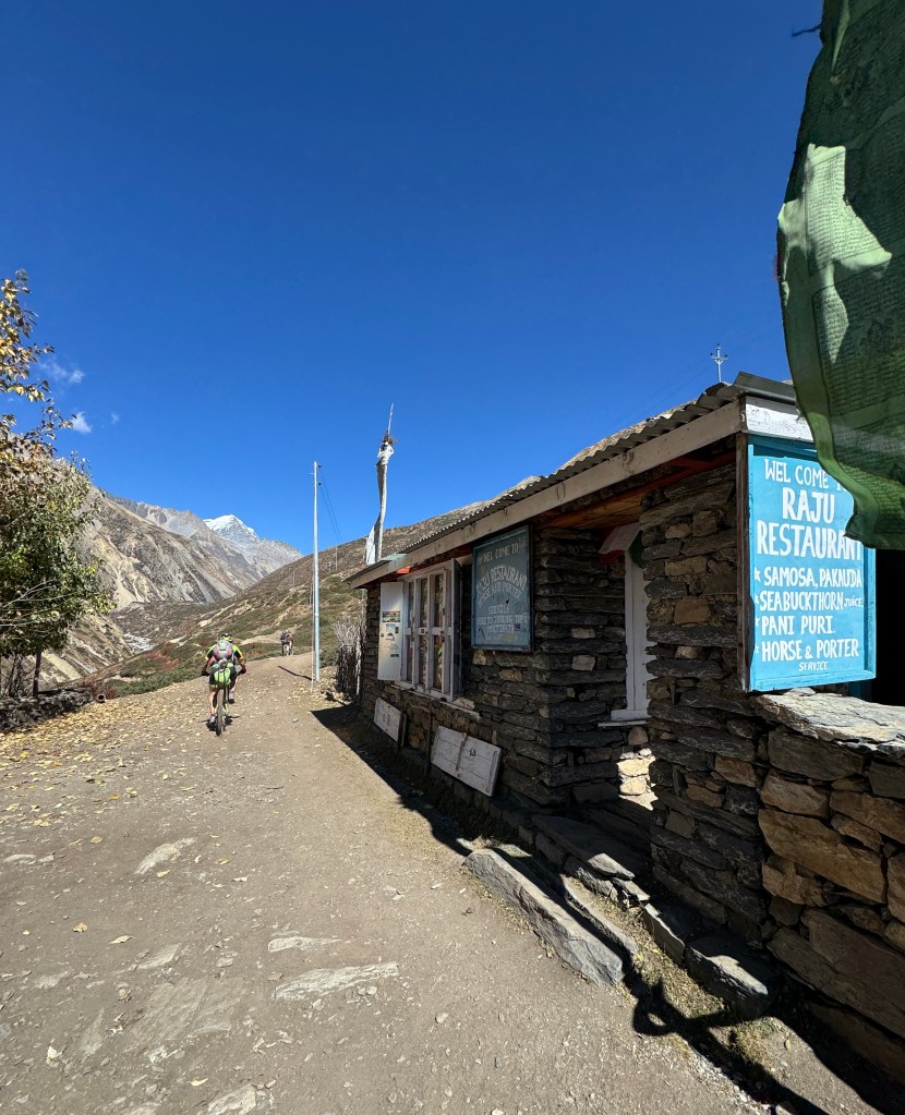 Bref, revenons à notre récit un peu moins zinzin. Vers 10h30, nous marquons une pause à l’Hotel Yak Gawa and Restaurant dans le « comté » de Mustang. Je tombe enfin les couches, yeah ! Et je savoure un délicieux organic rhubarb juice. Sous un soleil toujours flamboyant, qui ne nous aura pas quittés de tout le trek, c’est merveilleux !!